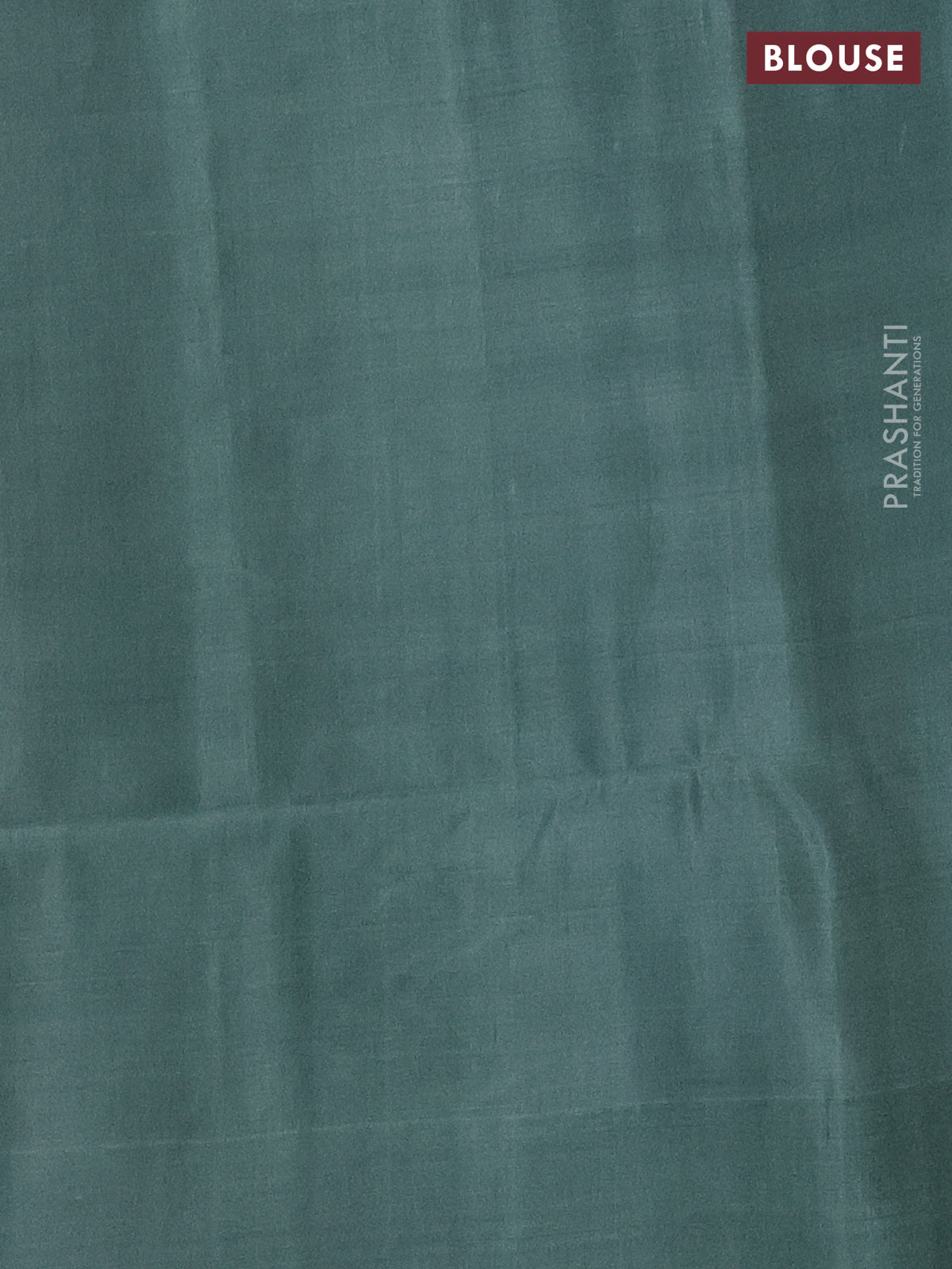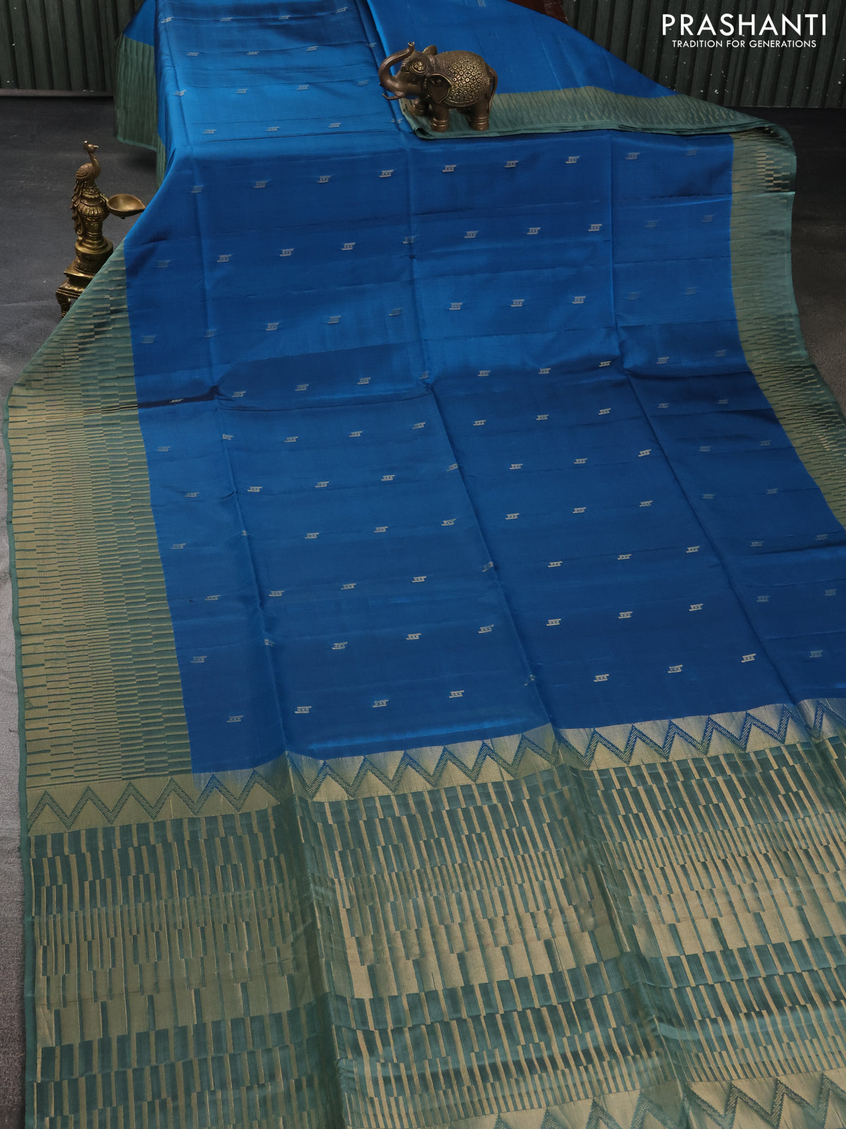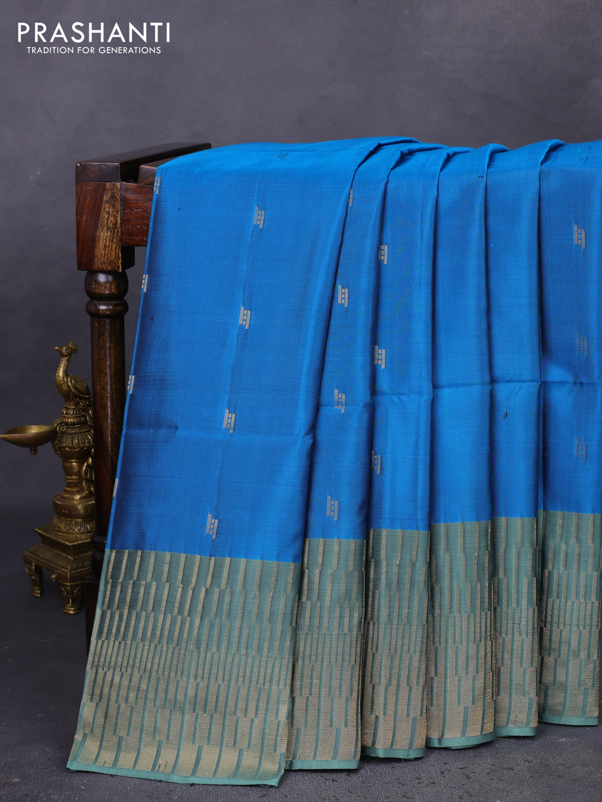 Kanchipuram soft silk saree cs blue and pastel green with zari woven buttas and temple design zari woven border