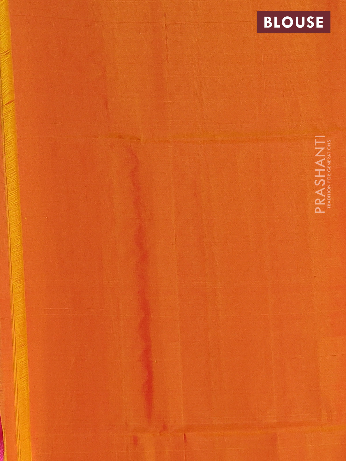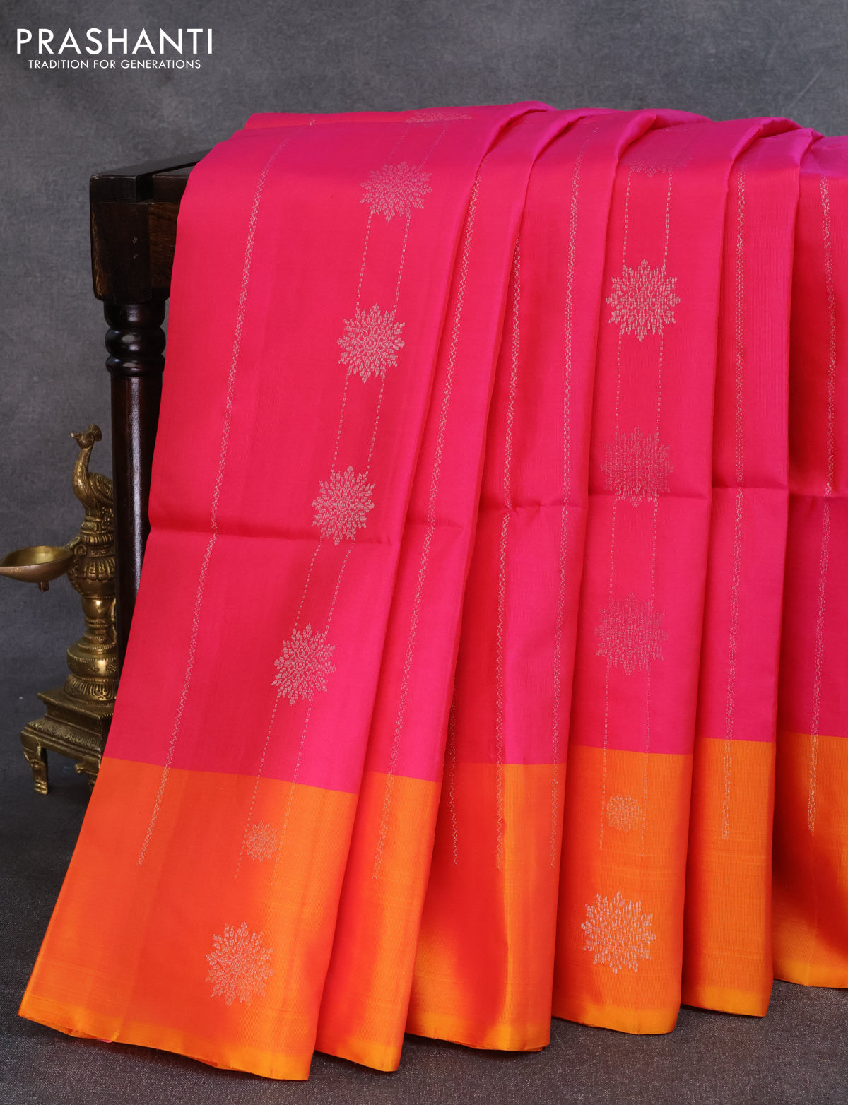 Kanchipuram soft silk saree pink and dual shade of mustard yellow with allover silver zari weaves and zari woven butta border