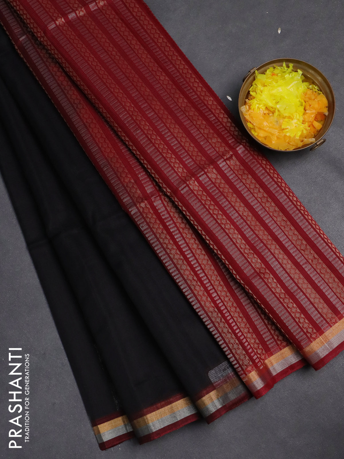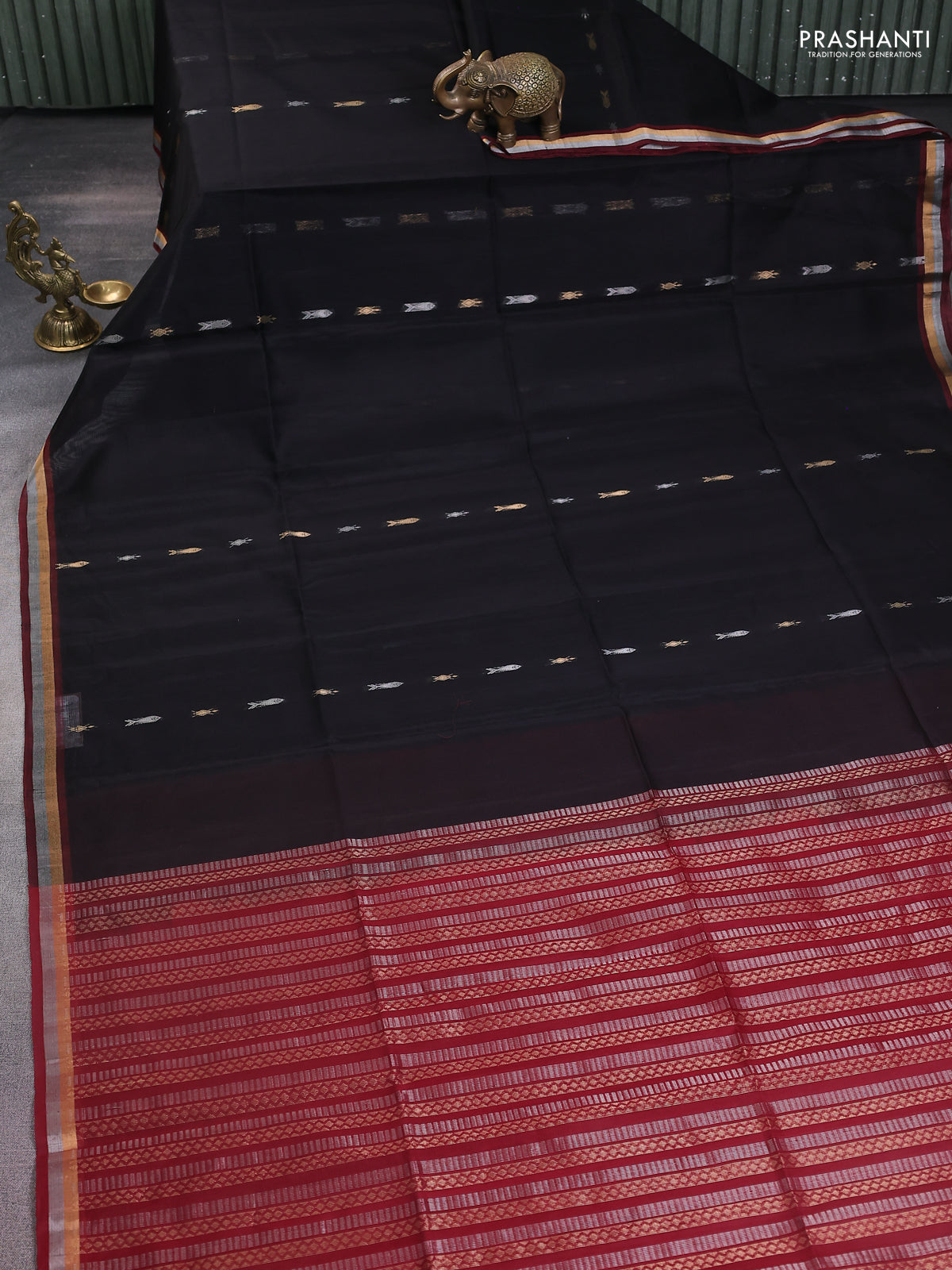 Kora silk cotton saree black and maroon with silver & gold zari woven buttas and zari woven border