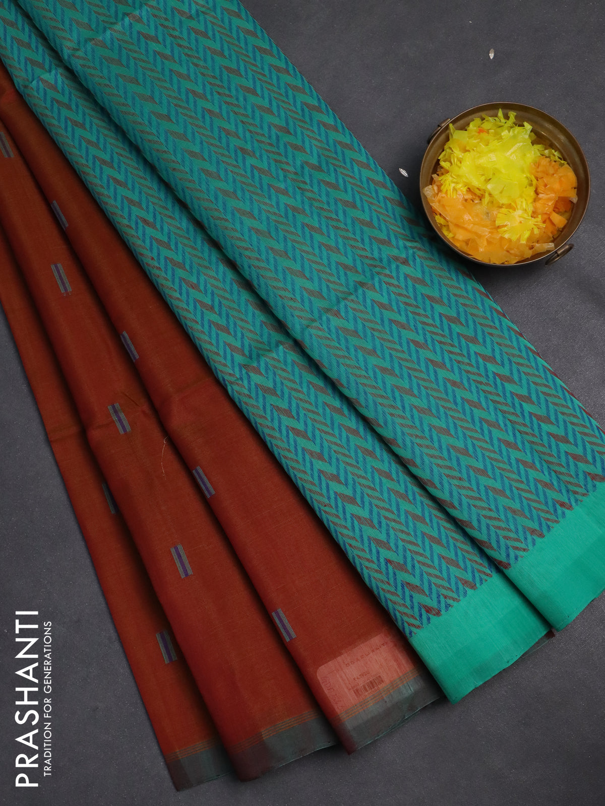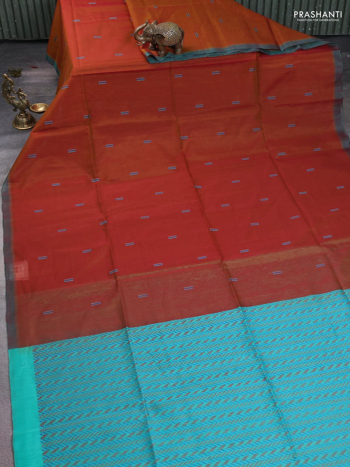 Kora silk cotton saree dual shade of honey and teal green with thread woven buttas and simple border