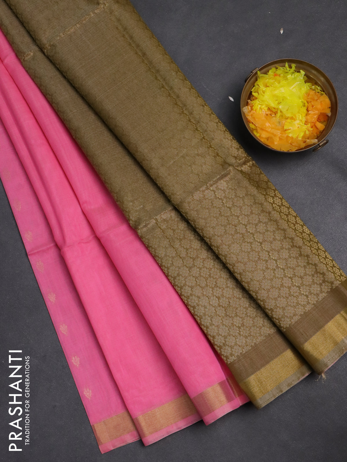Kora silk cotton saree light pink and elaichi green with thread & zari woven buttas and zari woven border