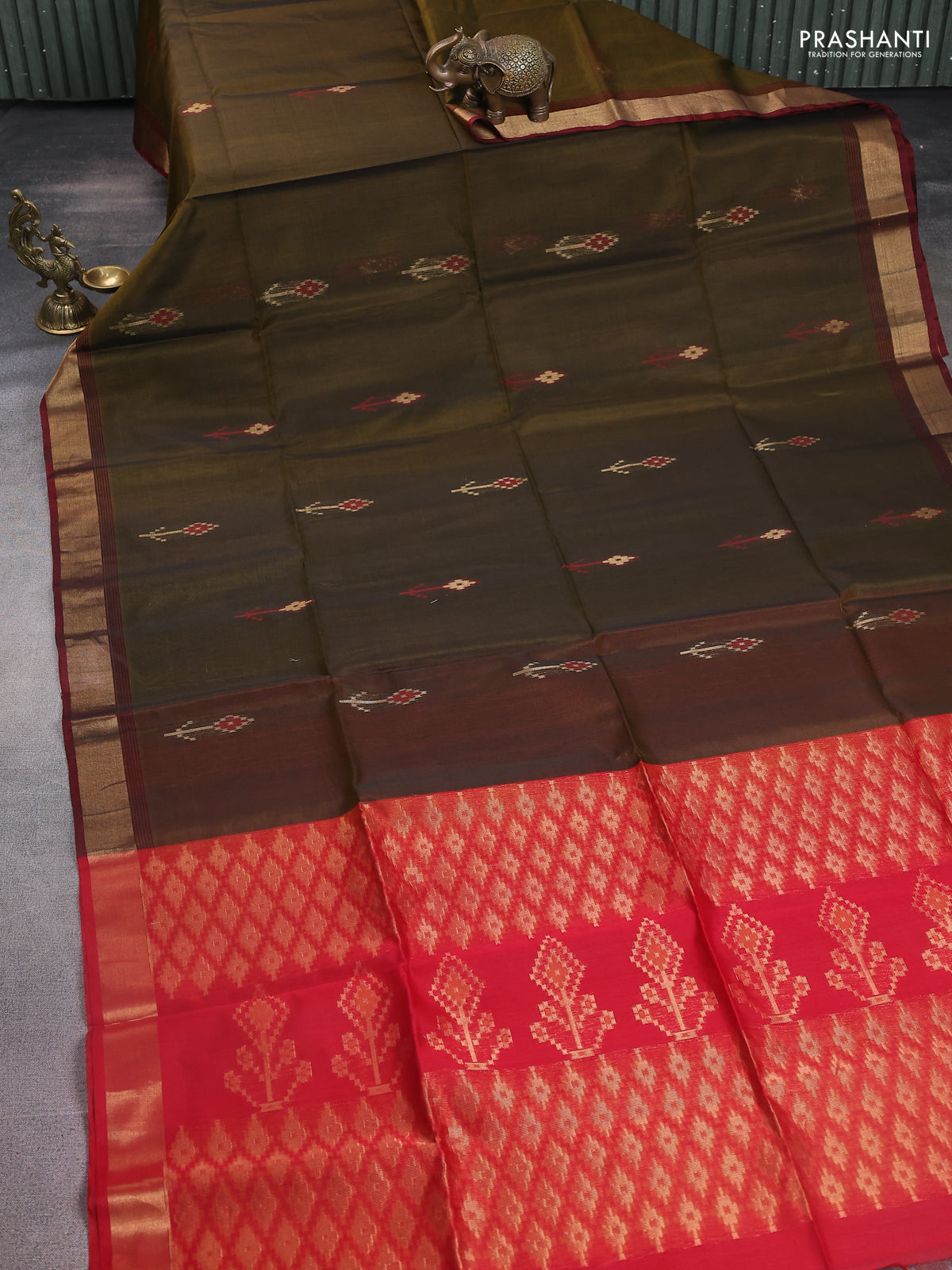 Kora silk cotton saree mehendi green and red with zari woven buttas and zari woven border