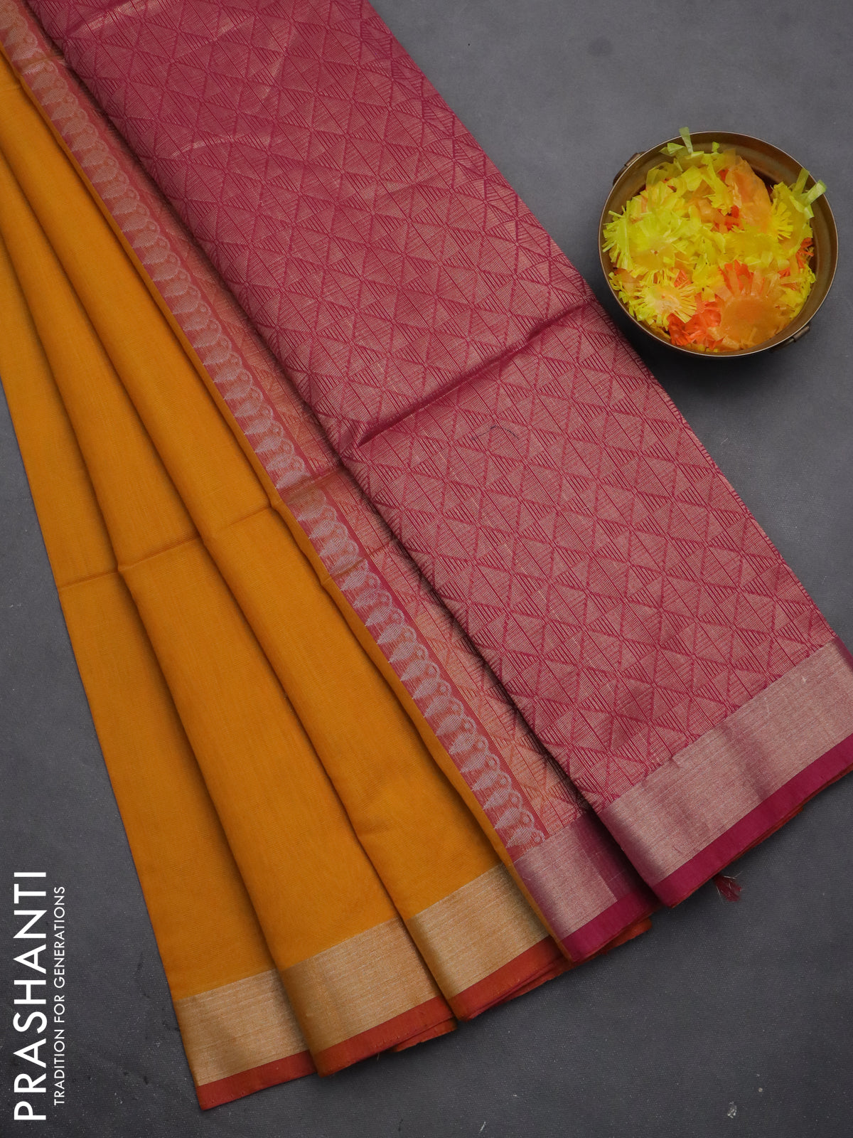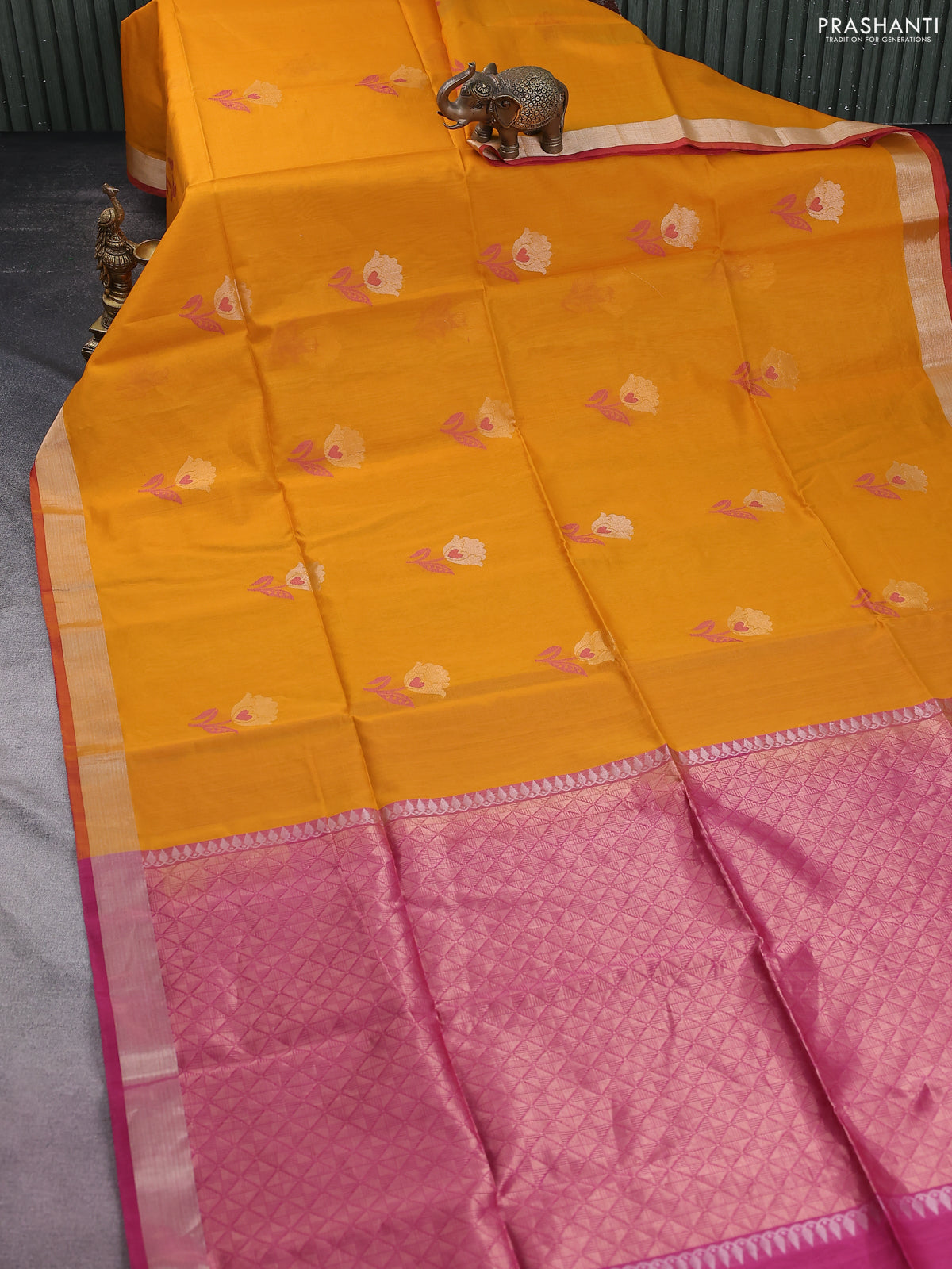 Kora silk cotton saree mustard yellow and pink with thread & zari woven floral buttas and zari woven border
