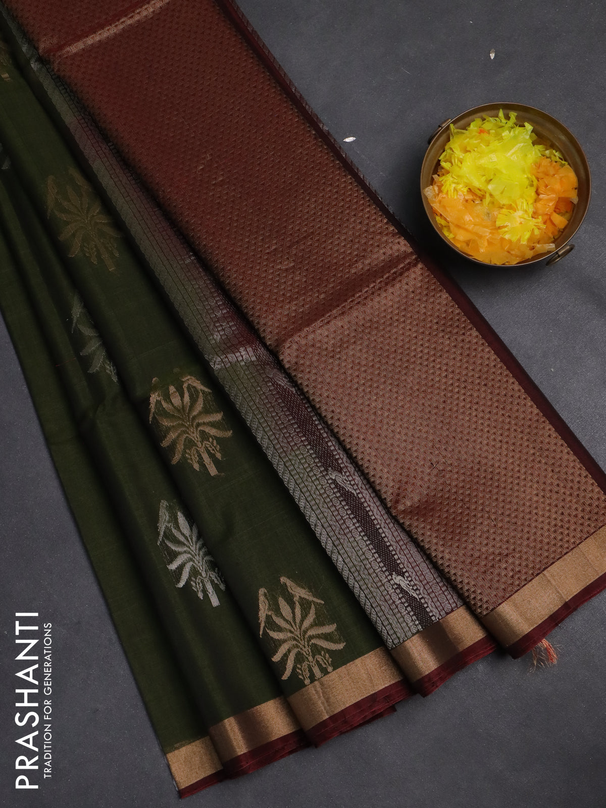 Kora silk cotton saree sap green and maroon with zari woven buttas and zari woven border