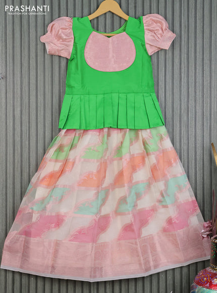Kota kids lehenga light green and off white with patch work neck pattern and zari woven border for 8 years