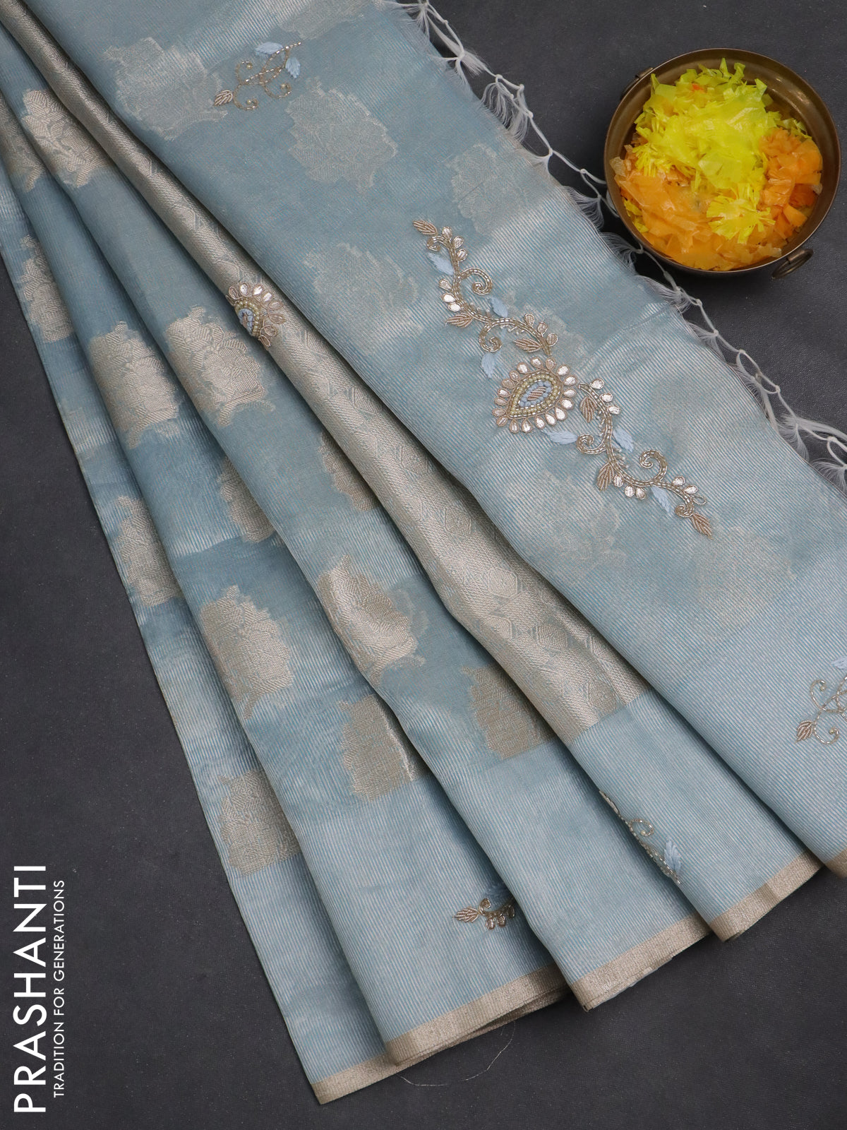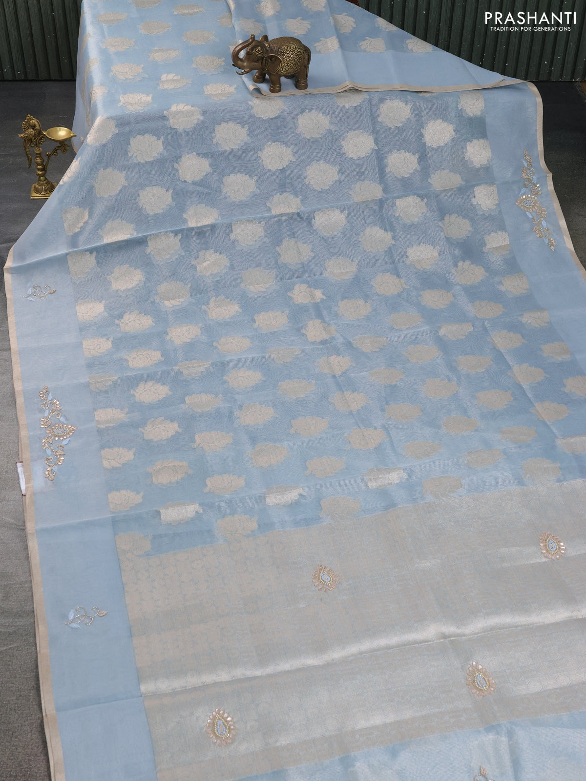 Kota tissue saree light blue with zari woven floral buttas and embroidery butta border