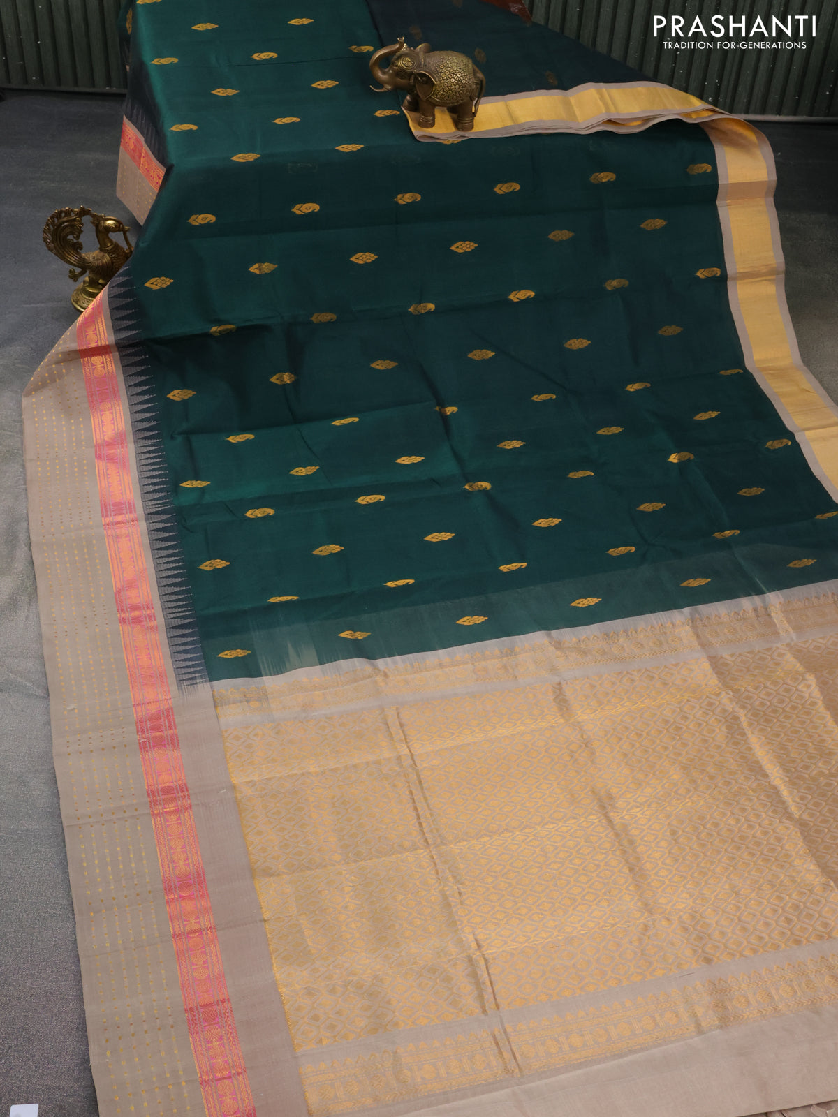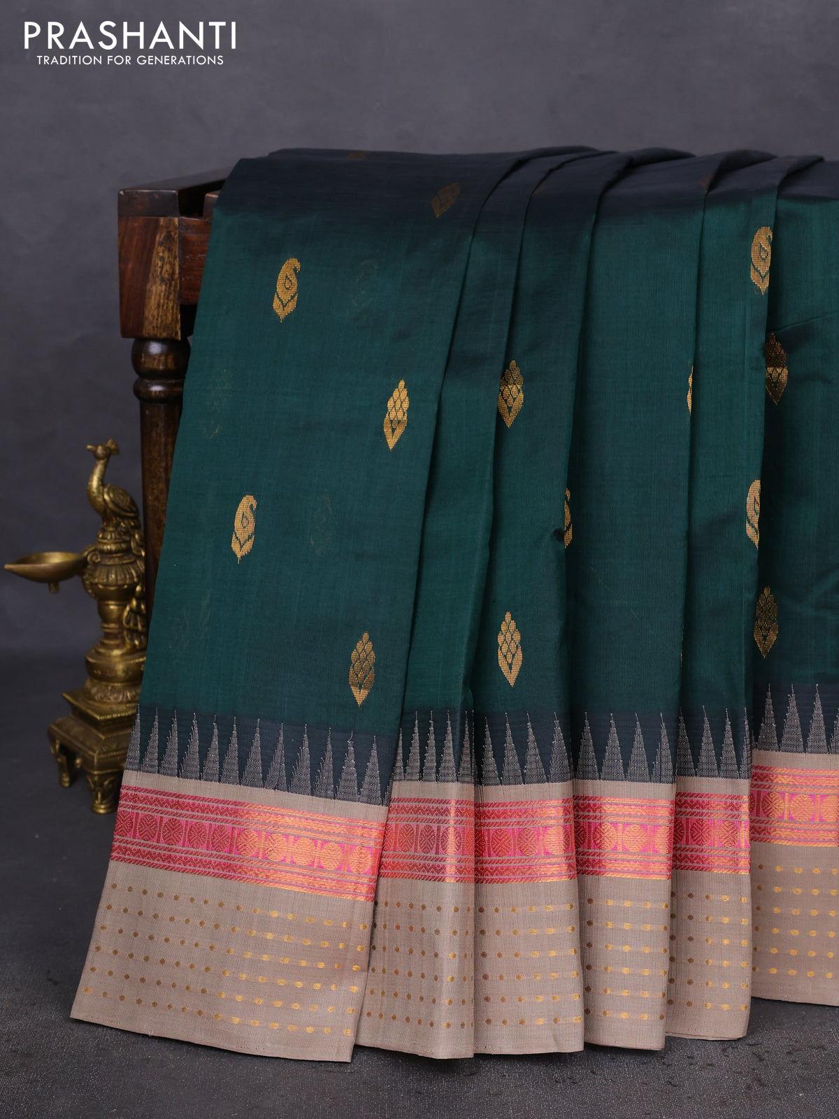 Kuppadam silk cotton saree bottle green and grey shade with zari woven buttas and temple design zari woven border