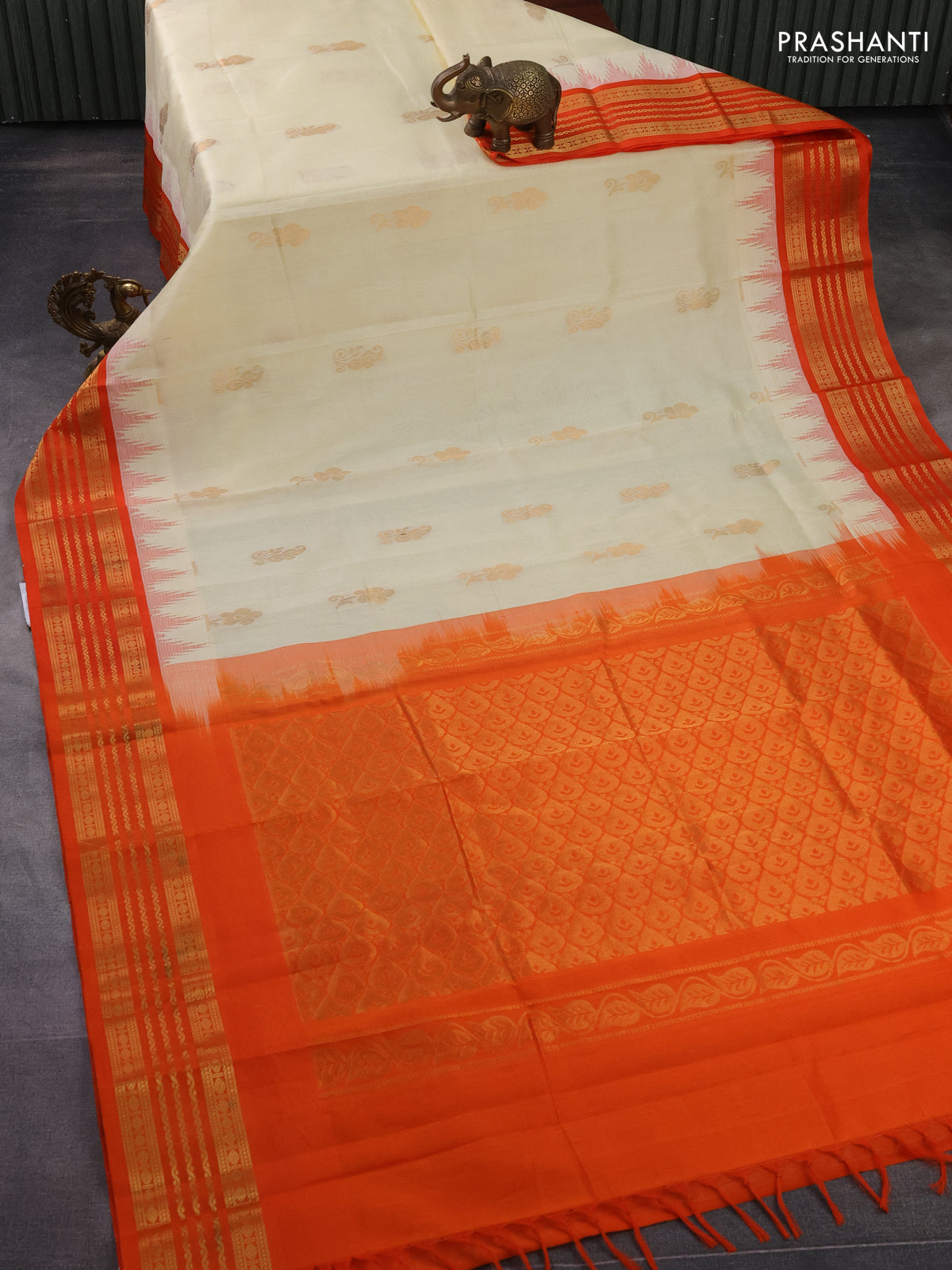 Kuppadam silk cotton saree cream and orange with zari woven buttas and temple design zari woven border