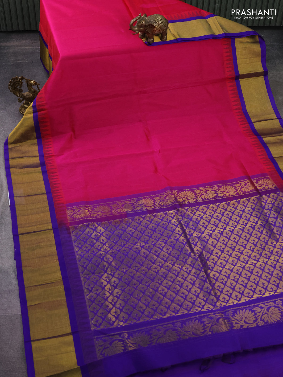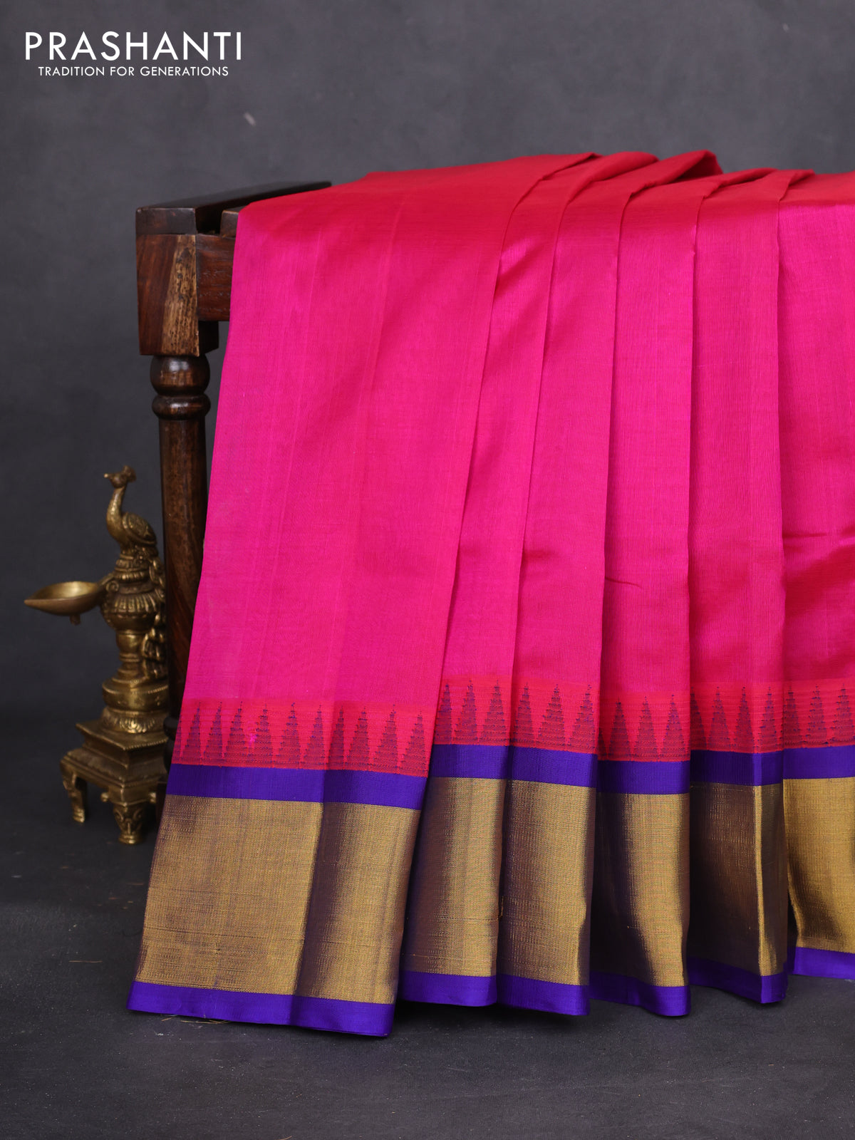 Kuppadam silk cotton saree dark pink and violet with plain body and temple design zari woven border