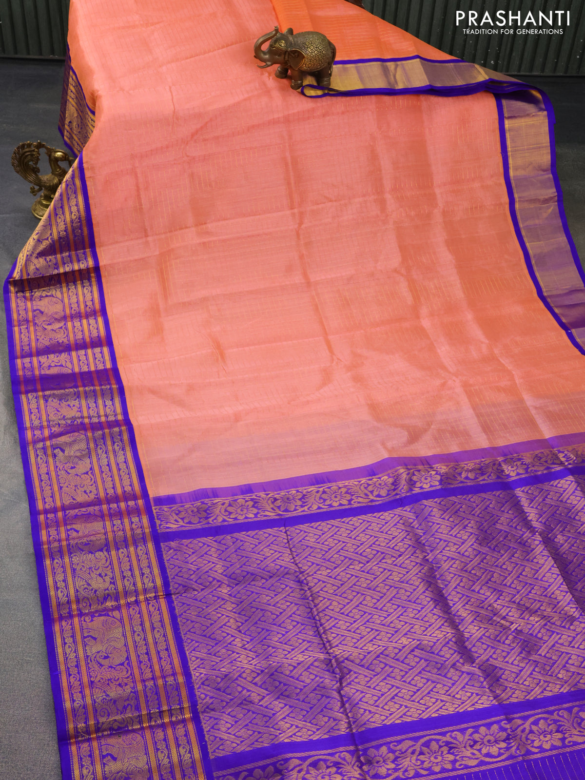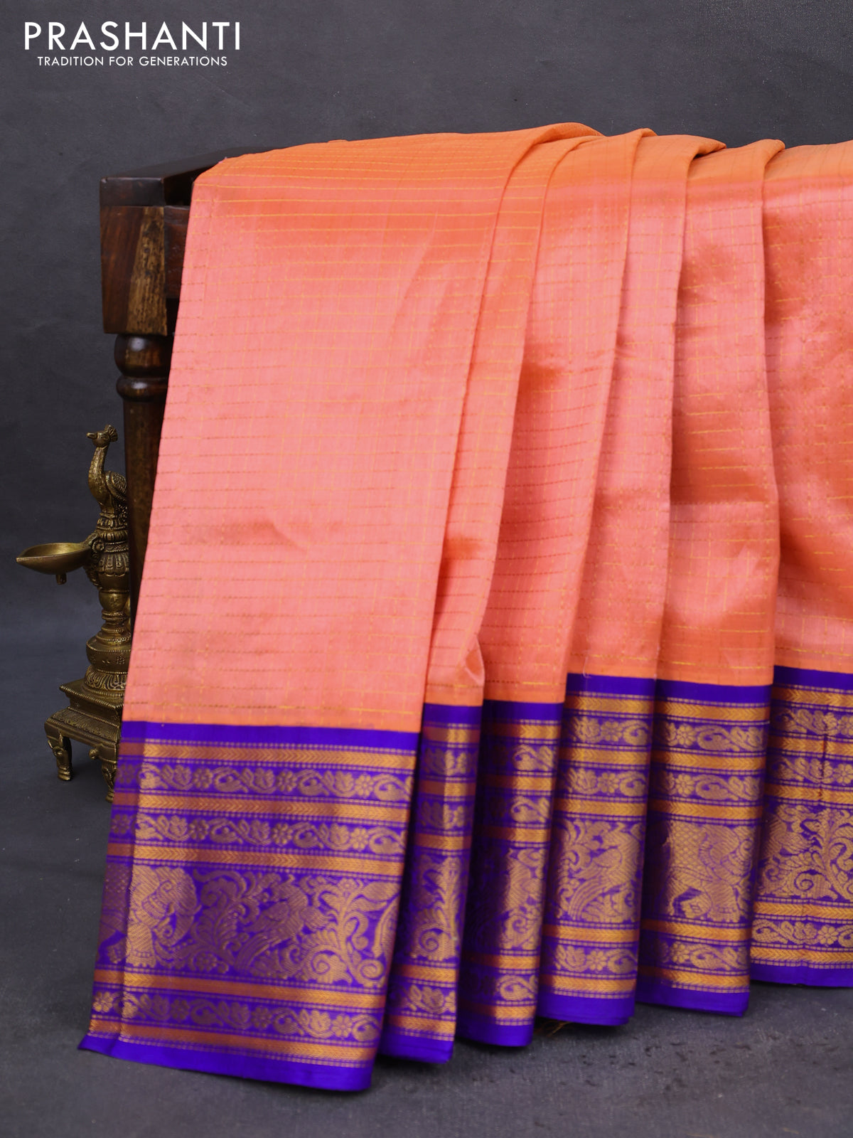 Kuppadam silk cotton saree peach orange and blue with allover zari checked pattern and long zari woven border