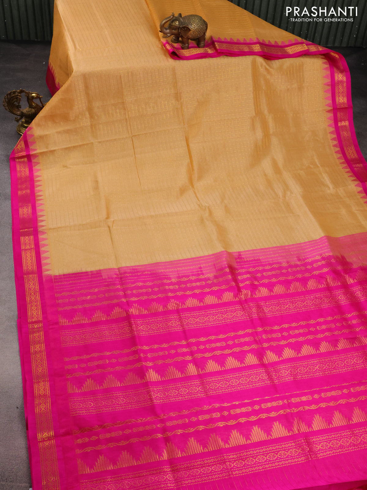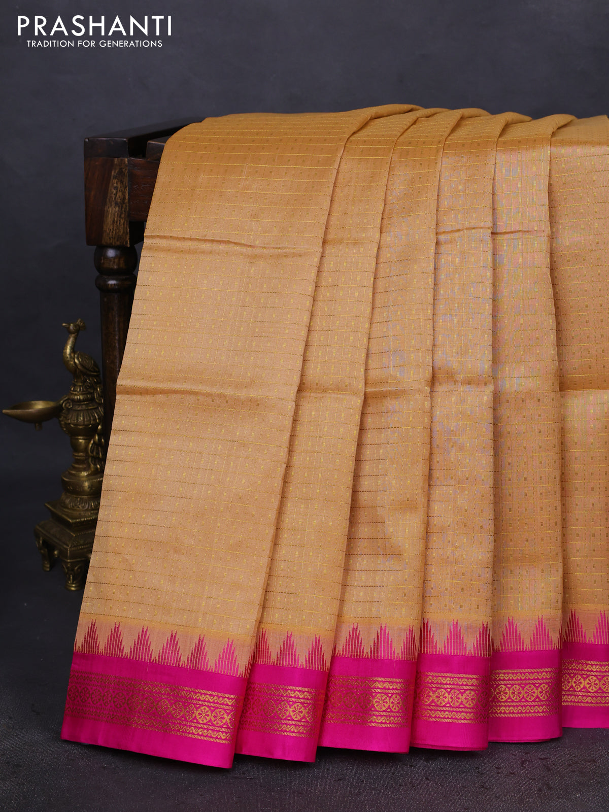 Kuppadam silk cotton saree sandal and pink with allover zari checks & buttas and temple design zari woven border