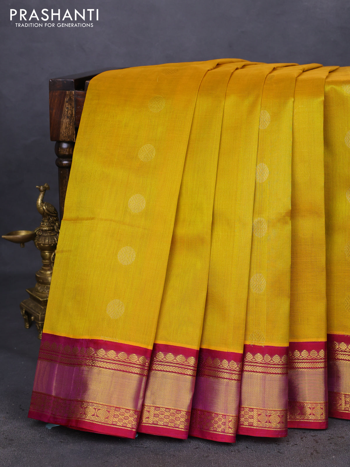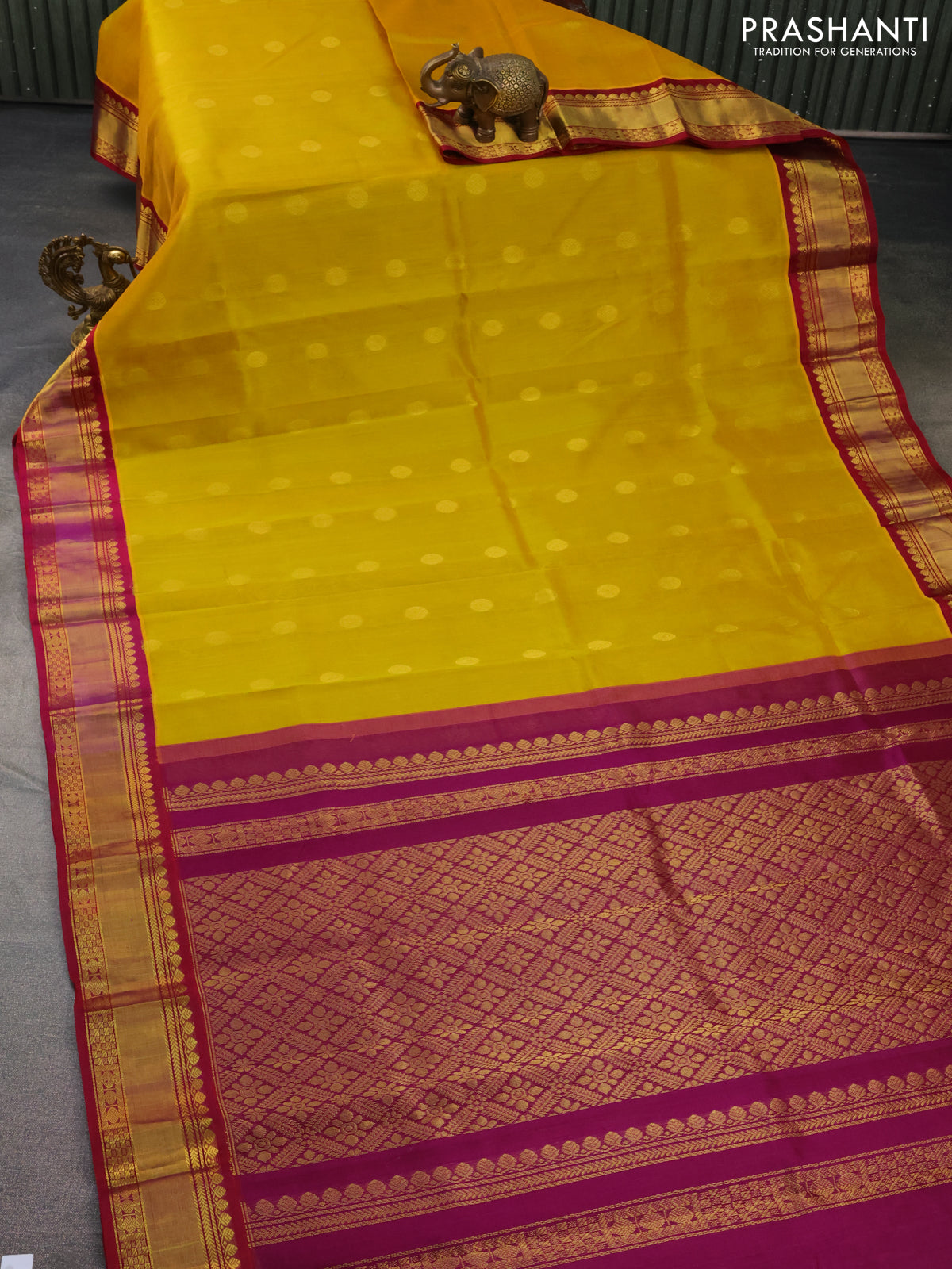 Kuppadam silk cotton saree yellow and purple with zari woven rudhraksha buttas and zari woven border