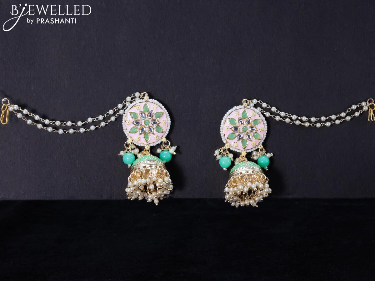 Light weight jhumkas baby pink and mint green minakari with pearl maatal