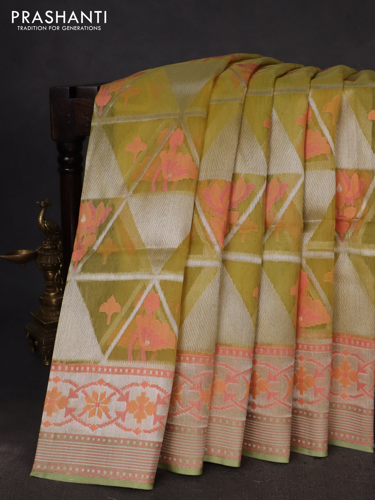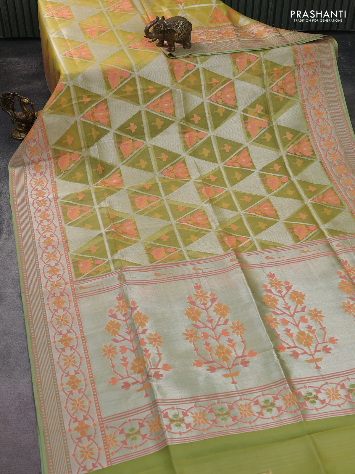 lime yellow and pastel green Banarasi kora jamdhani silk saree