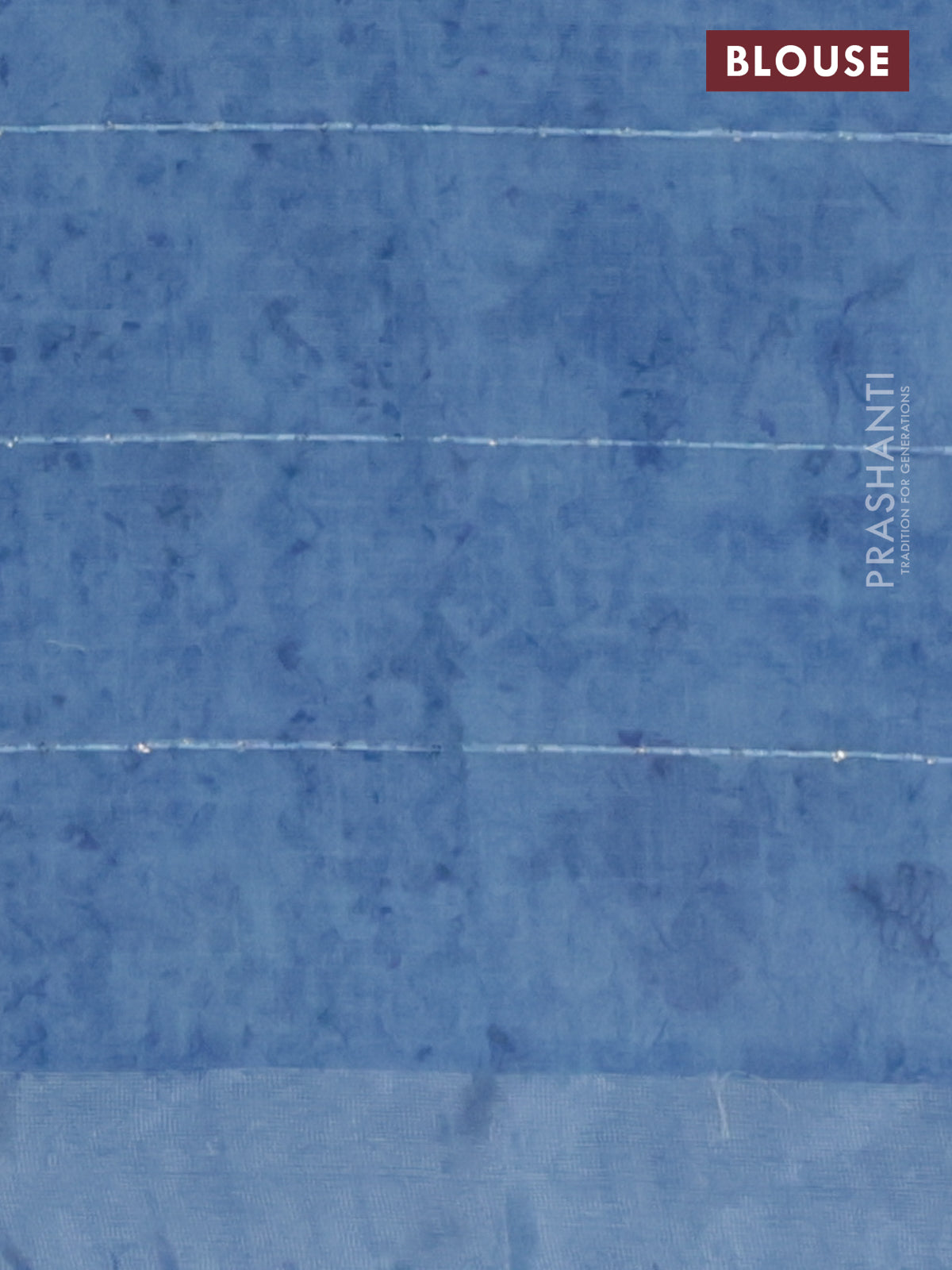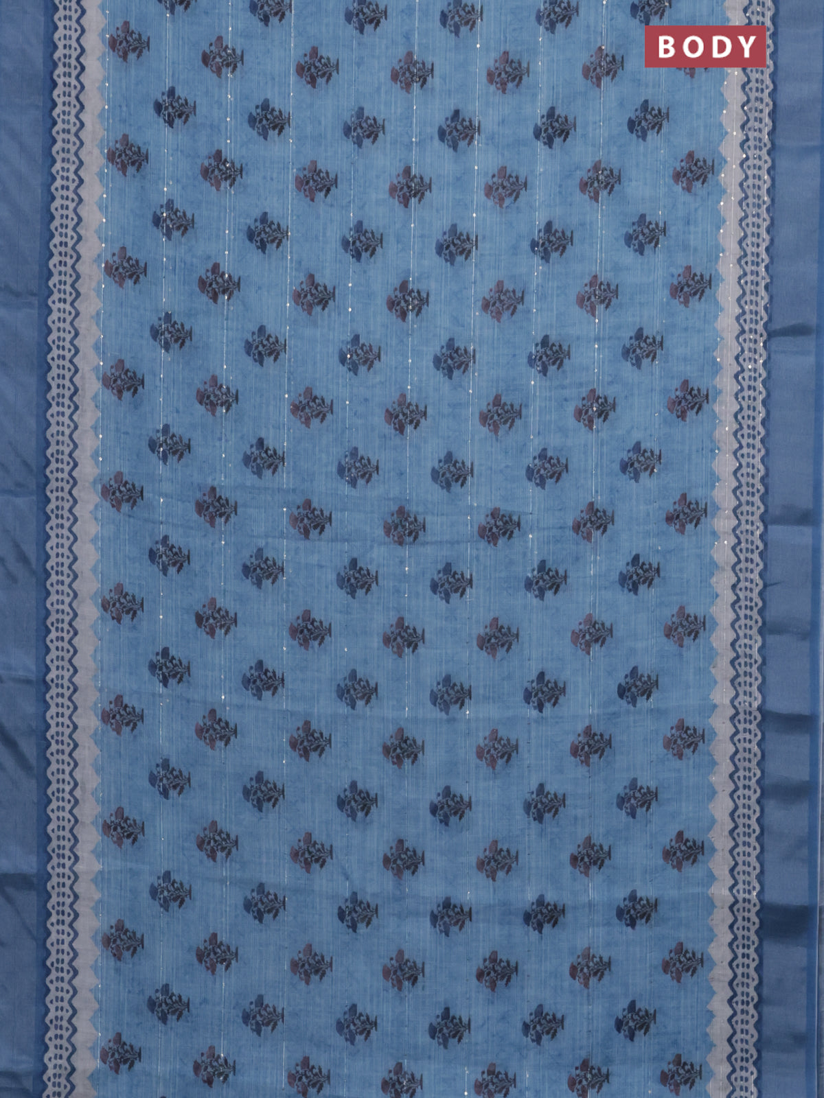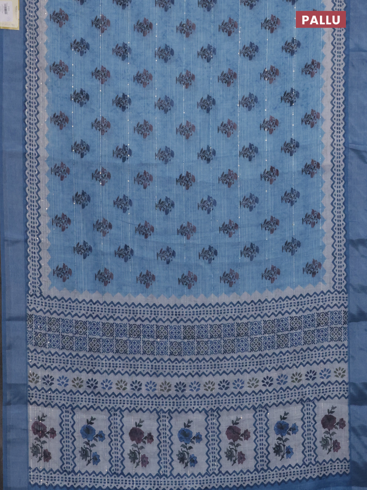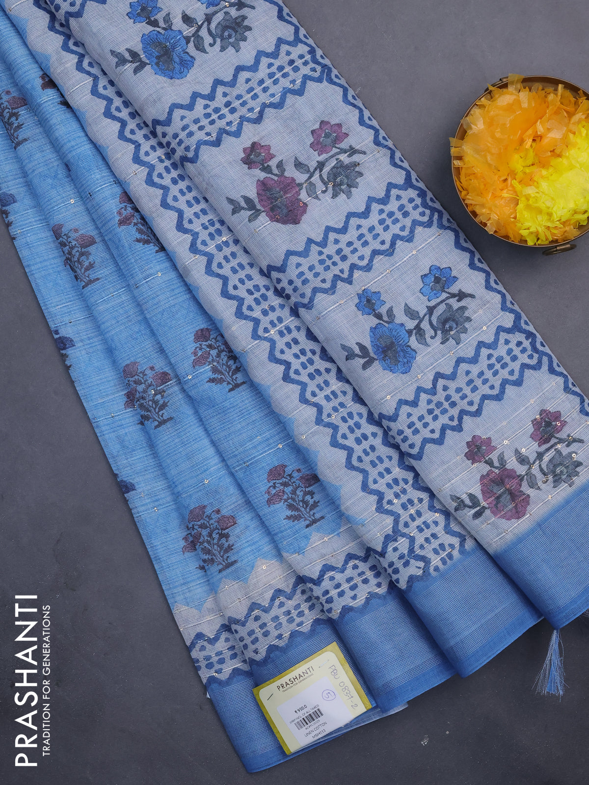 Linen cotton saree blue shade with floral butta prints & sequin work and silver zari woven border