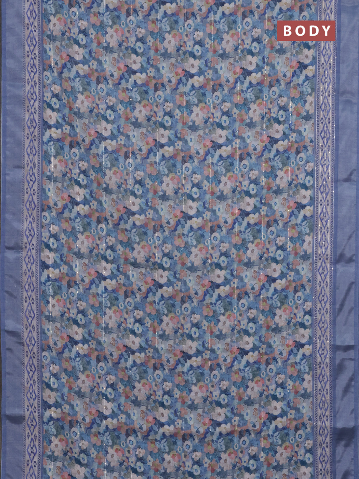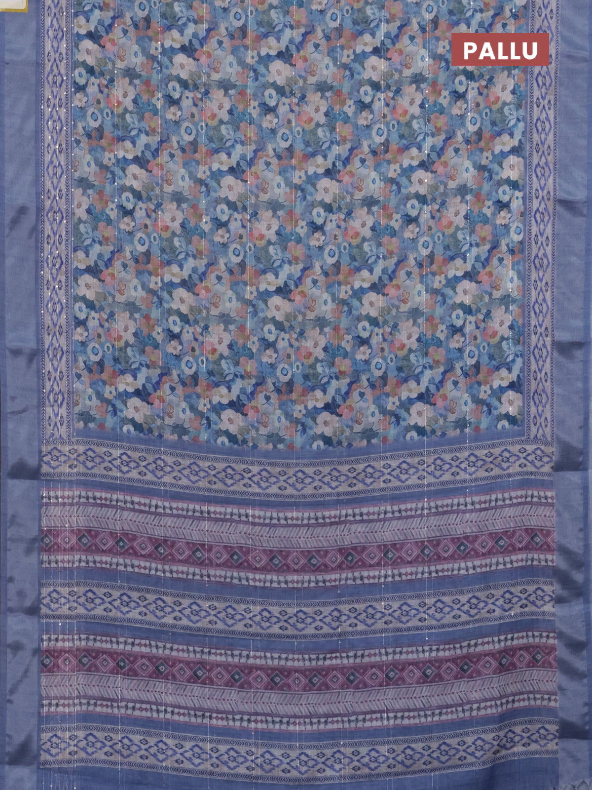 Linen cotton saree blue with allover floral prints & sequin work and silver zari woven border