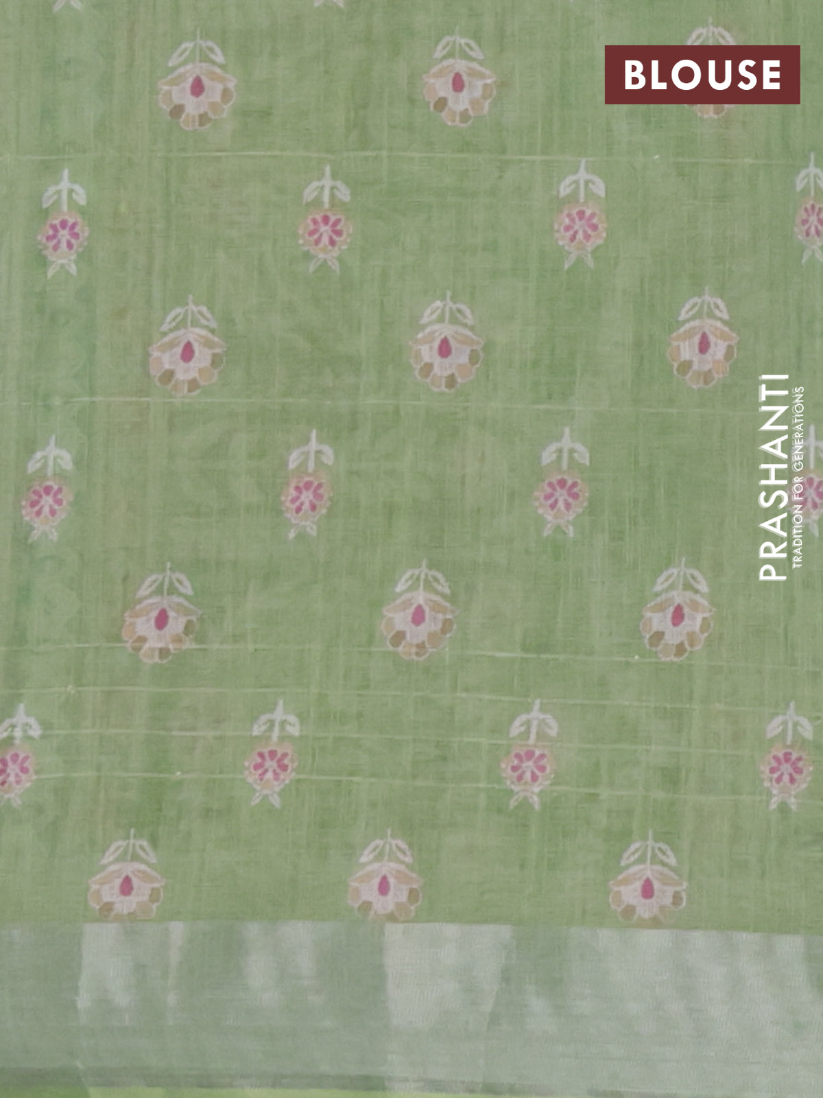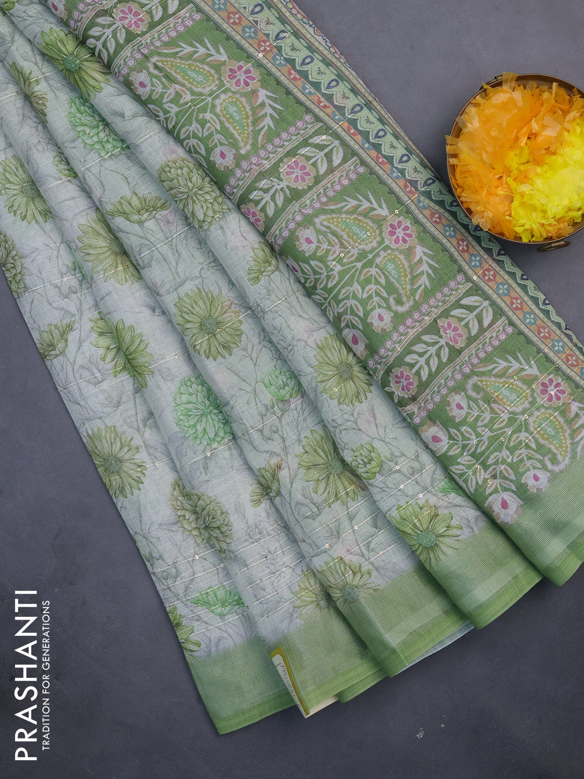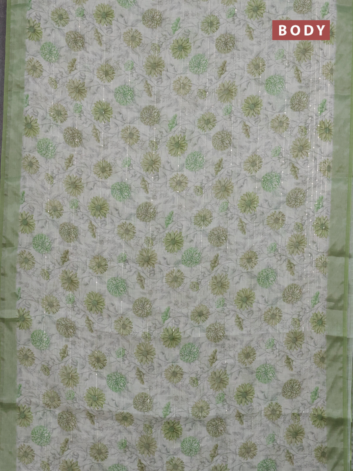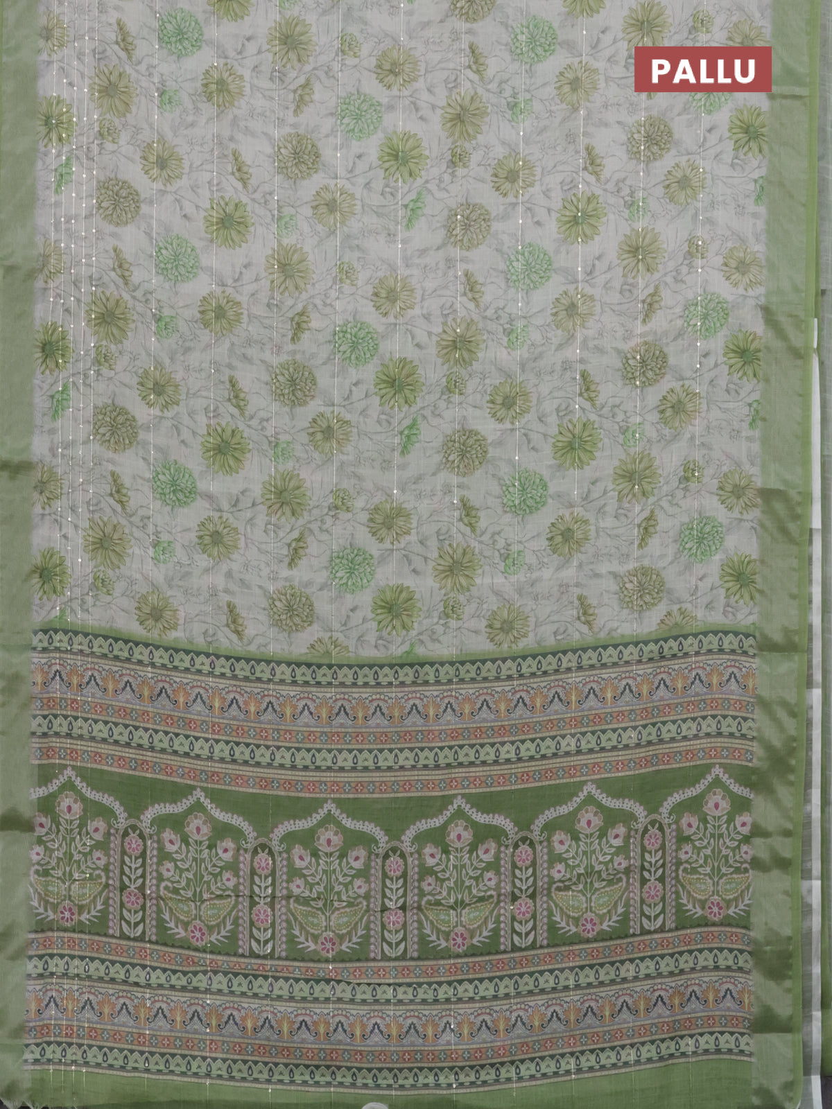 Linen cotton saree cream and green with allover floral prints & sequin work and silver zari woven border