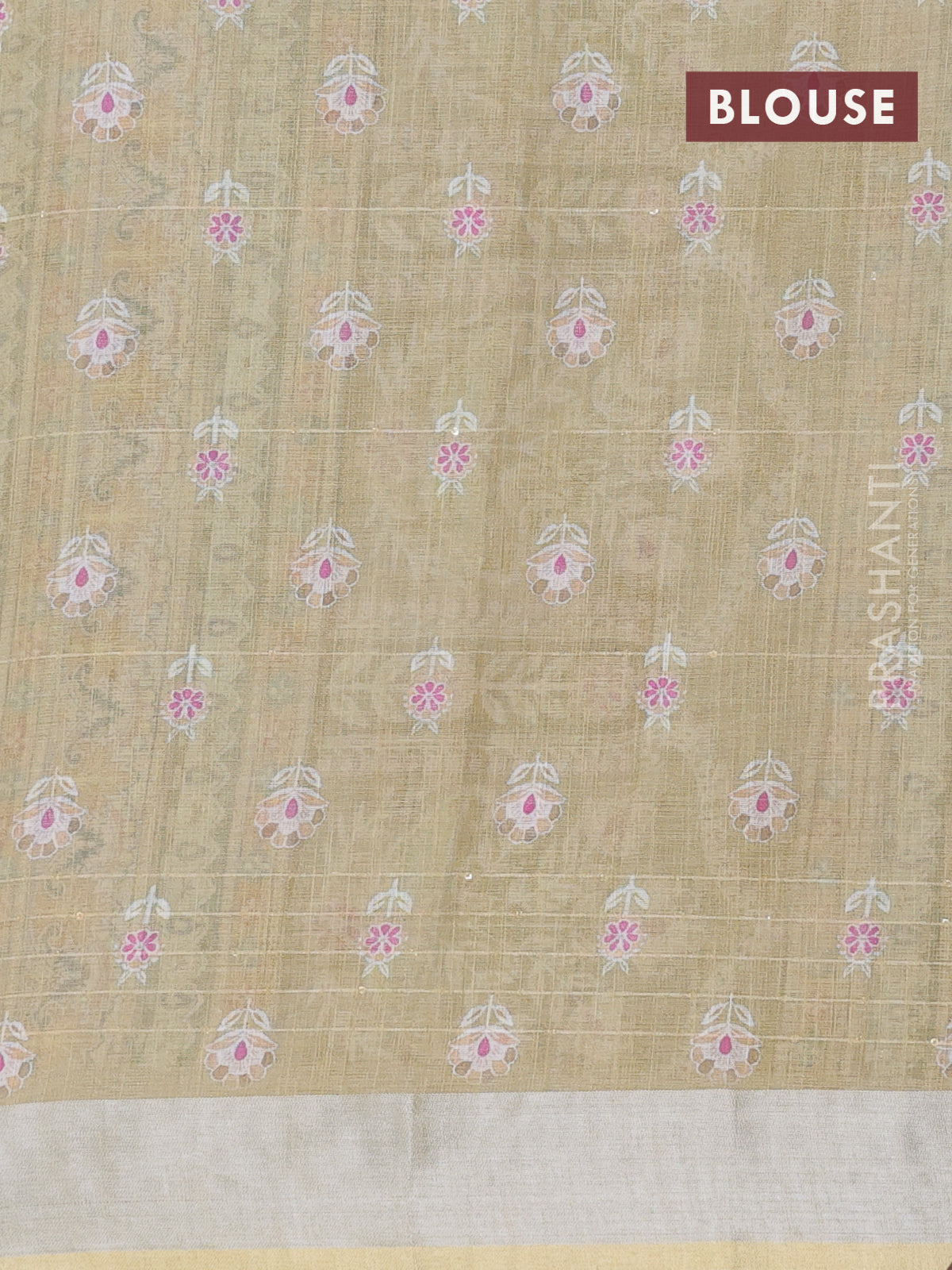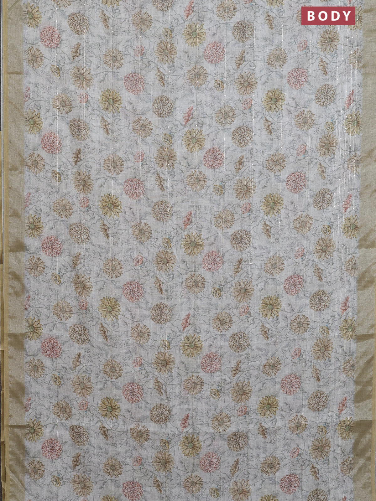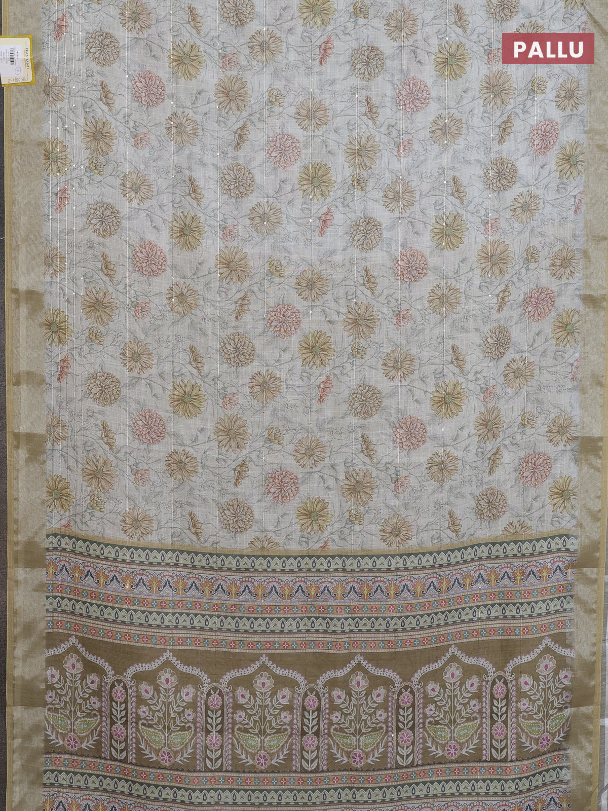 Linen cotton saree cream and sandal with allover floral prints & sequin work and silver zari woven border