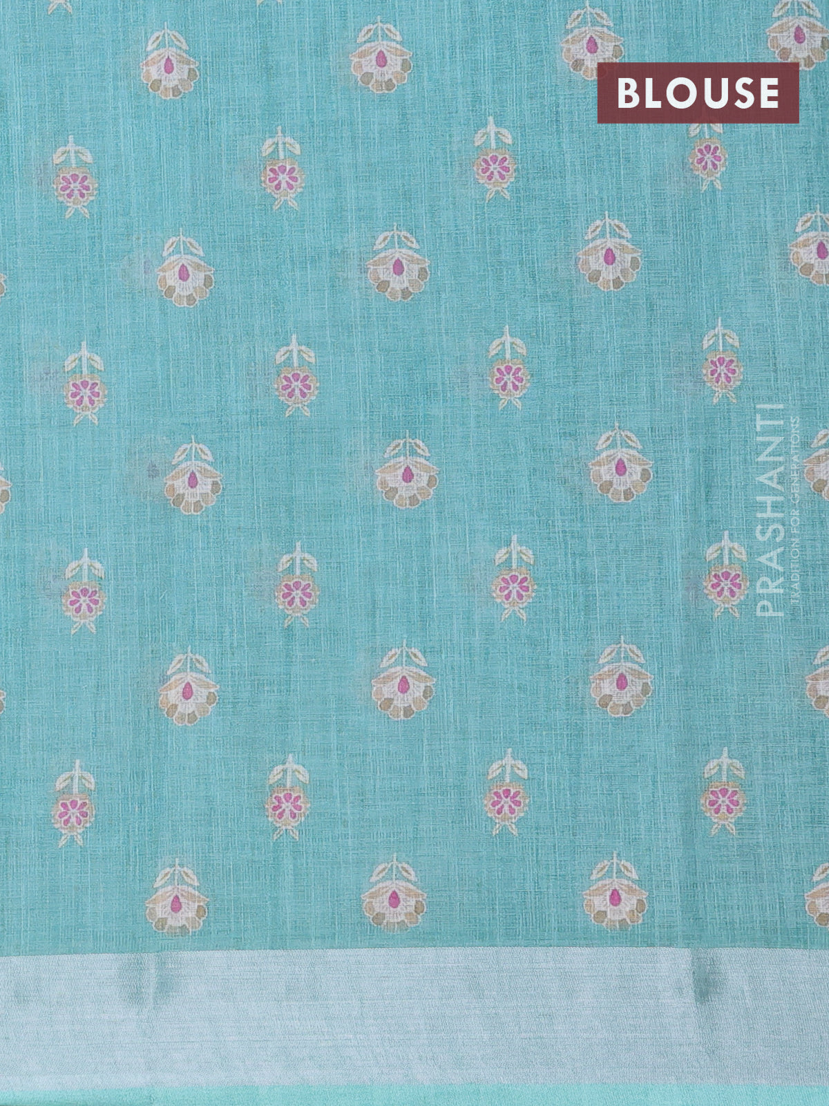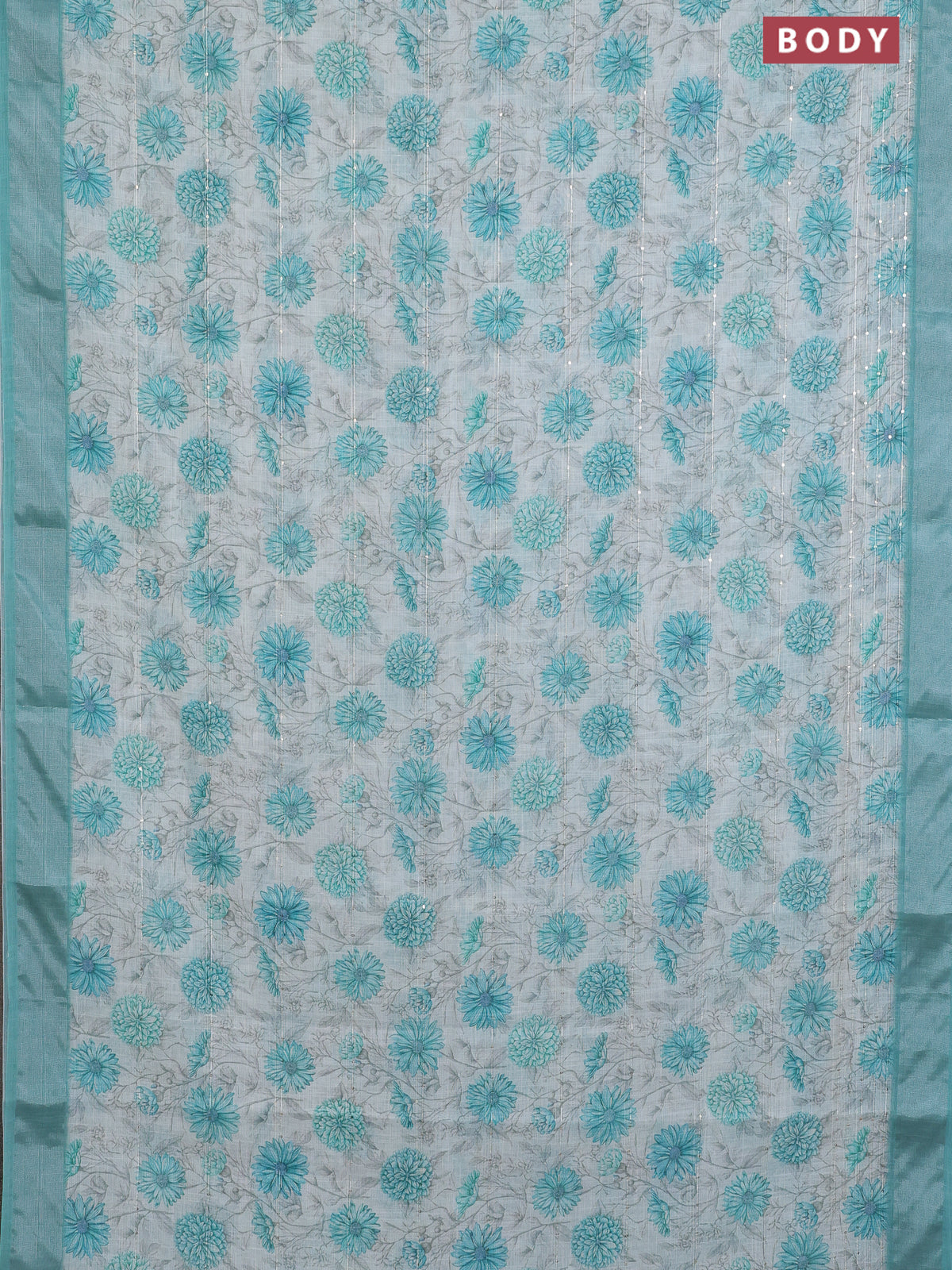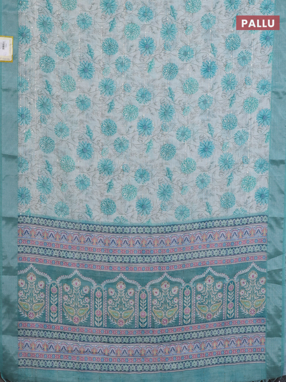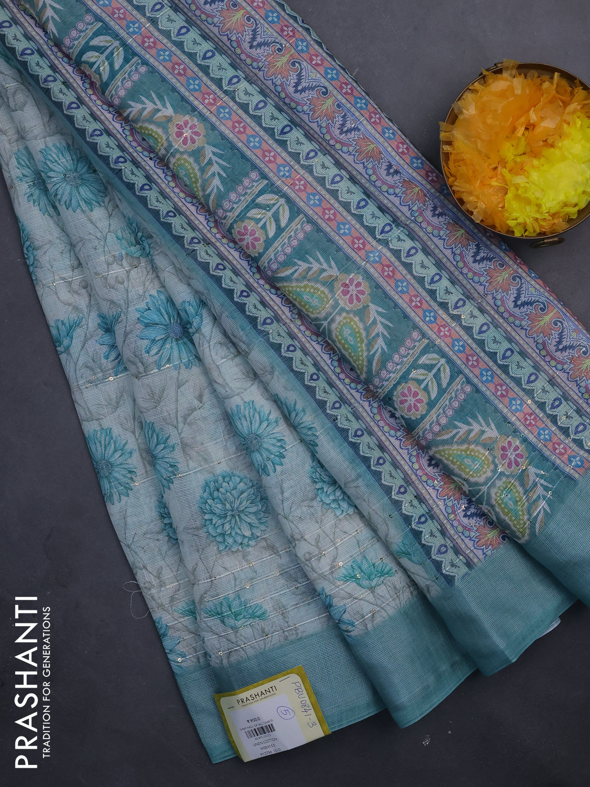Linen cotton saree cream and teal green with allover floral prints & sequin work and silver zari woven border