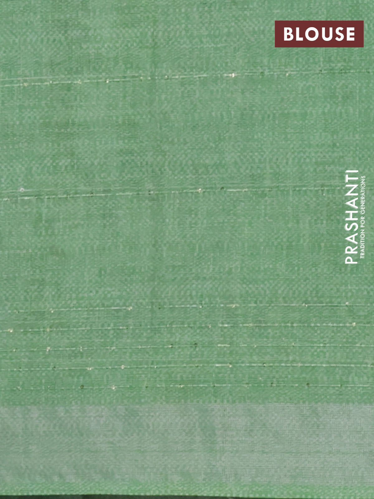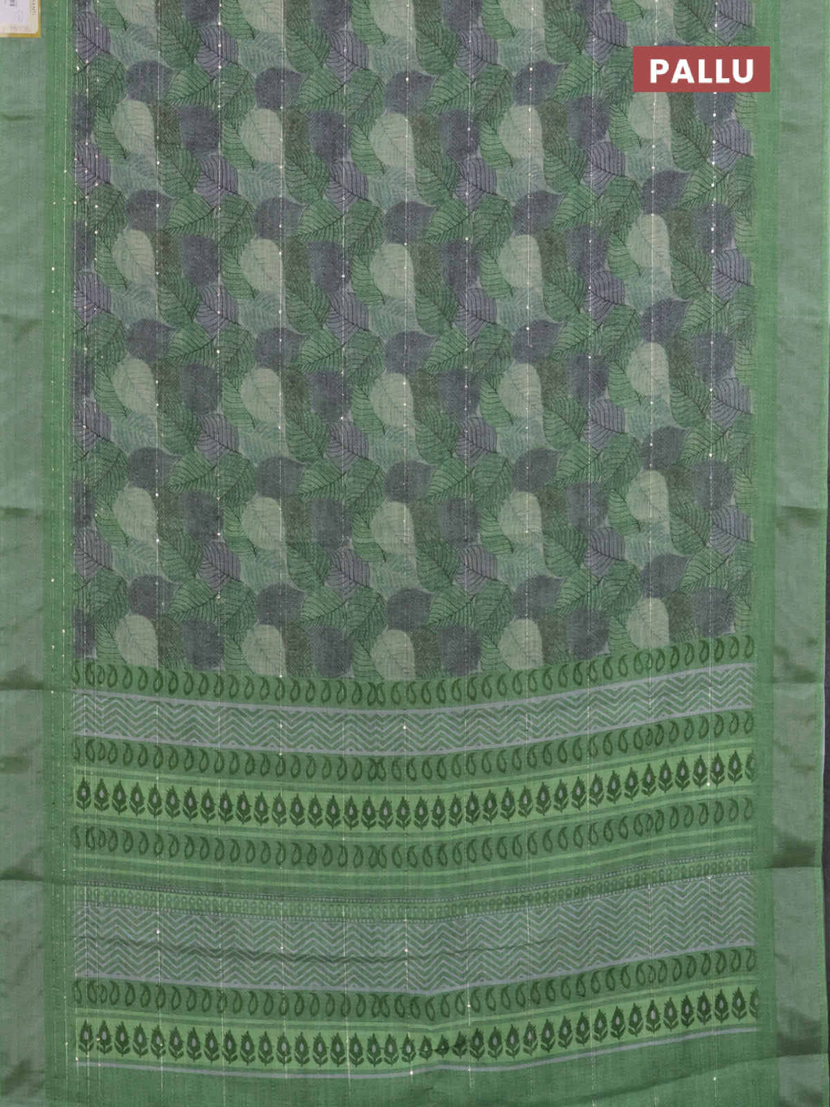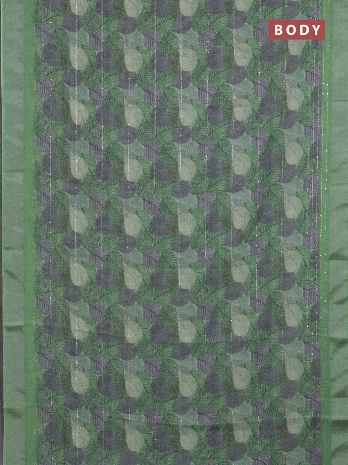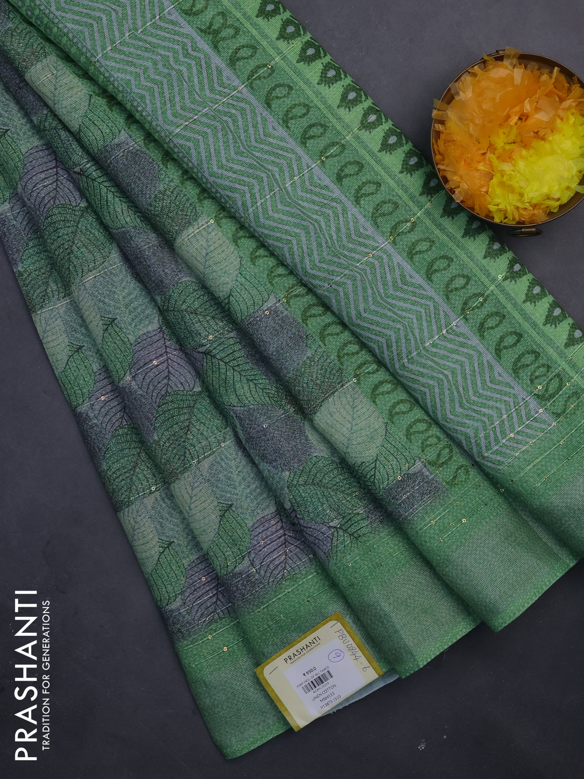 Linen cotton saree light green with allover leaf prints & sequin work and silver zari woven border
