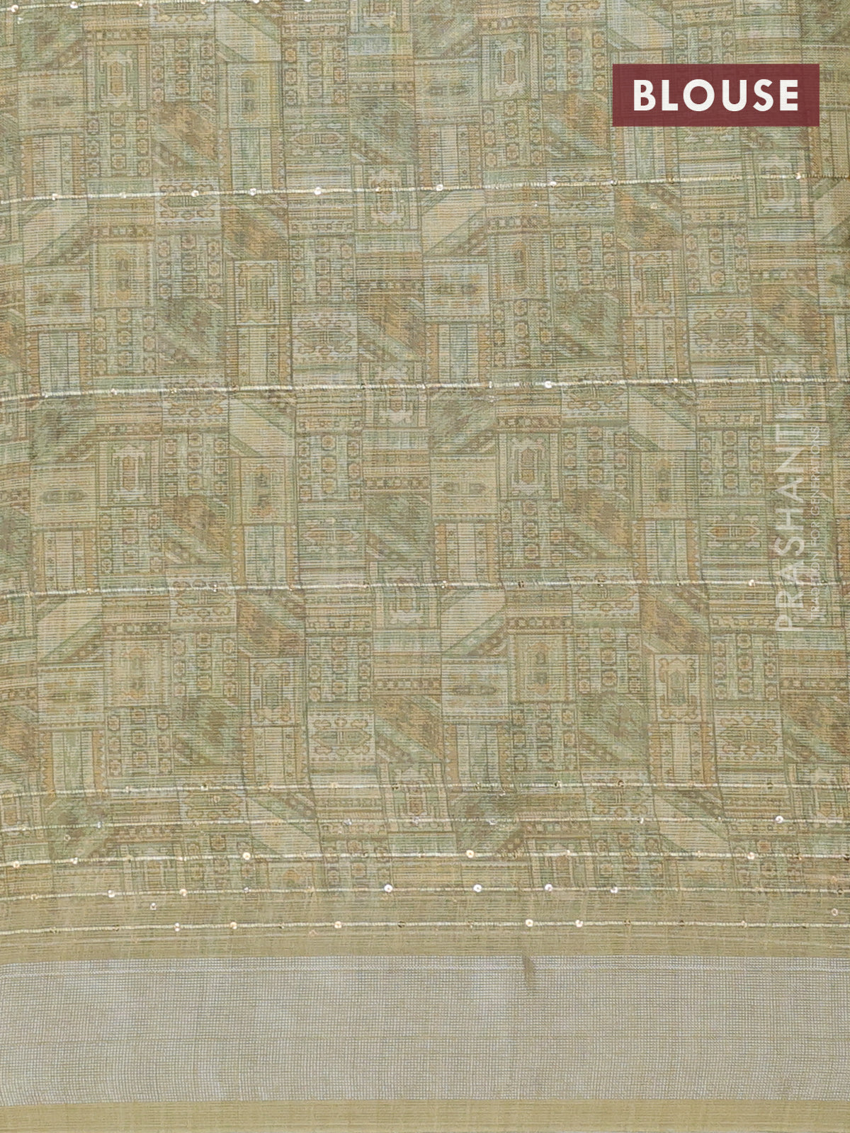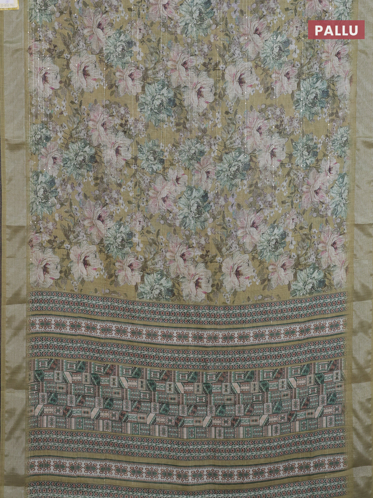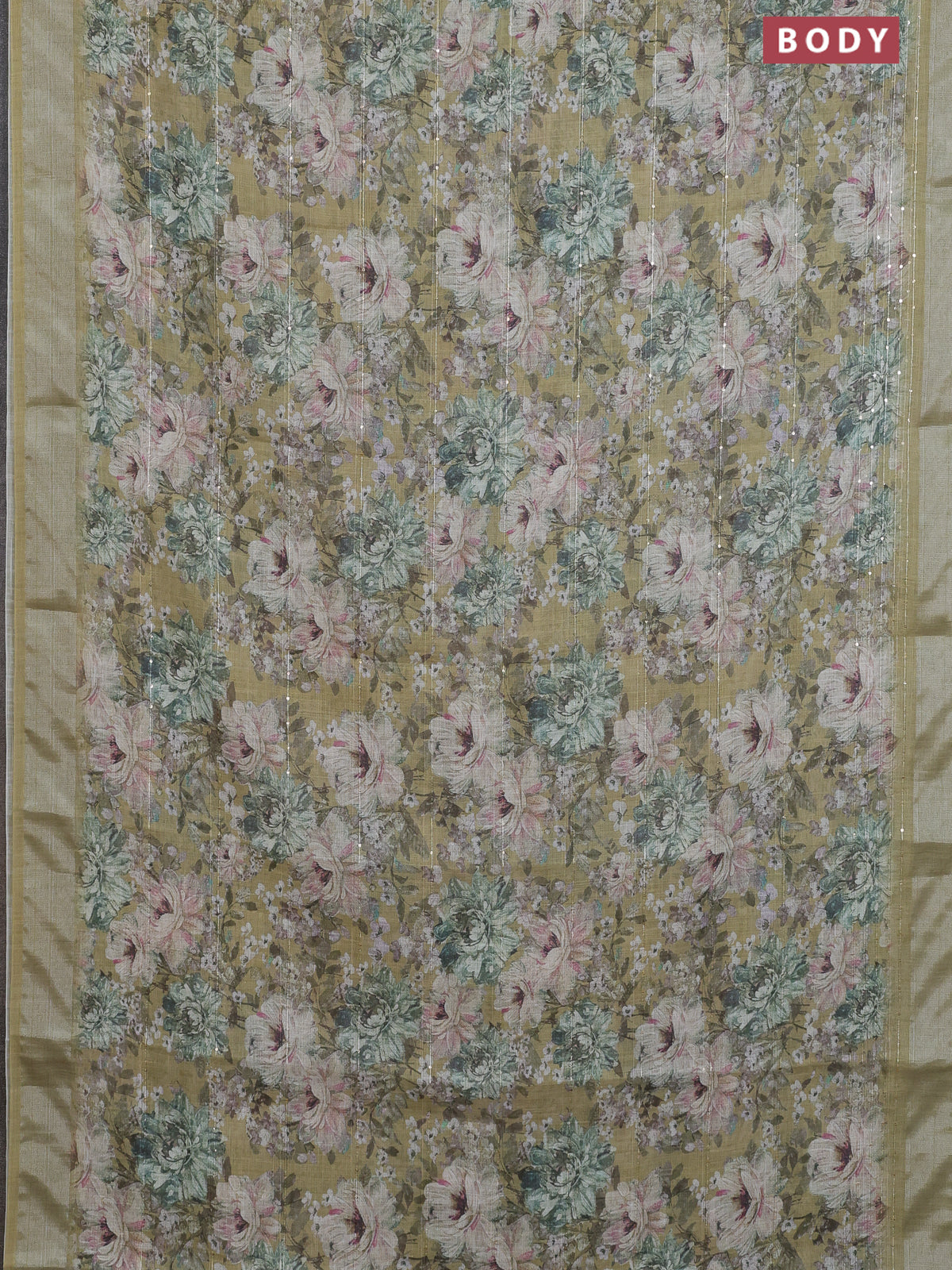 Linen cotton saree mehendi green with floral prints & sequin work and silver zari woven border