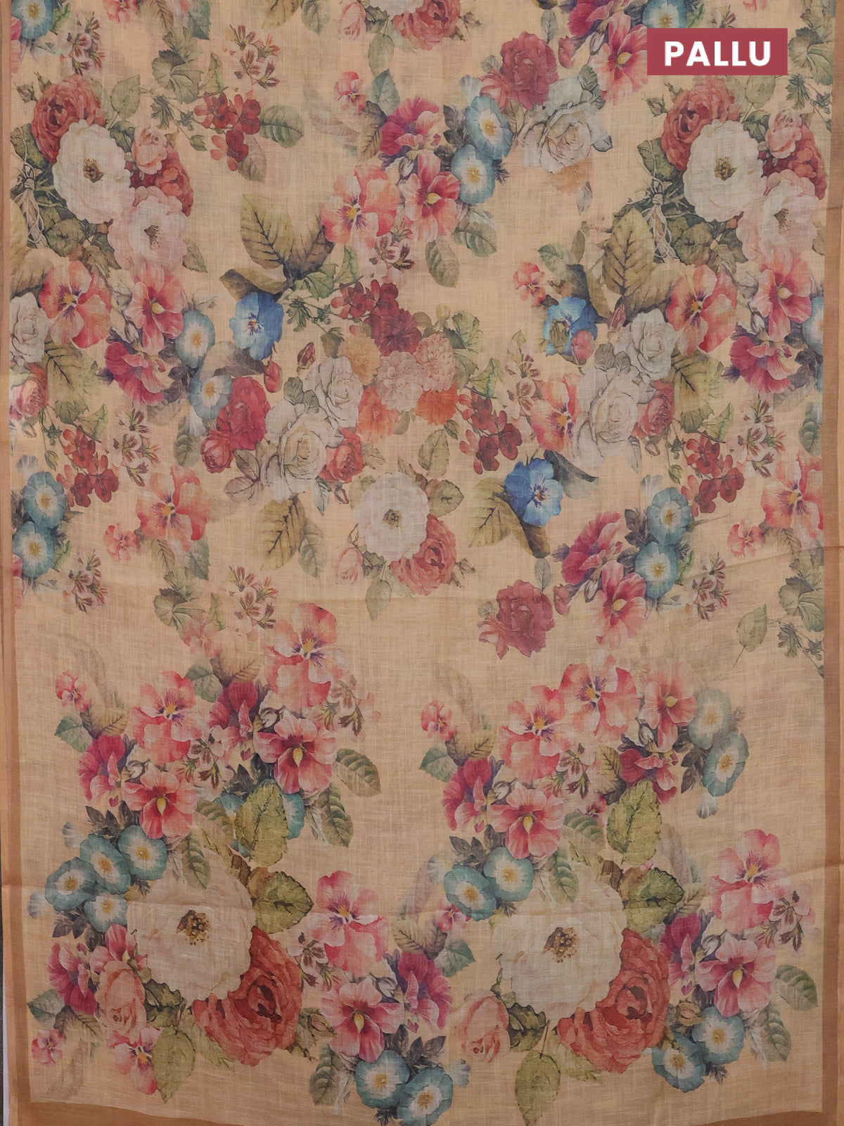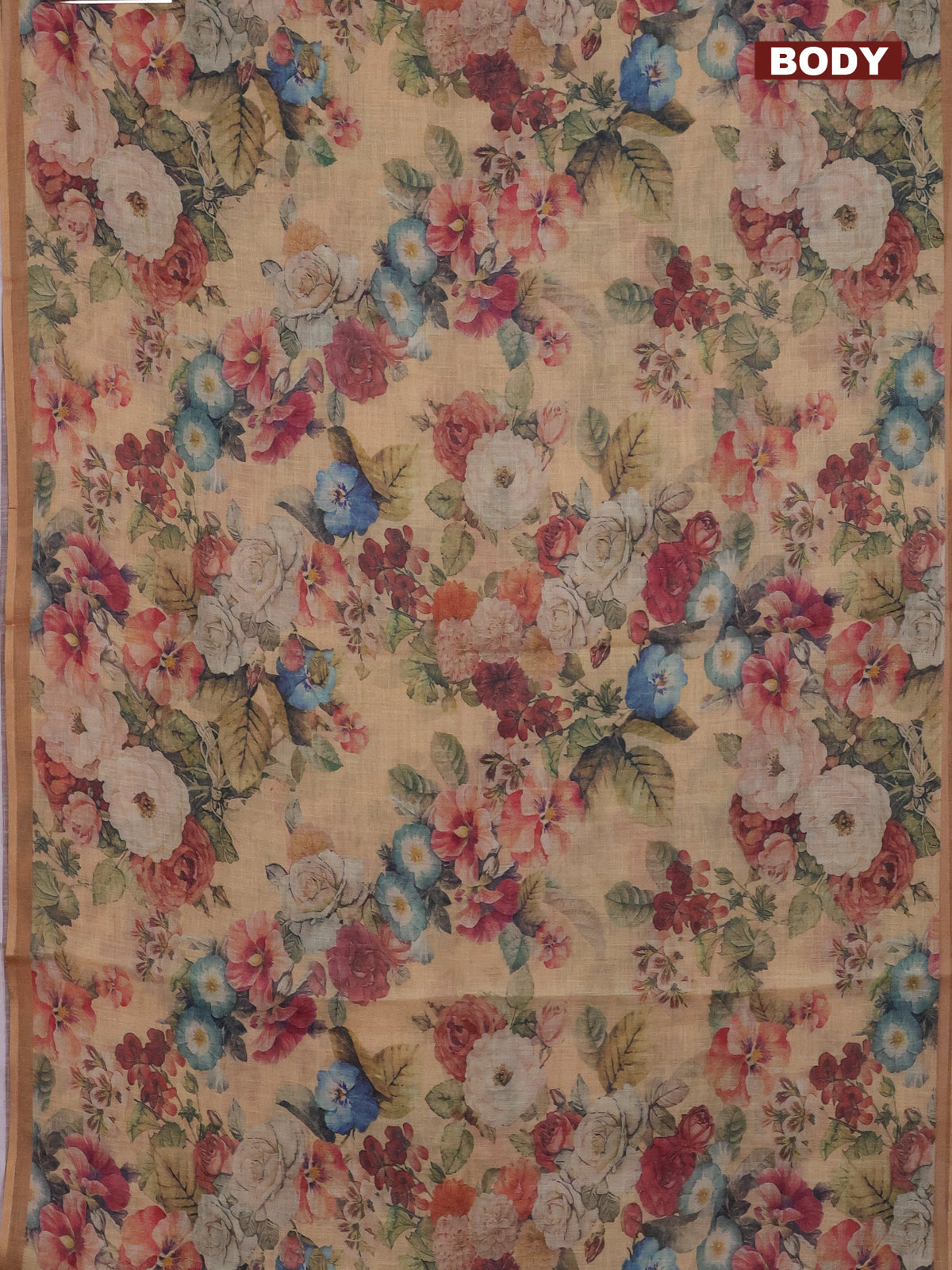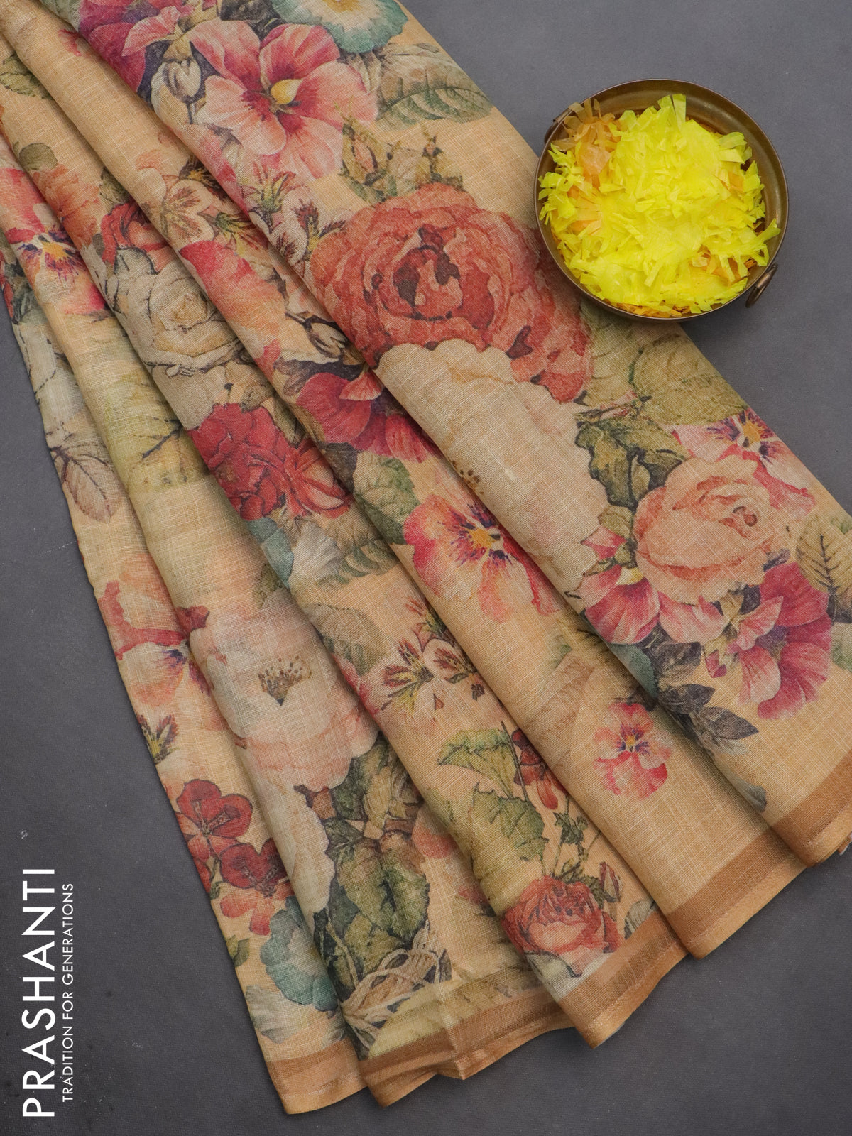 Linen cotton saree mustard shade with allover floral digital prints and simple border