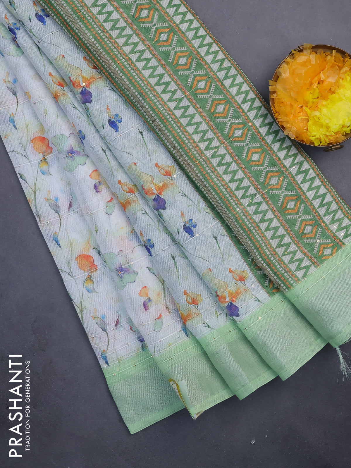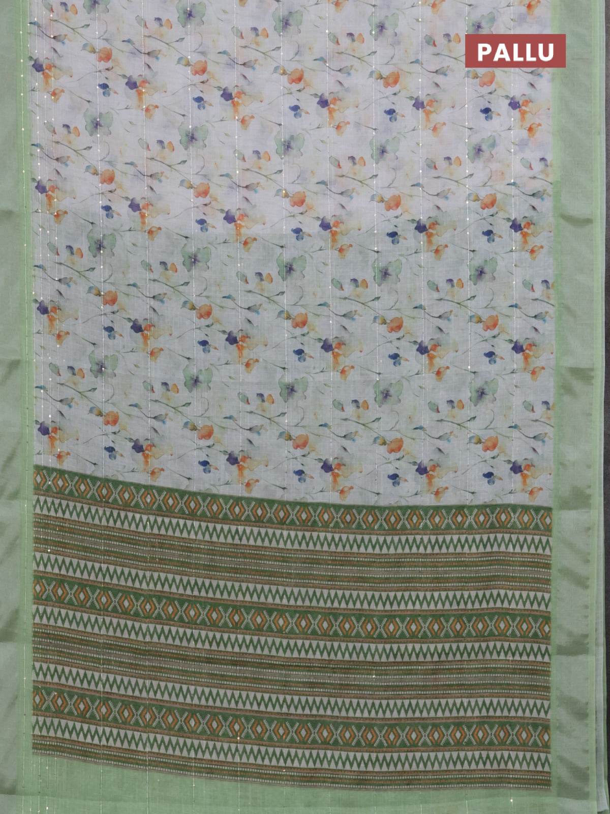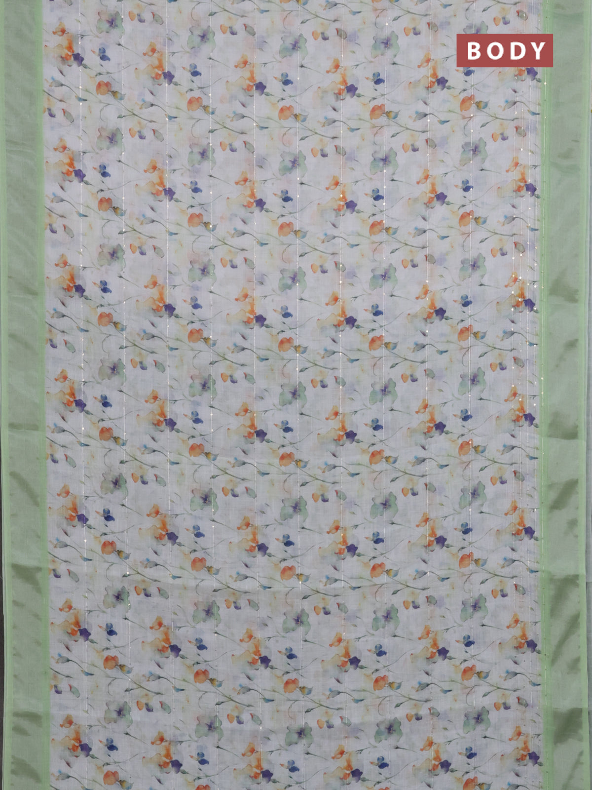Linen cotton saree off white and light green with allover floral prints & sequin work and silver zari woven border