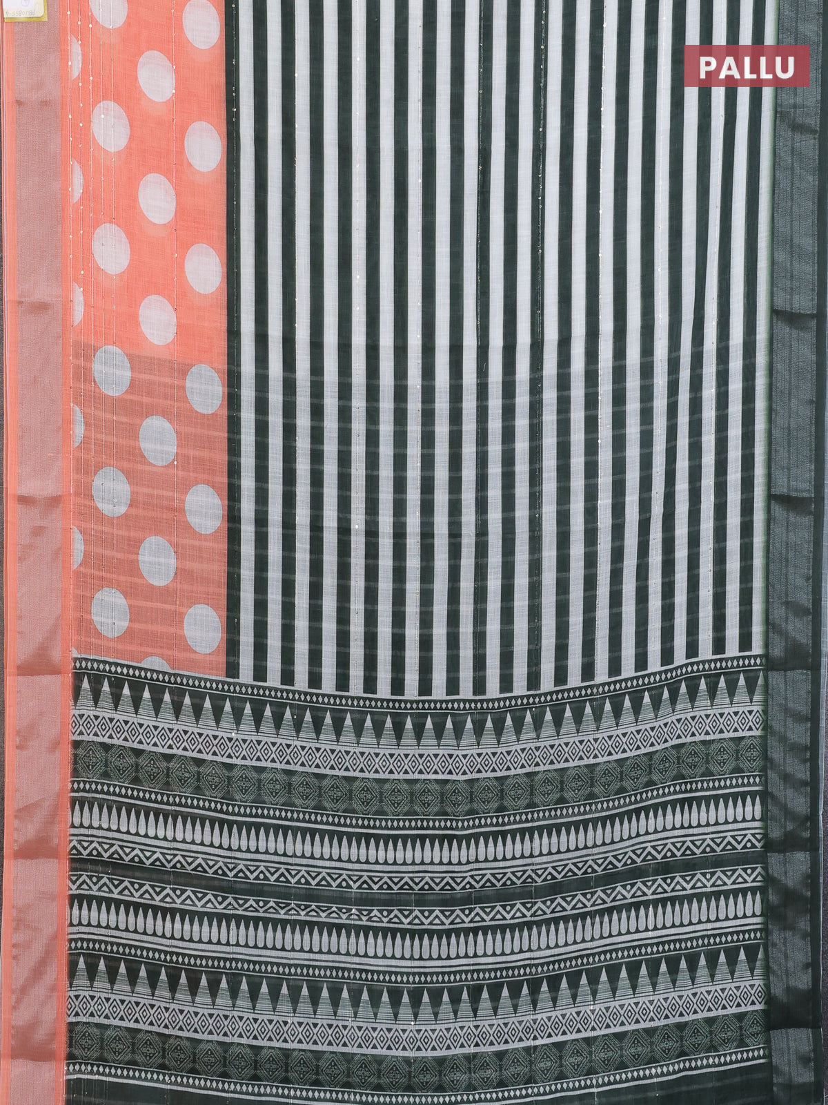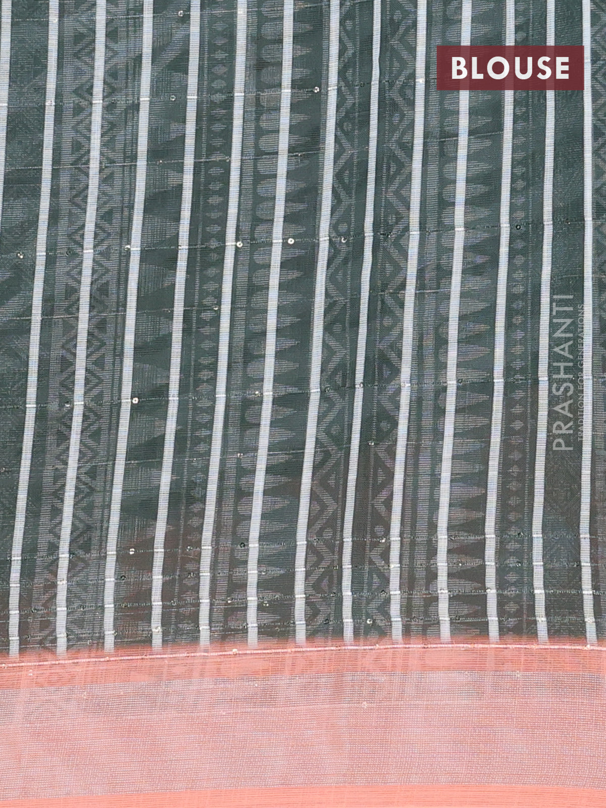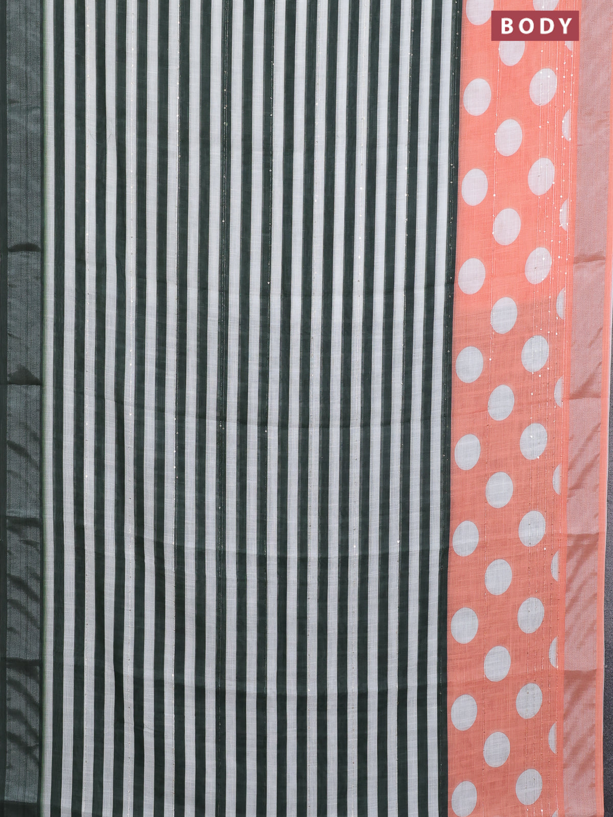 Linen cotton saree off white green and orange with stripes pattern & sequin work and silver zari woven border