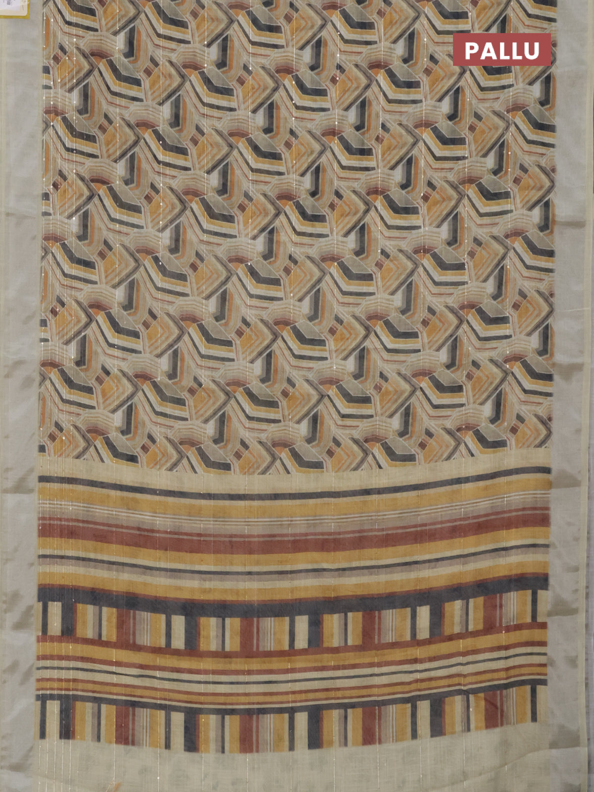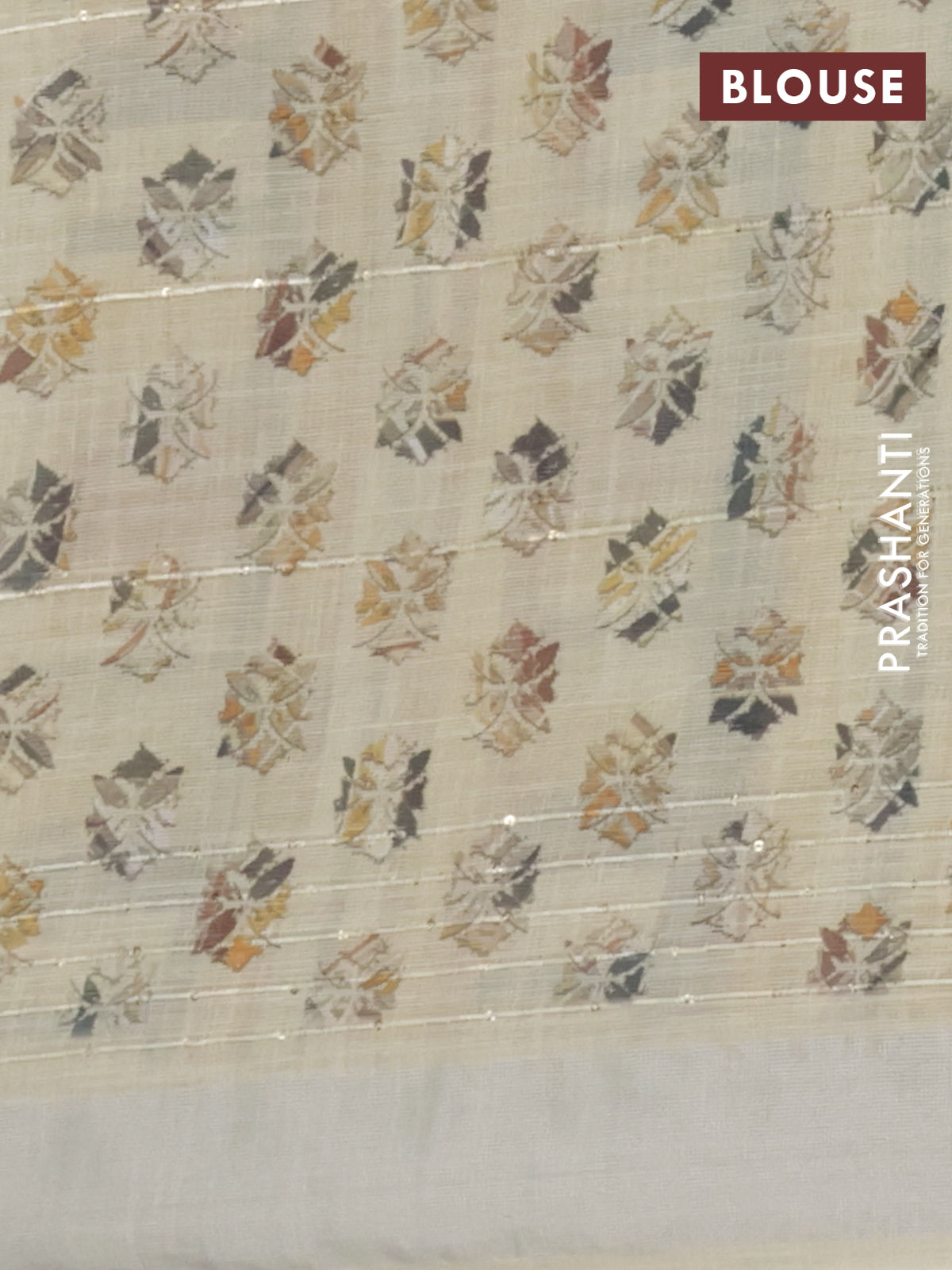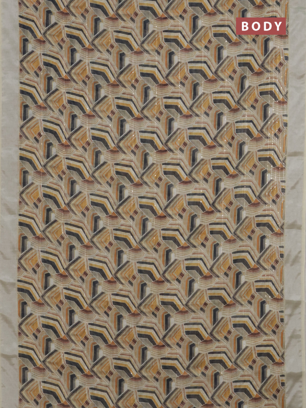 Linen cotton saree pale yellow with allover geometric prints & sequin work and silver zari woven border