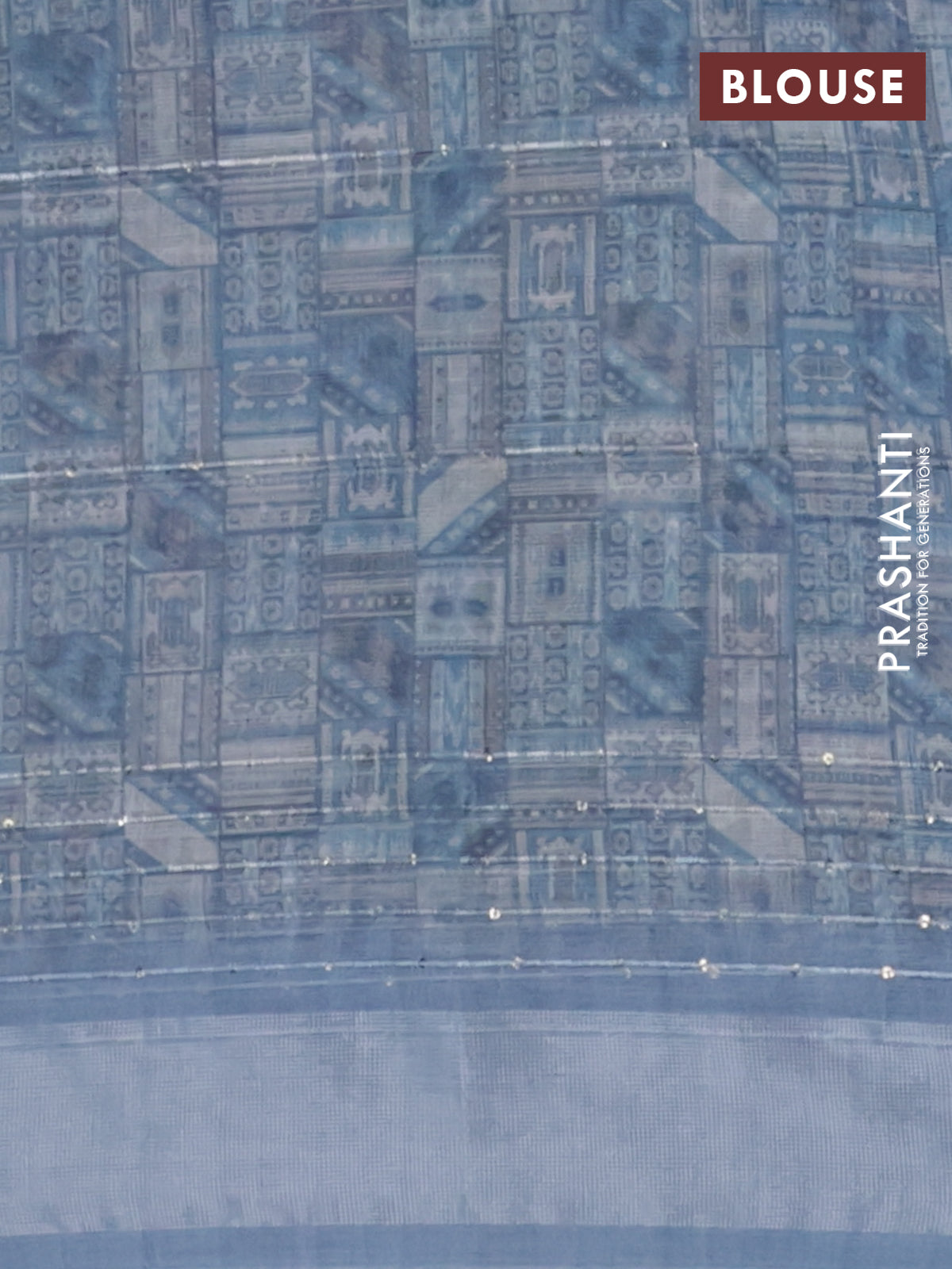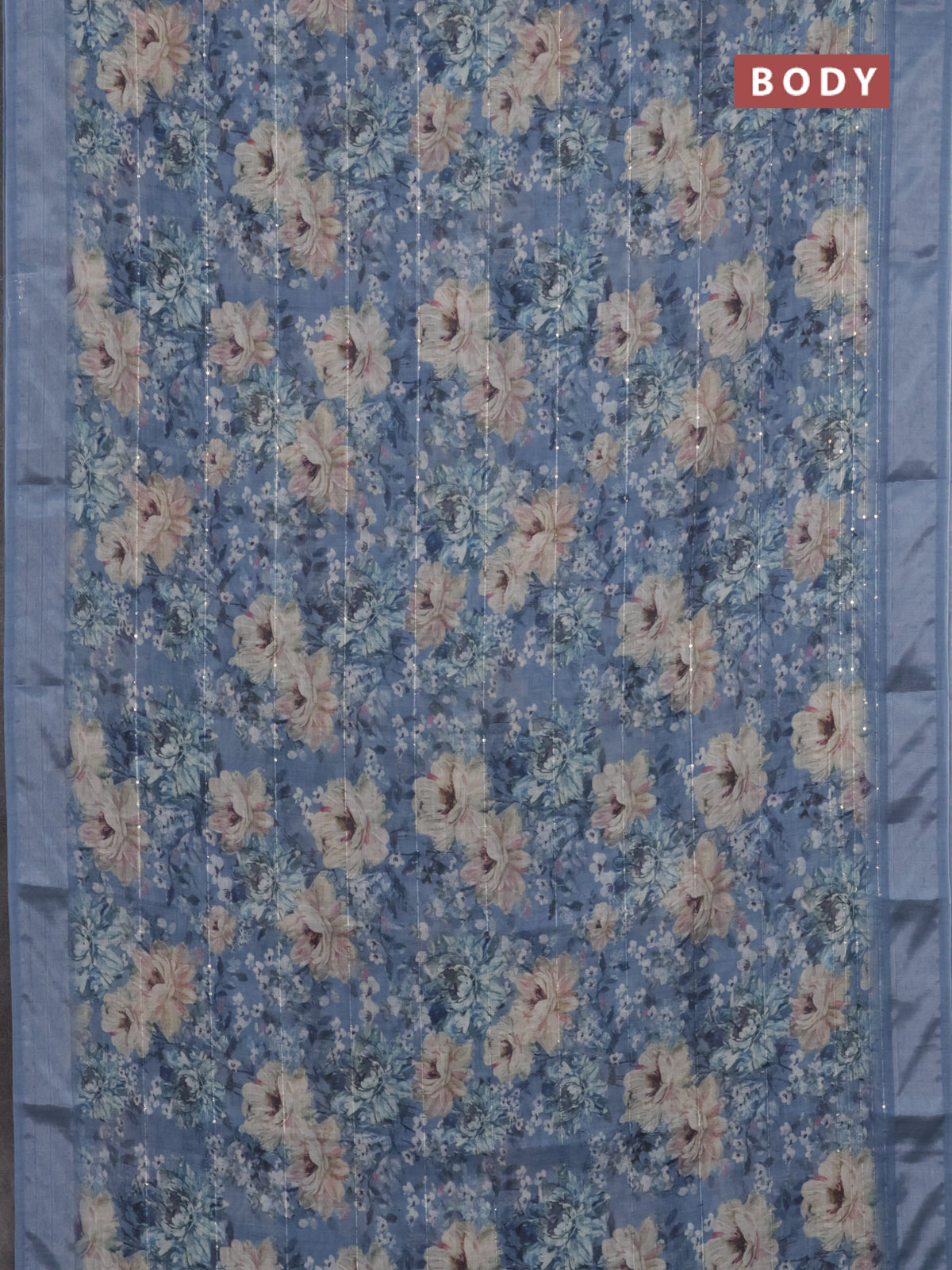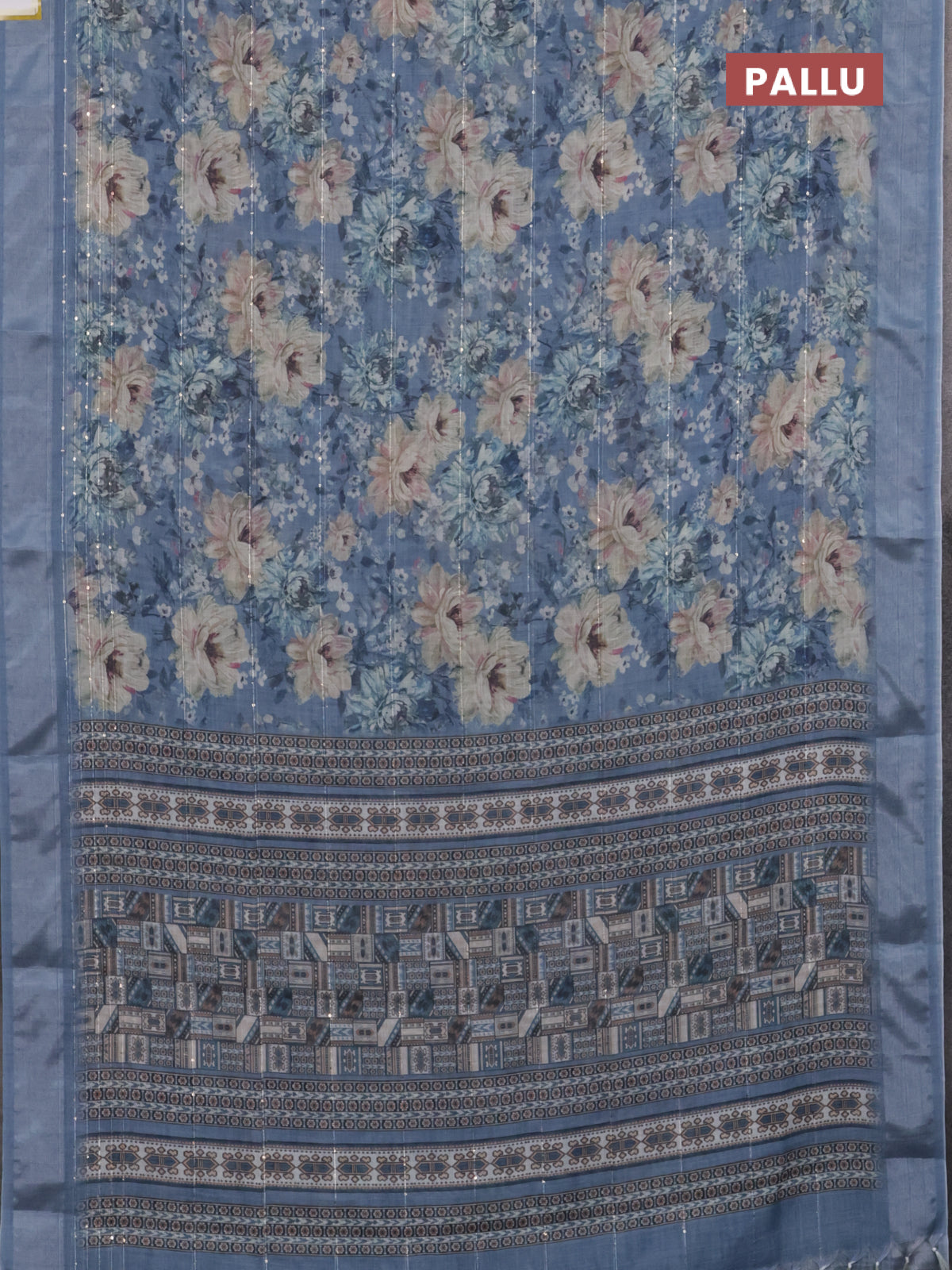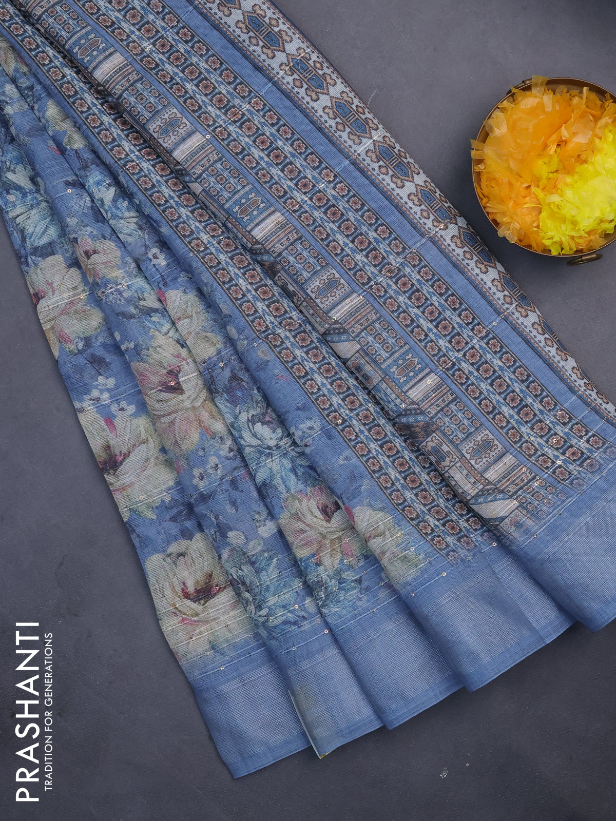 Linen cotton saree pastel blue with floral prints & sequin work and silver zari woven border
