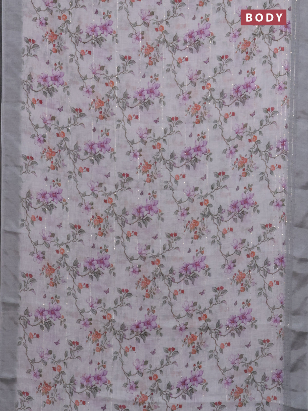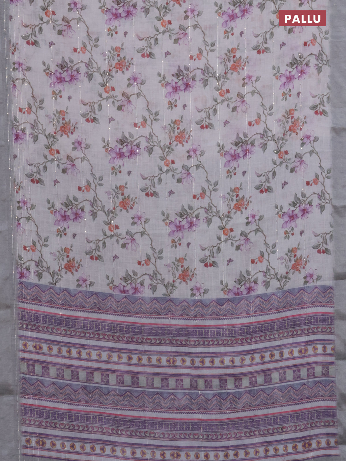 Linen cotton saree pastel grey with allover floral prints & sequin work and silver zari woven border