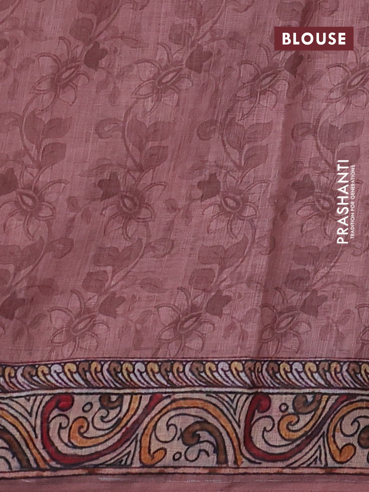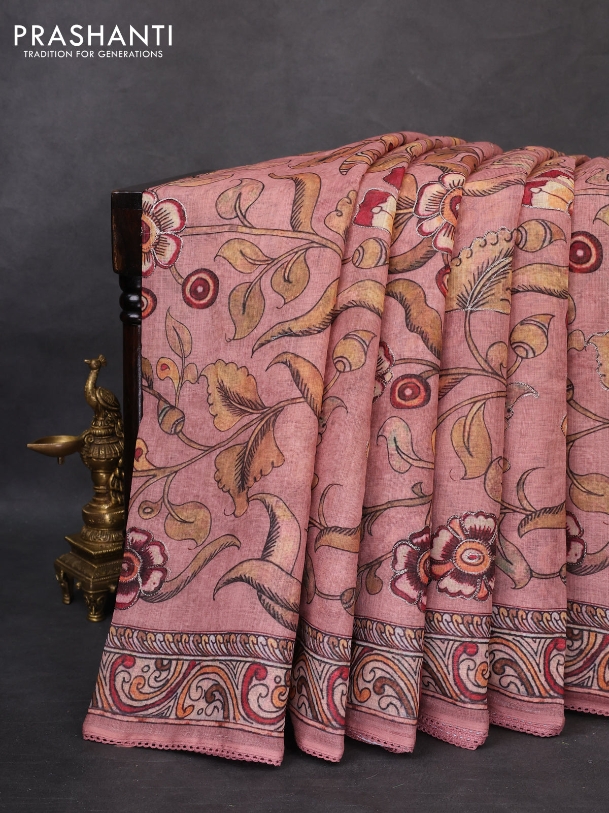 Linen cotton saree pastel peach with allover kalamkari prints & pita work and lace work border