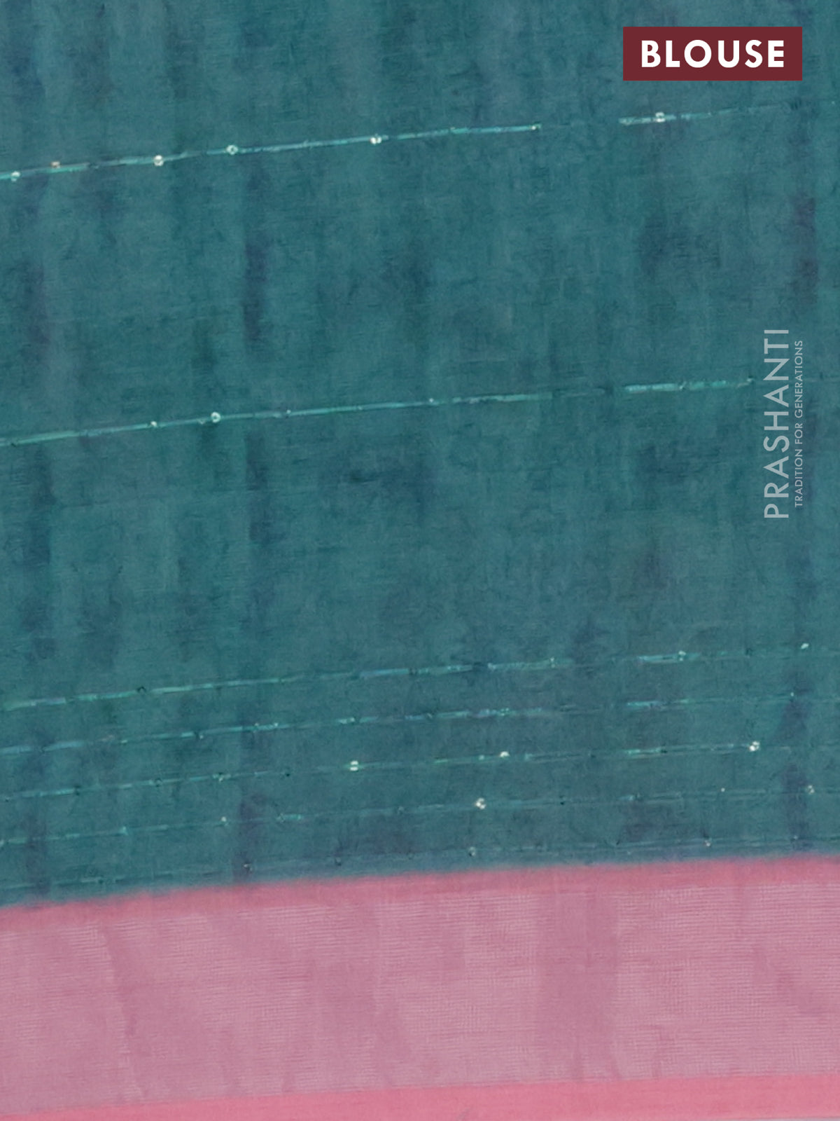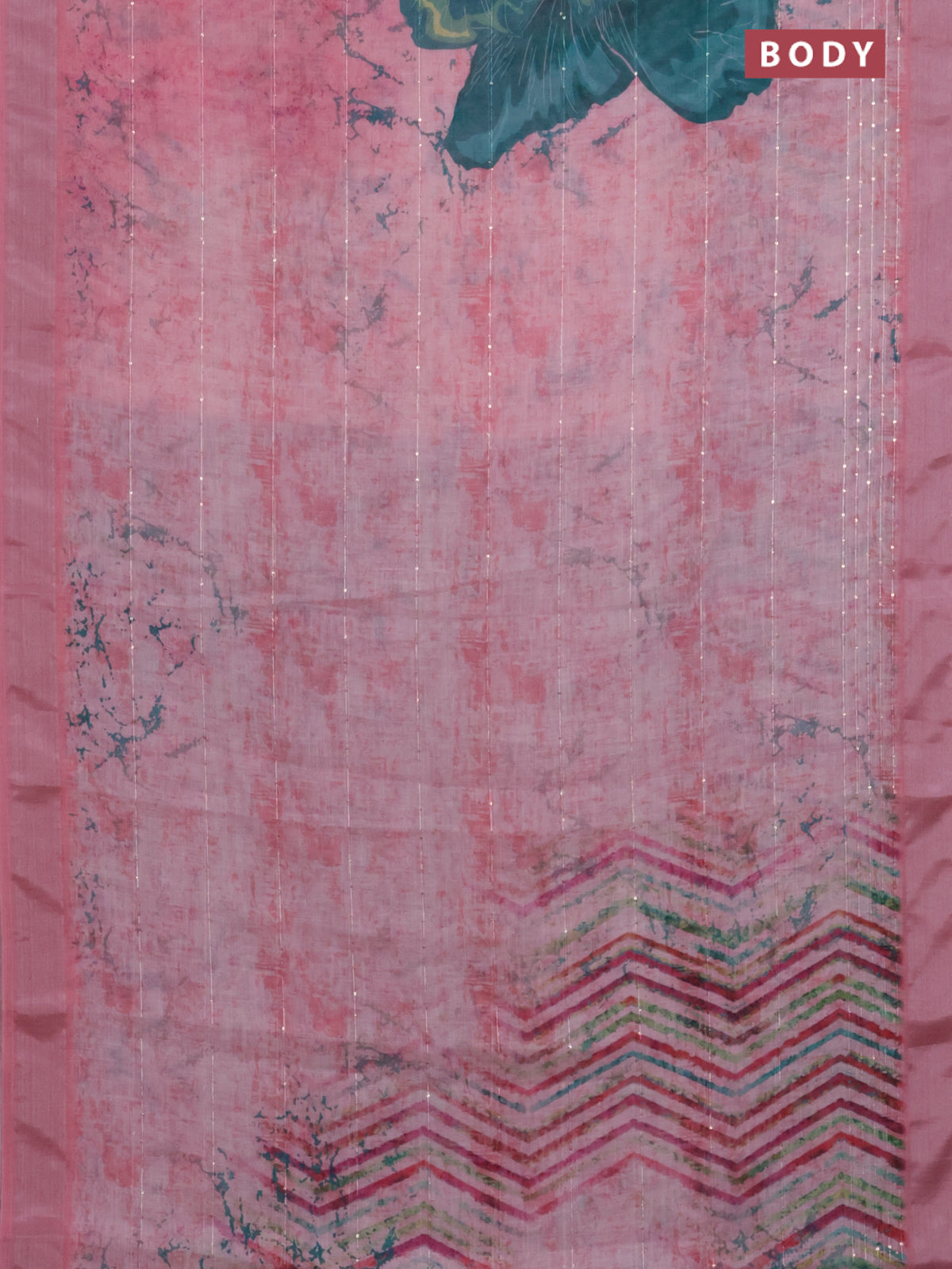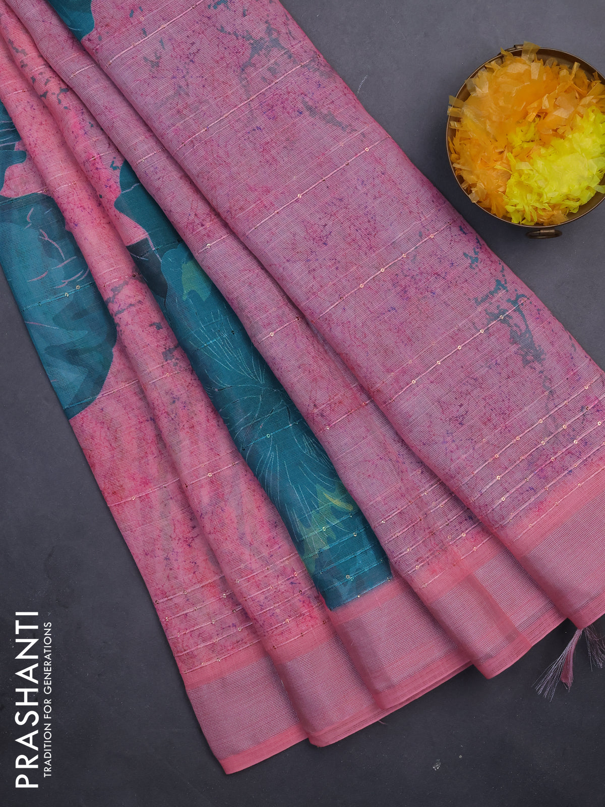 Linen cotton saree peach pink with allover prints & sequin work and silver zari woven border