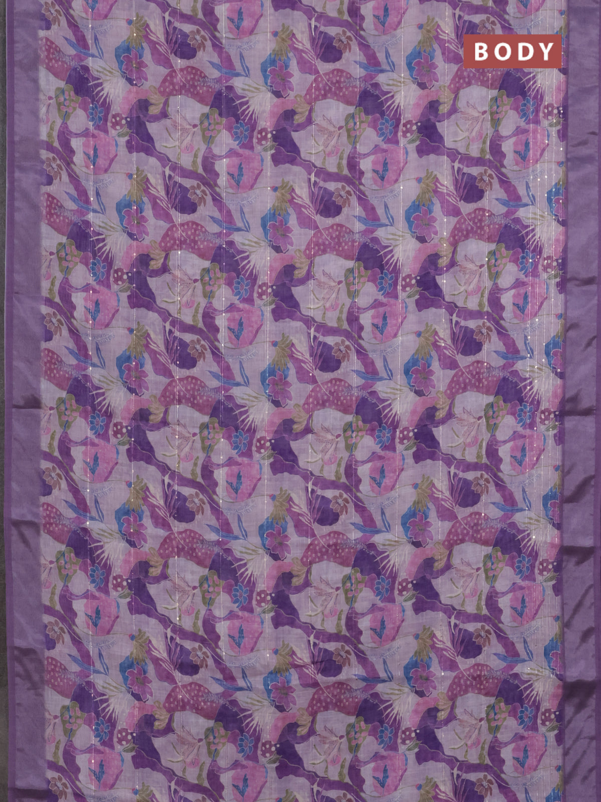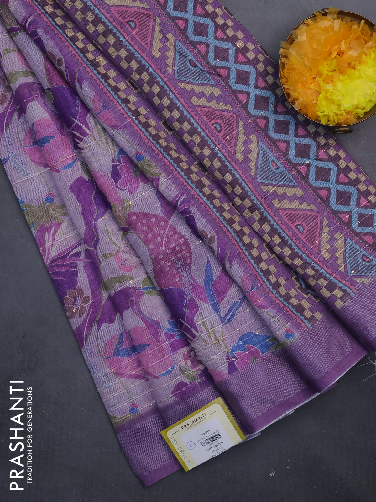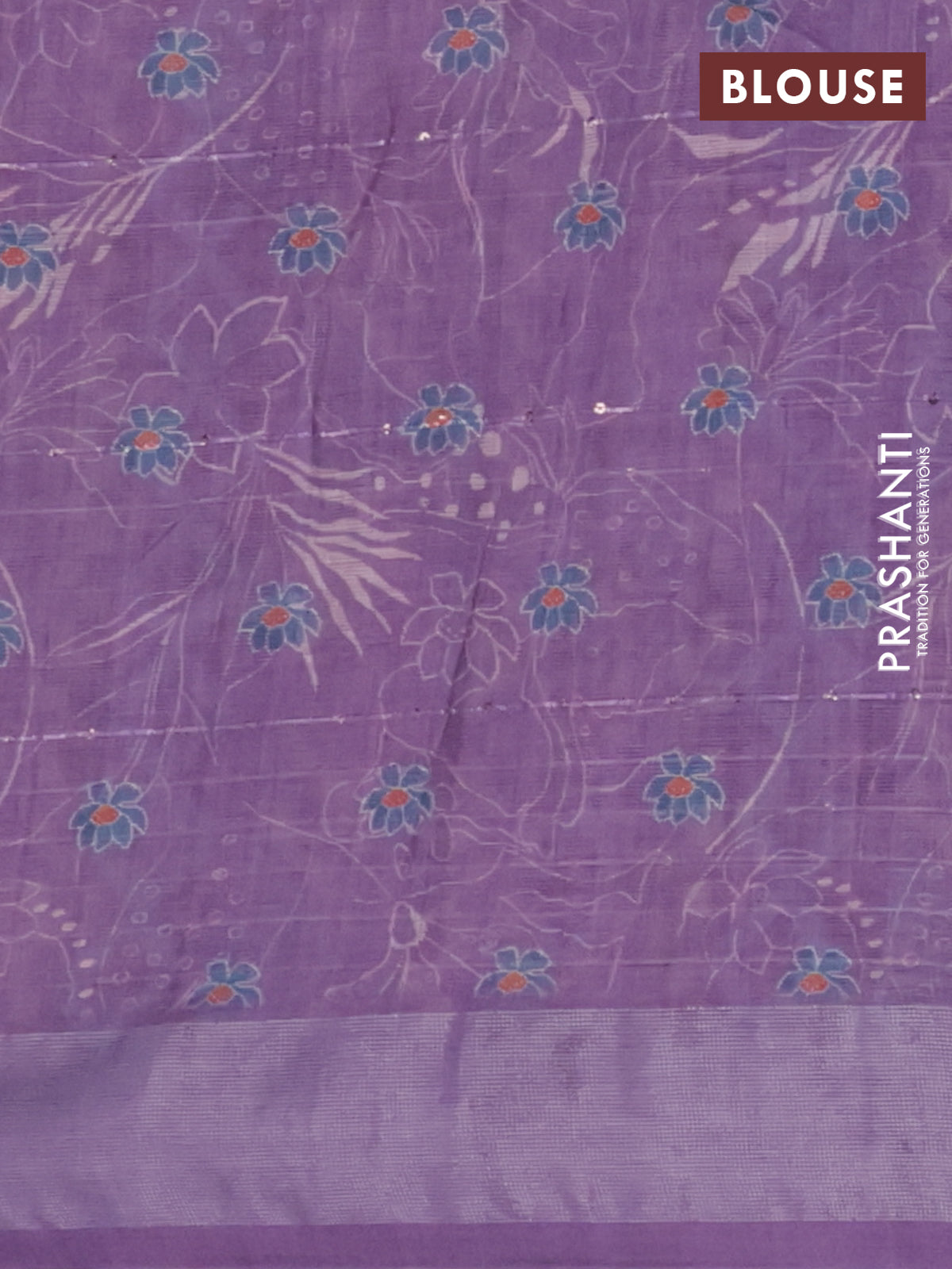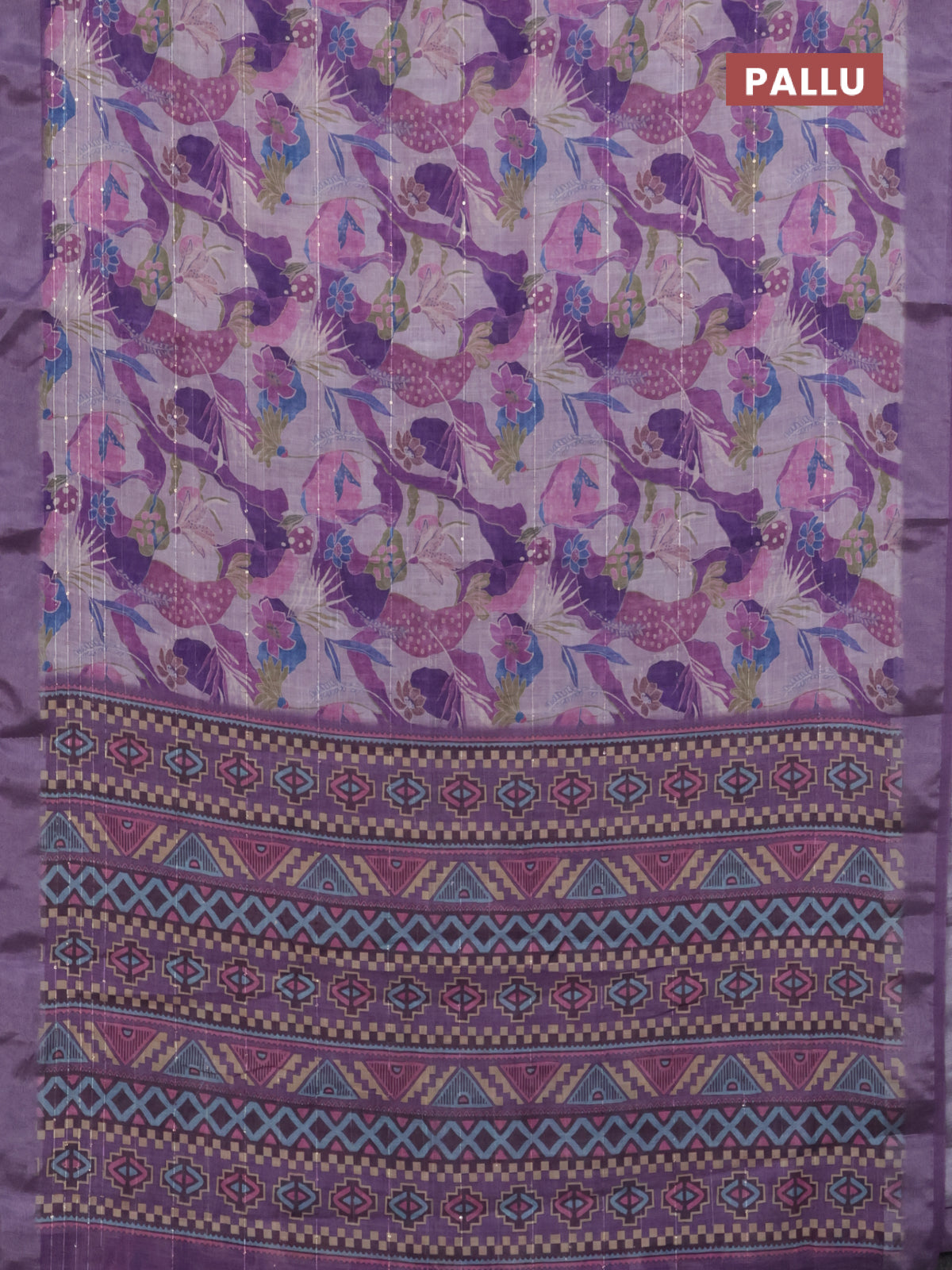 Linen cotton saree purple shade with allover floral prints & sequin work and silver zari woven border