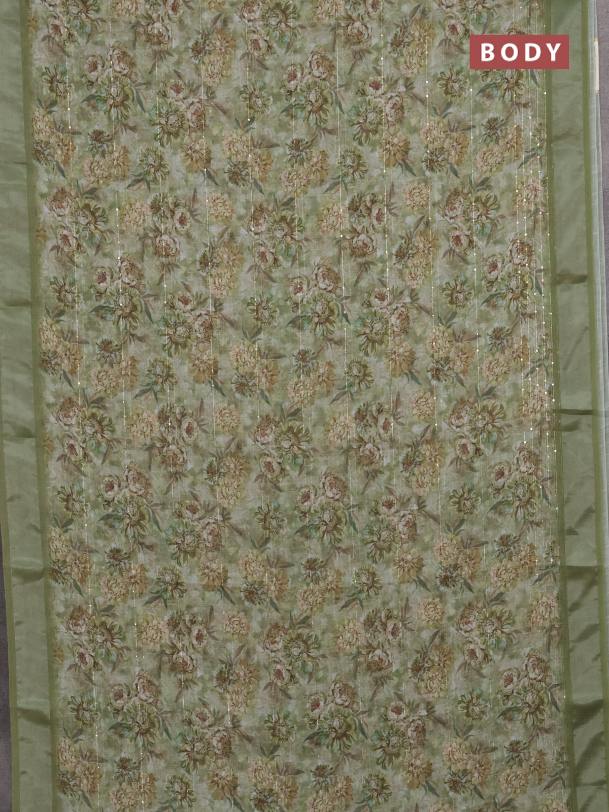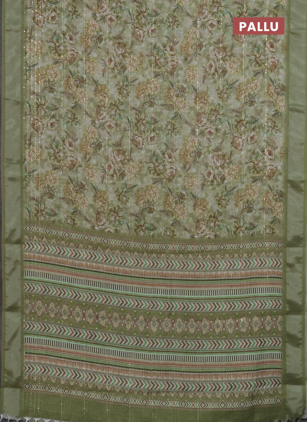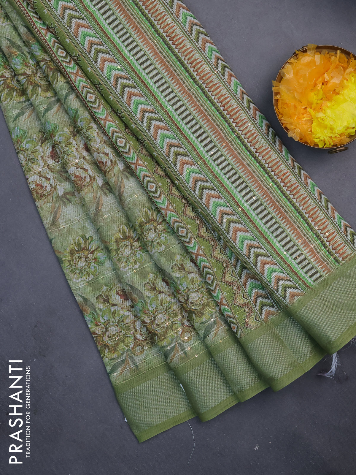 Linen cotton saree sap green with floral prints & sequin work and silver zari woven border