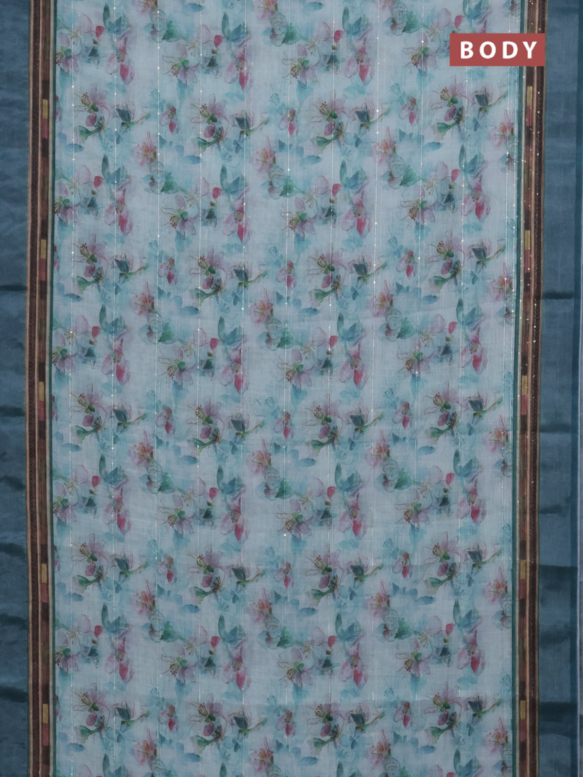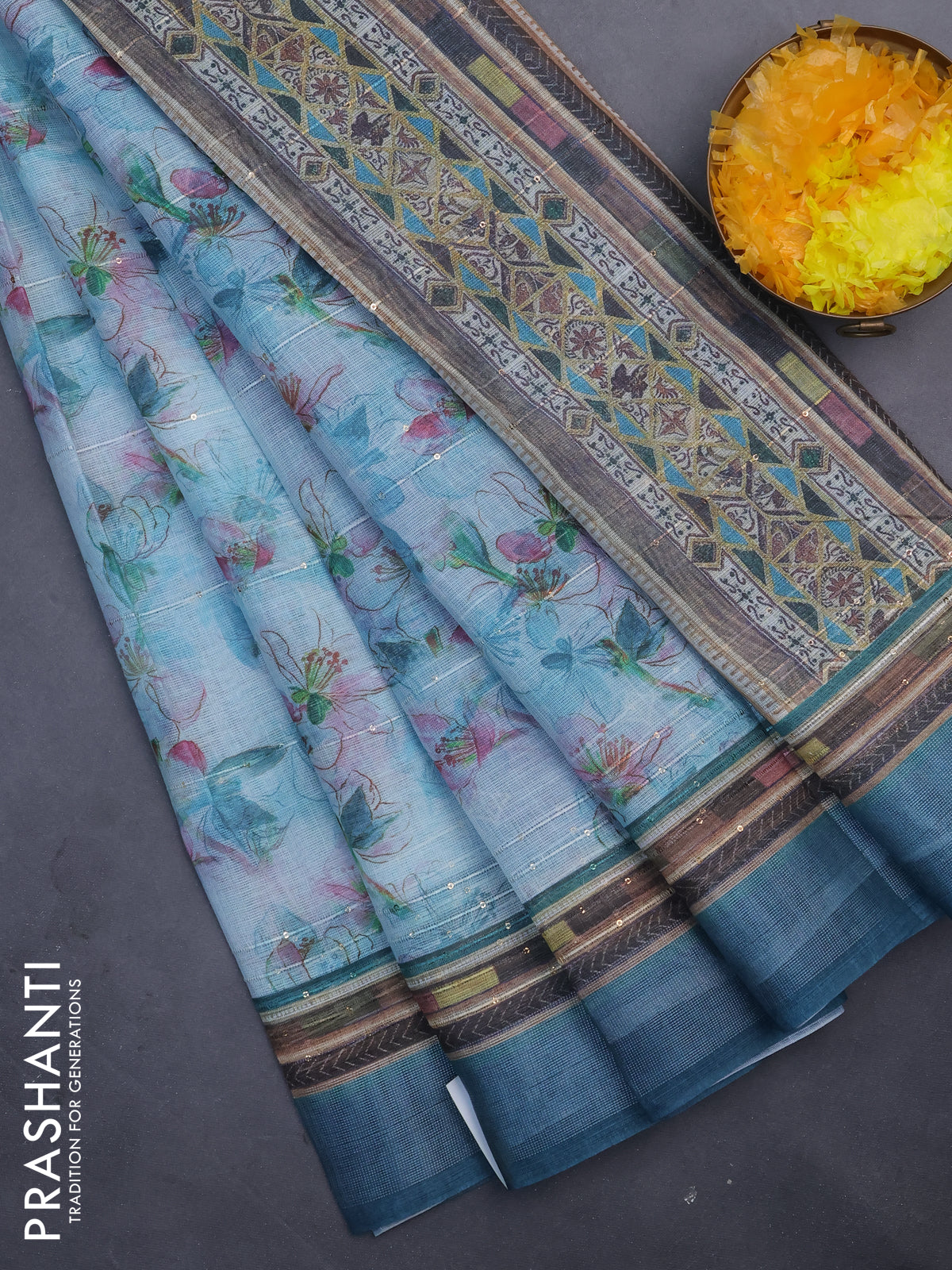 Linen cotton saree teal blue with allover floral prints & sequin work and silver zari woven border