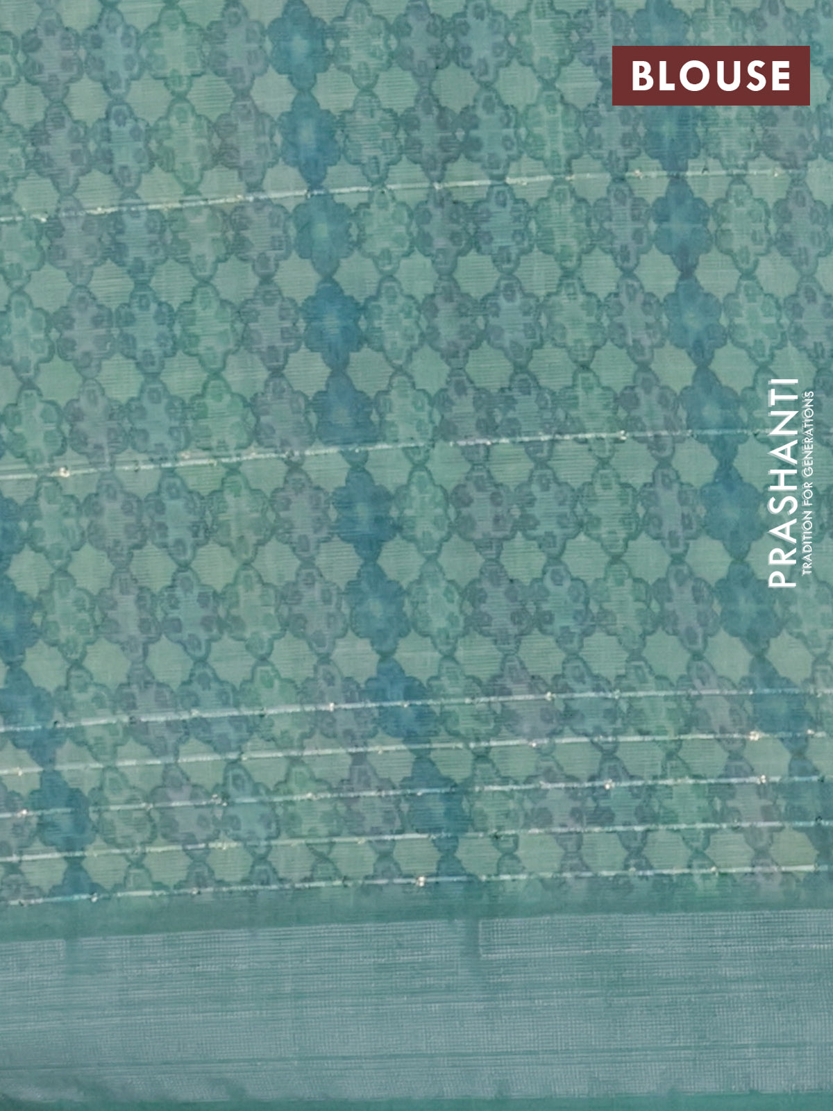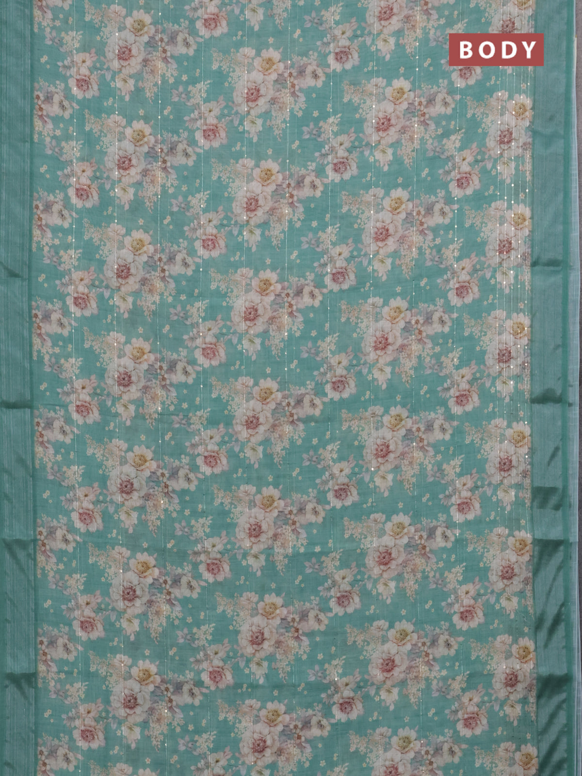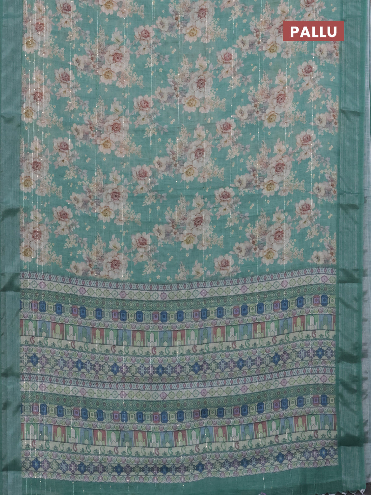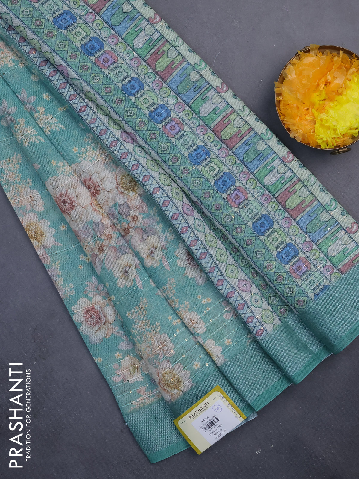 Linen cotton saree teal green with floral prints & sequin work and silver zari woven border