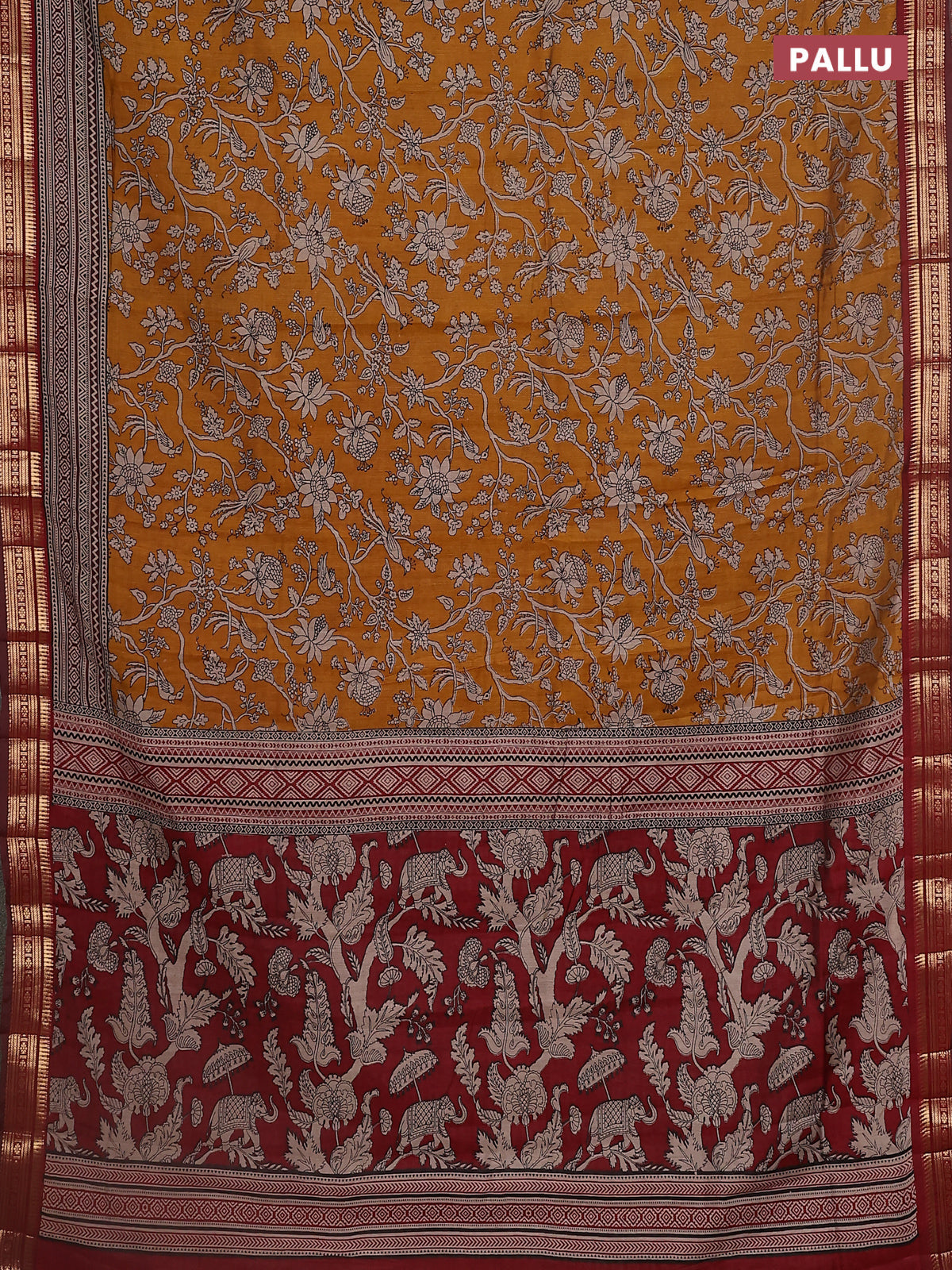 Maheshwari cotton saree mustard yellow and maroon with kalamkari prints and zari woven border