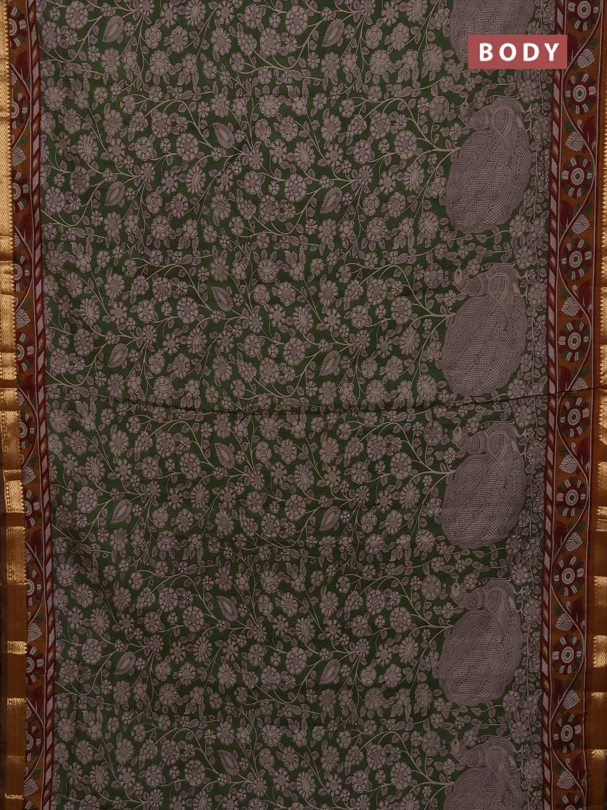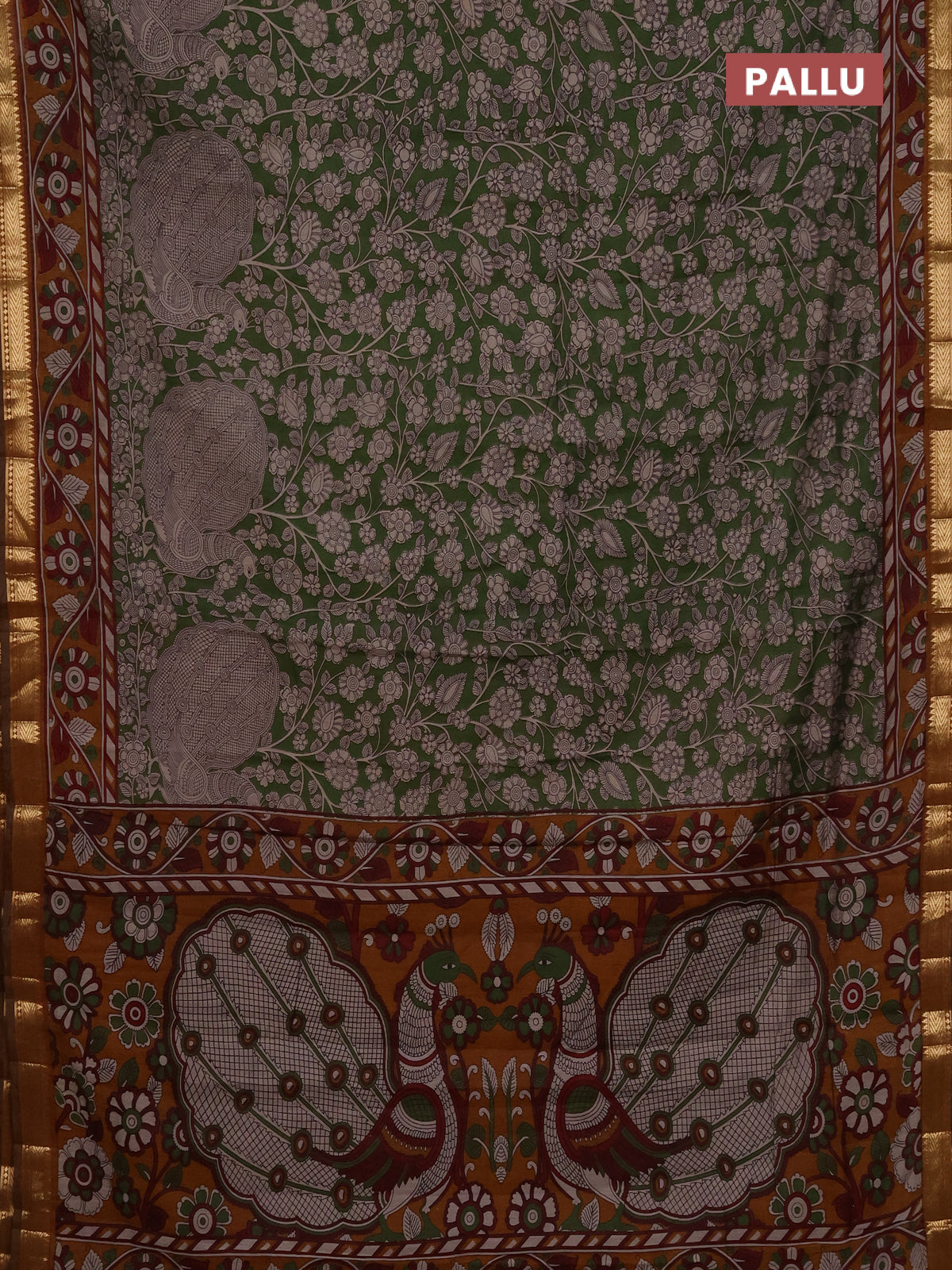 Maheshwari cotton saree sap green and coffee brown with allover flower prints and zari woven border