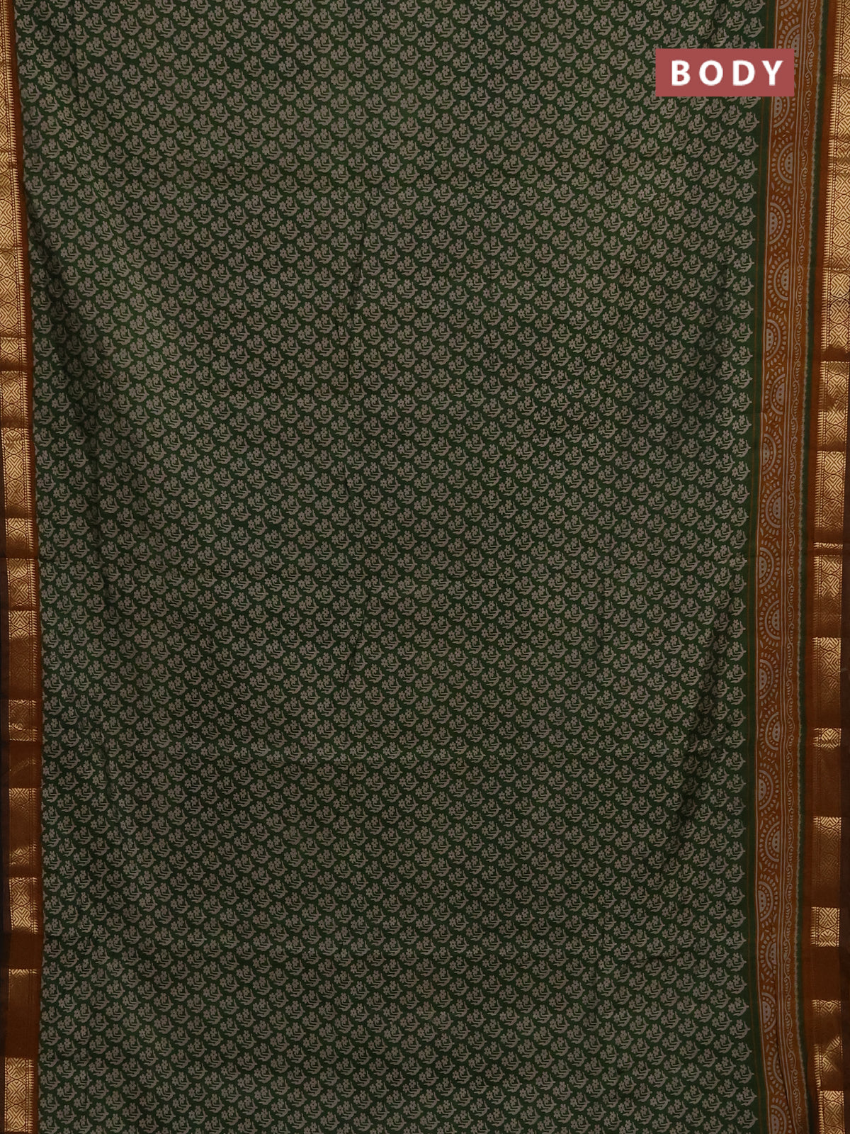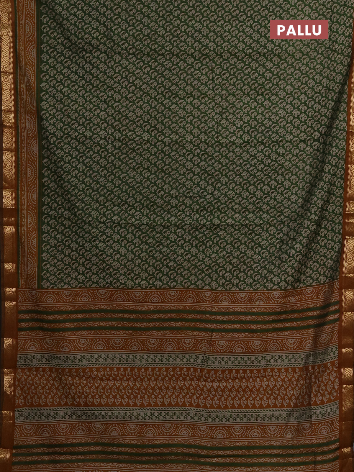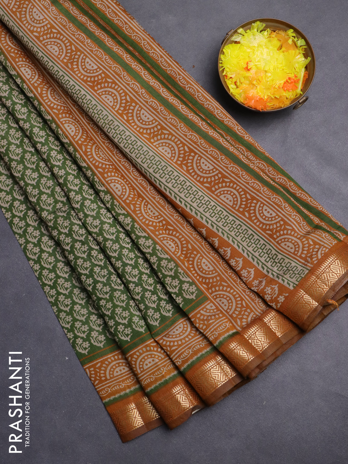 Maheshwari cotton saree sap green and dark mustard with allover flower prints and zari woven border