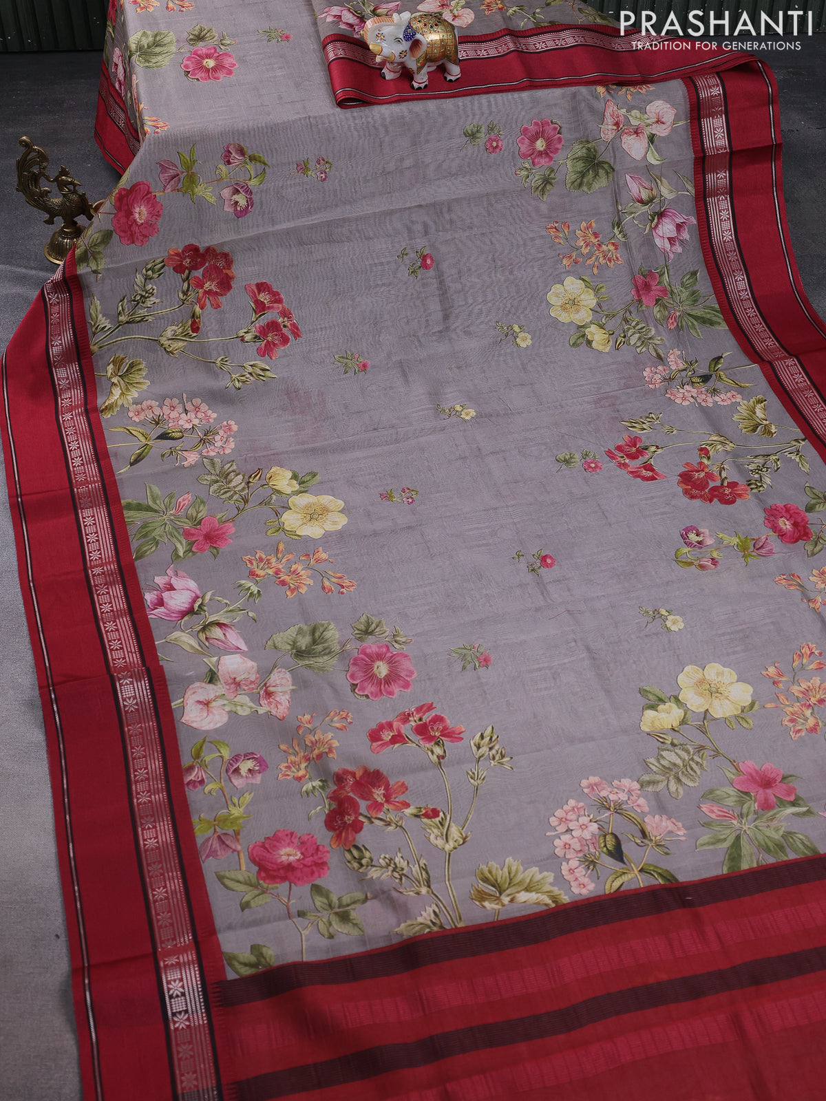 Maheshwari silk cotton saree grey and maroon with allover floral digital prints and rettapet thread woven border