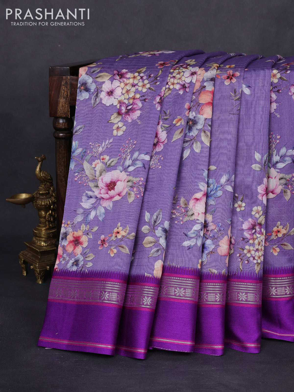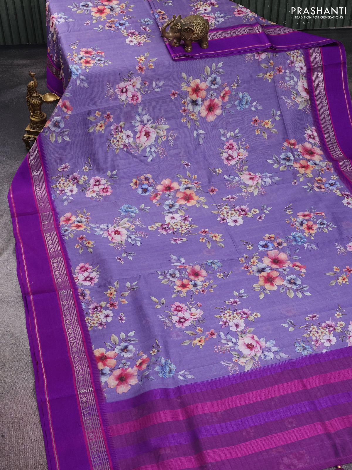 Maheshwari silk cotton saree lavender and purple with allover floral digital prints and rettapet thread woven border