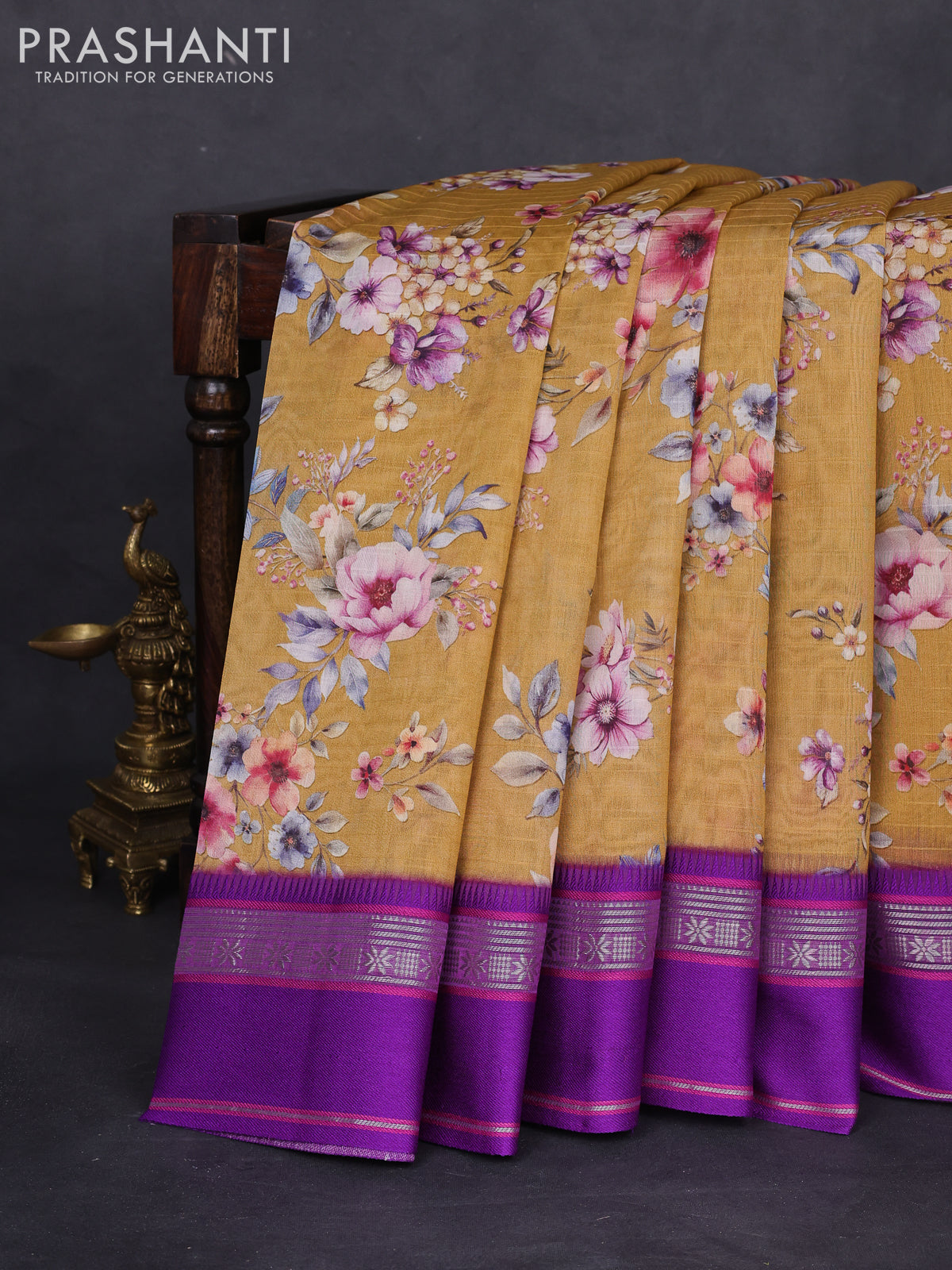 Maheshwari silk cotton saree mustard yellow and purple with allover floral digital prints and rettapet thread woven border