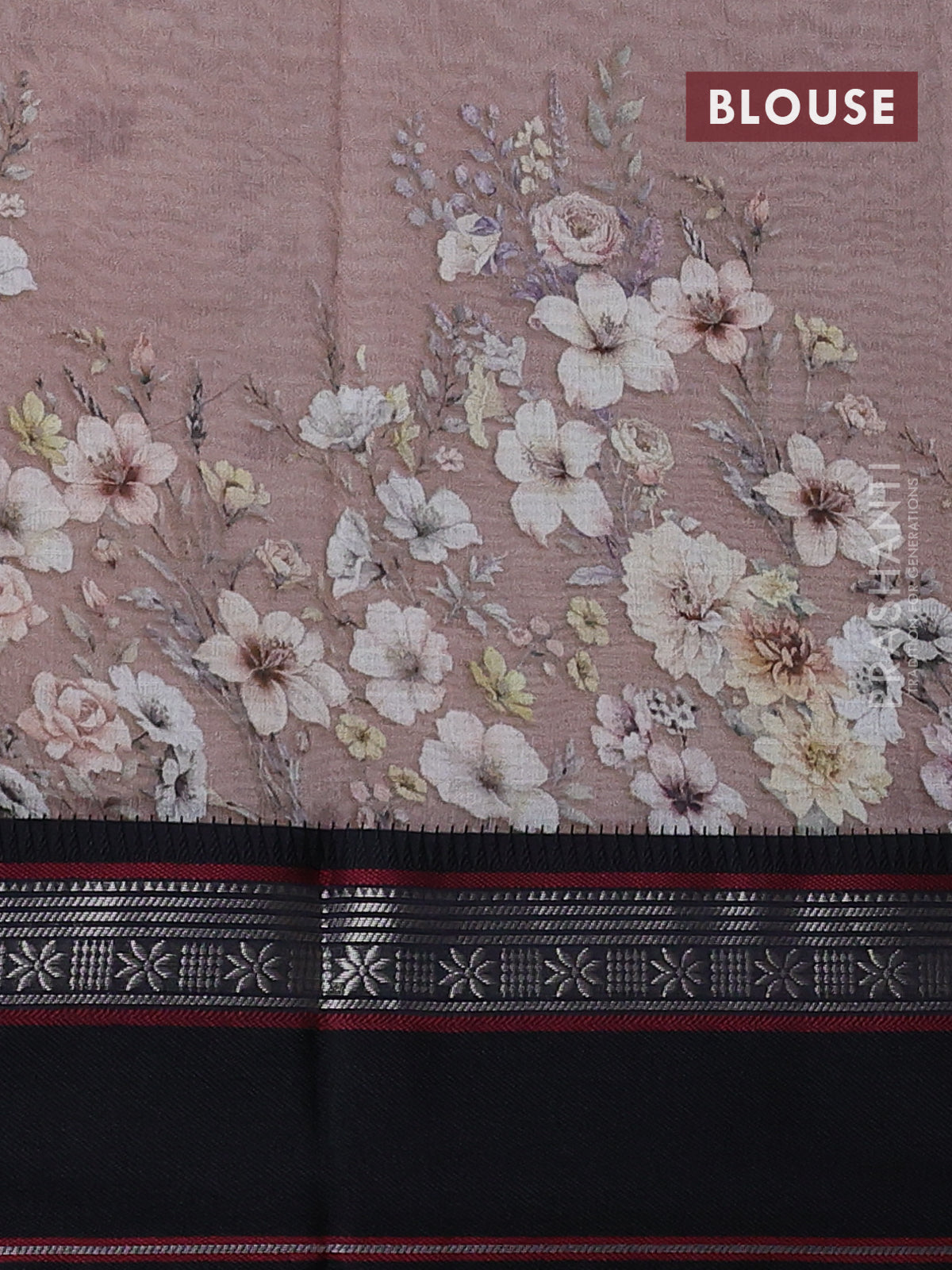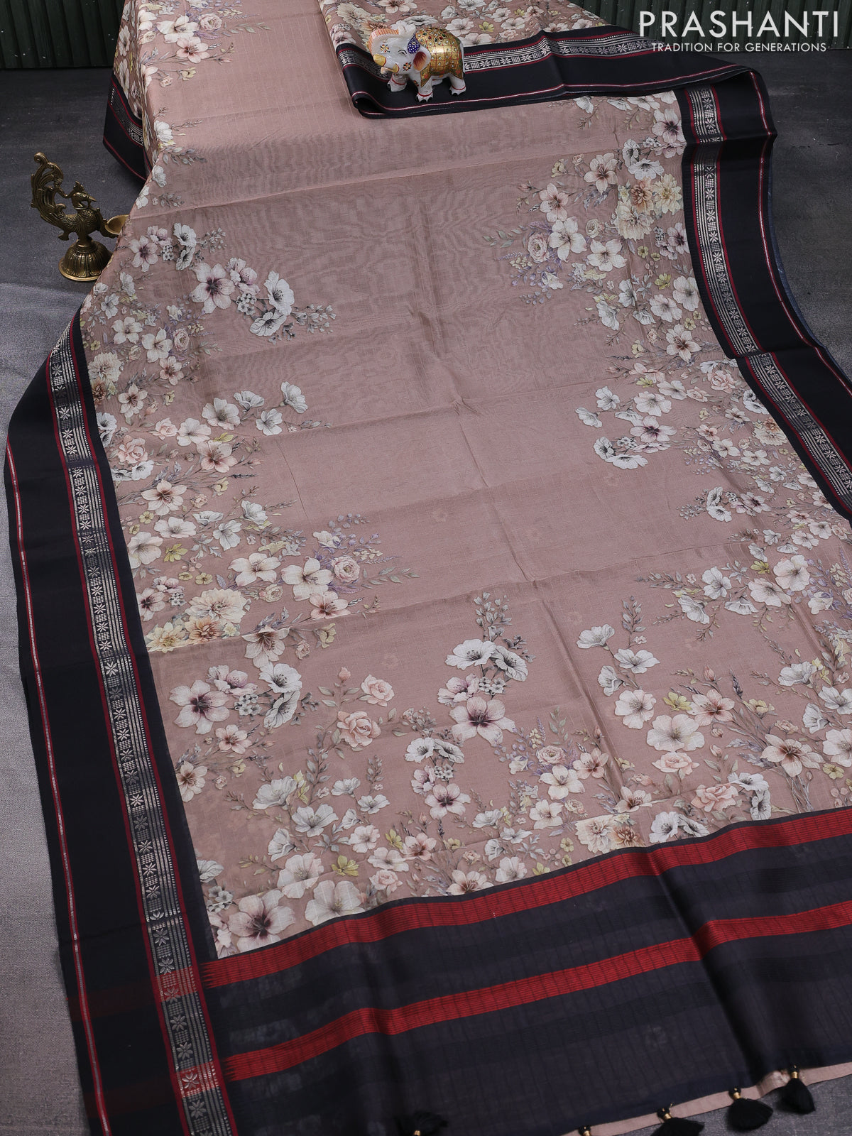 Maheshwari silk cotton saree pastel brown and black with allover floral digital prints and rettapet thread woven border