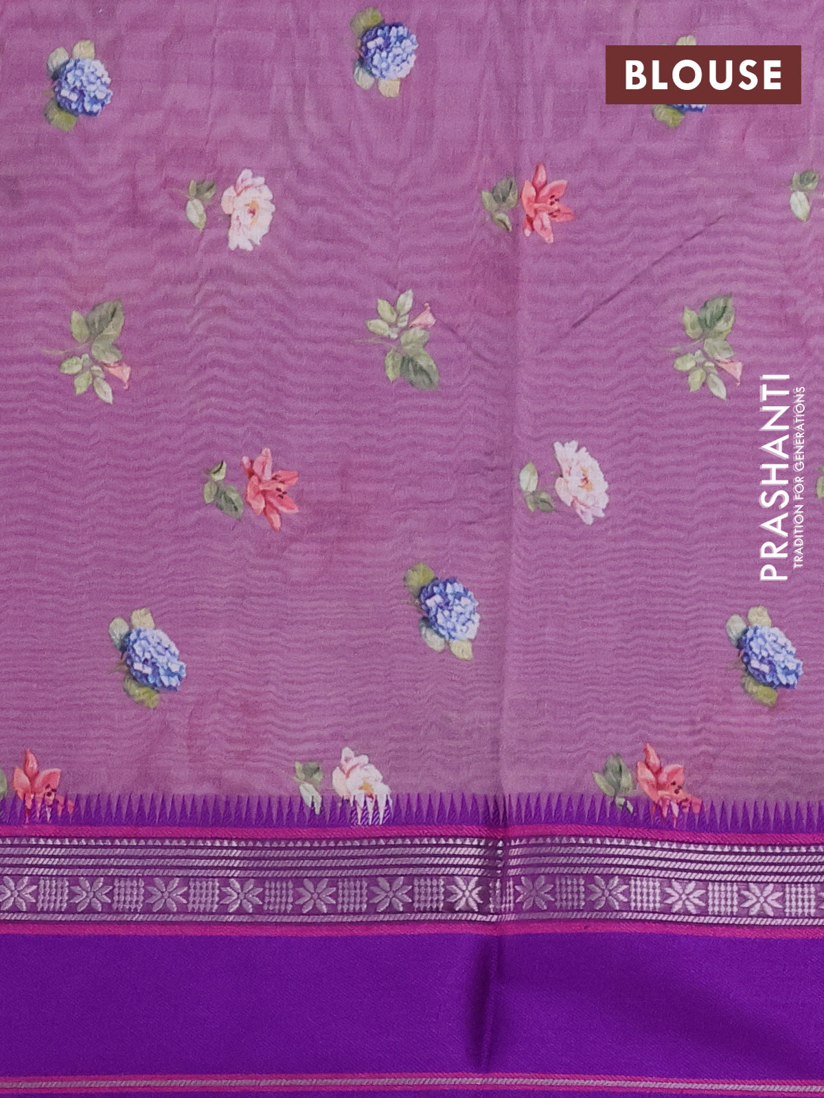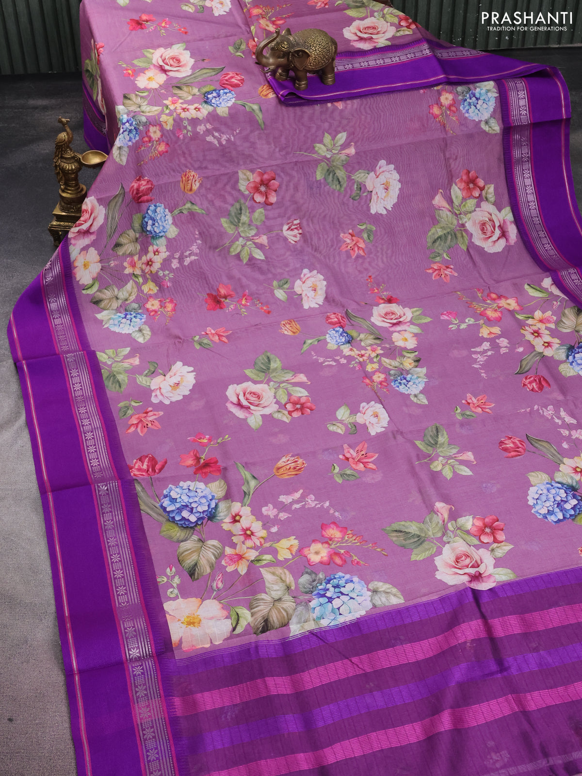 Maheshwari silk cotton saree pastel purple and purple with allover floral digital prints and rettapet thread woven border