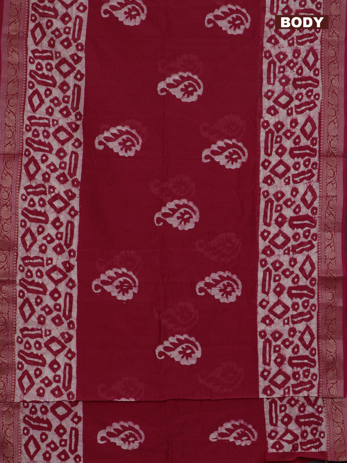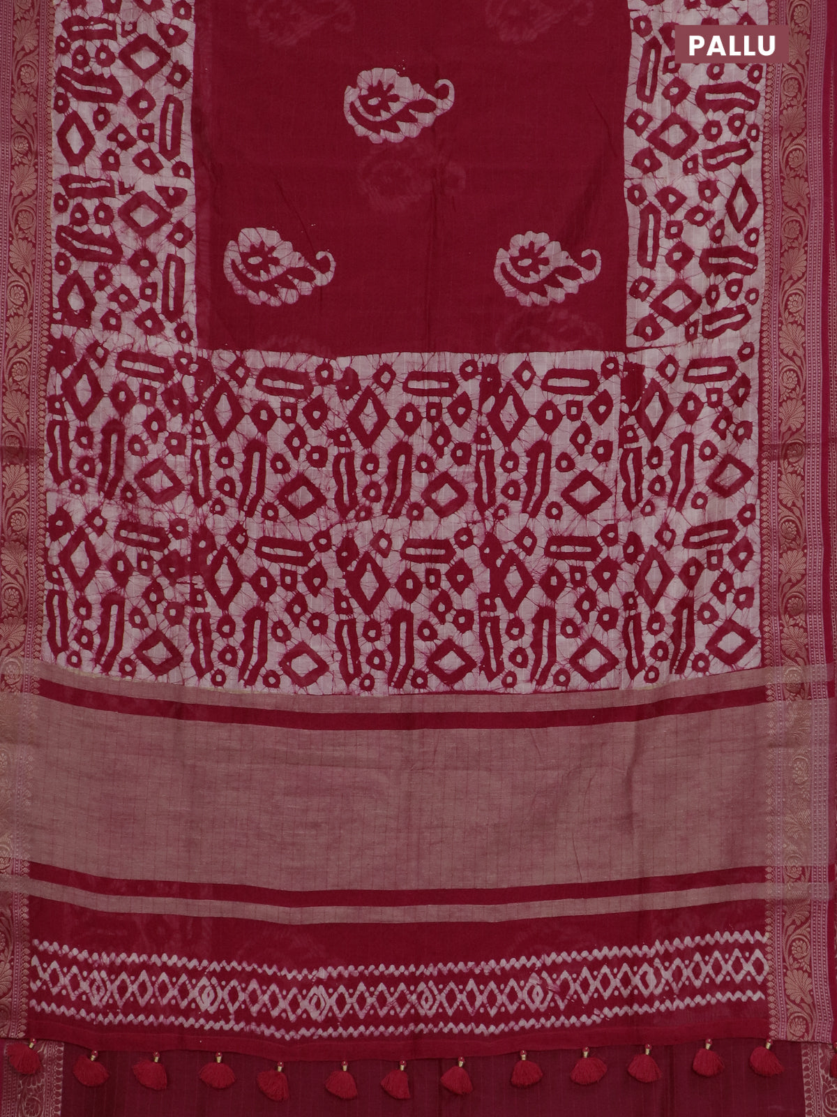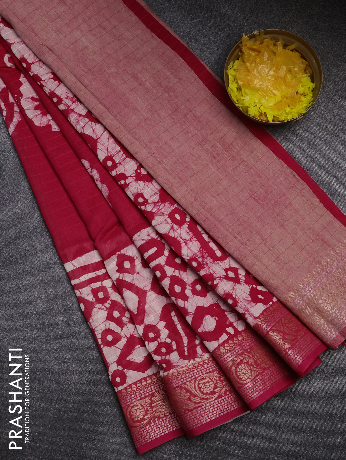 Maheshwari silk cotton saree pink with batik prints and zari woven border