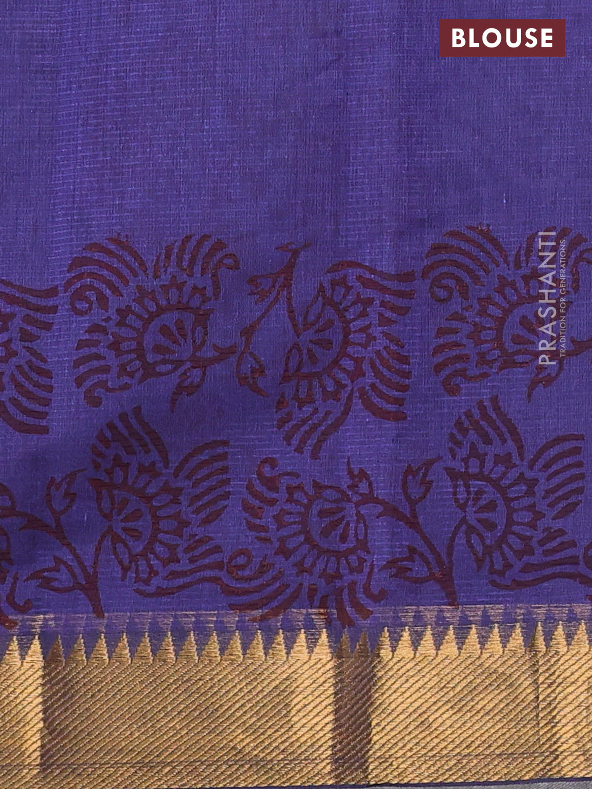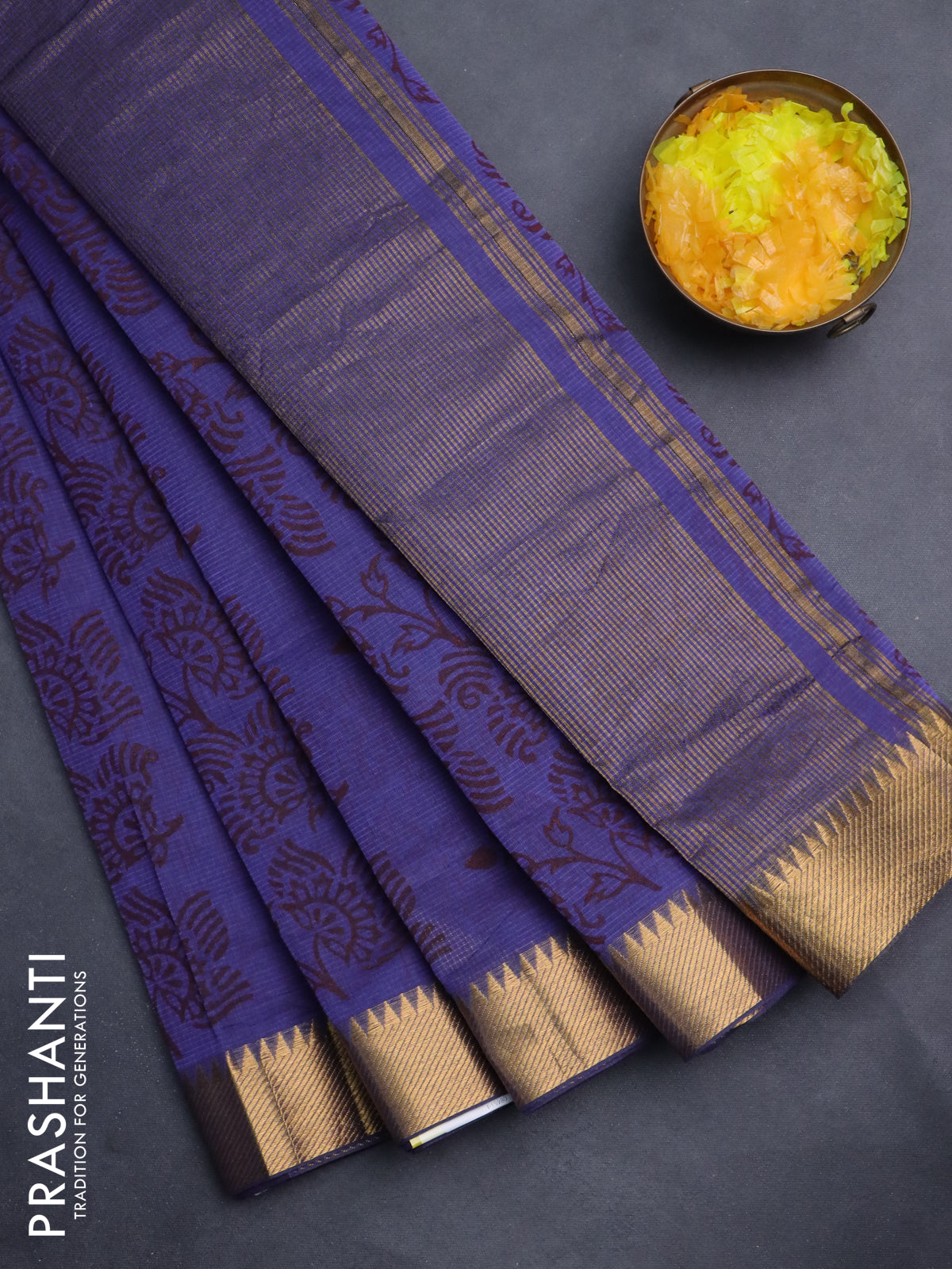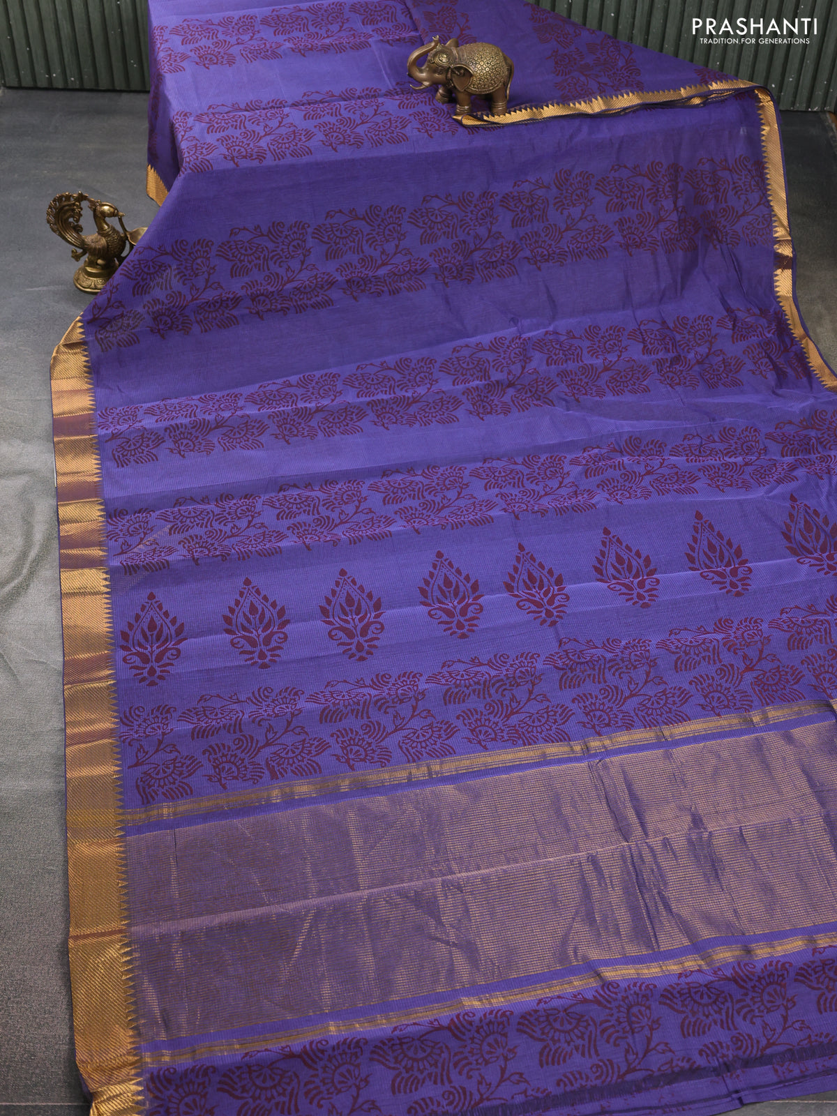 Mangalgiri cotton block printed saree violet with allover prints and zari woven border