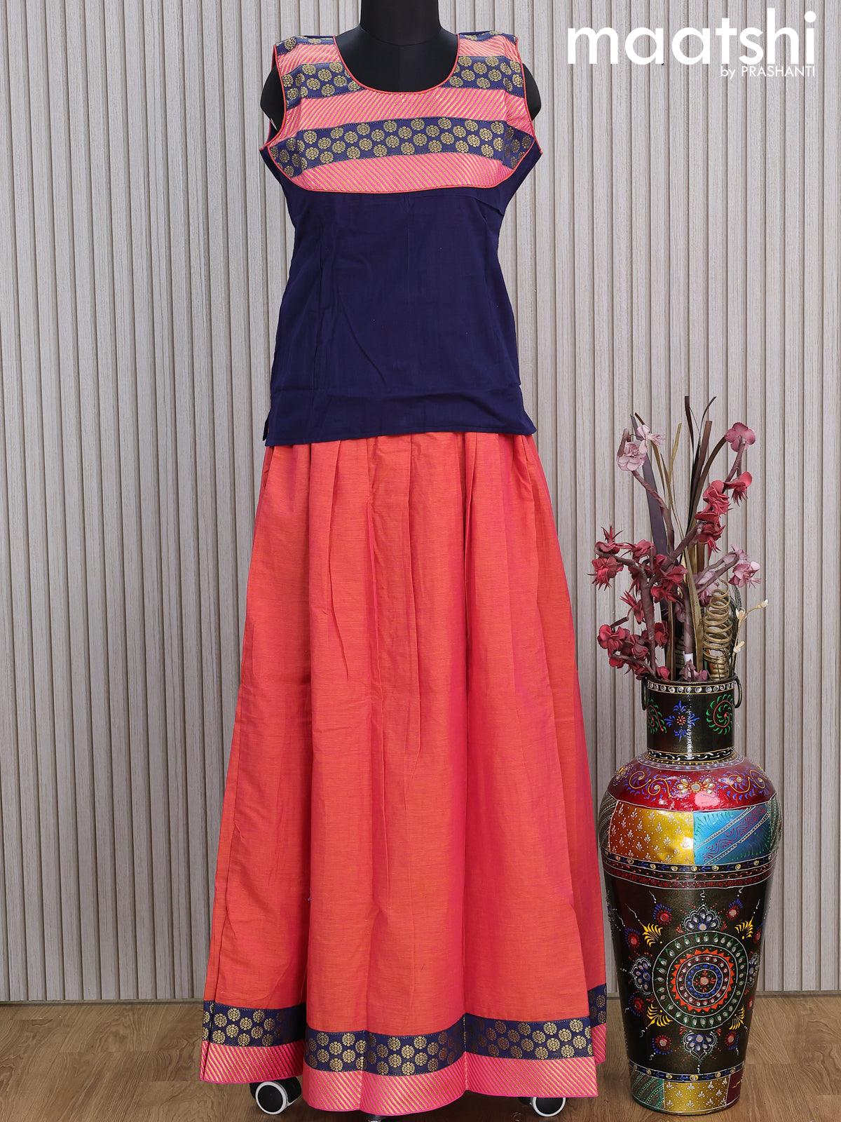 Mangalgiri cotton kids lehenga dark navy blue and dual shade of pink with patch work neck pattern and zari woven border Sleeve attached