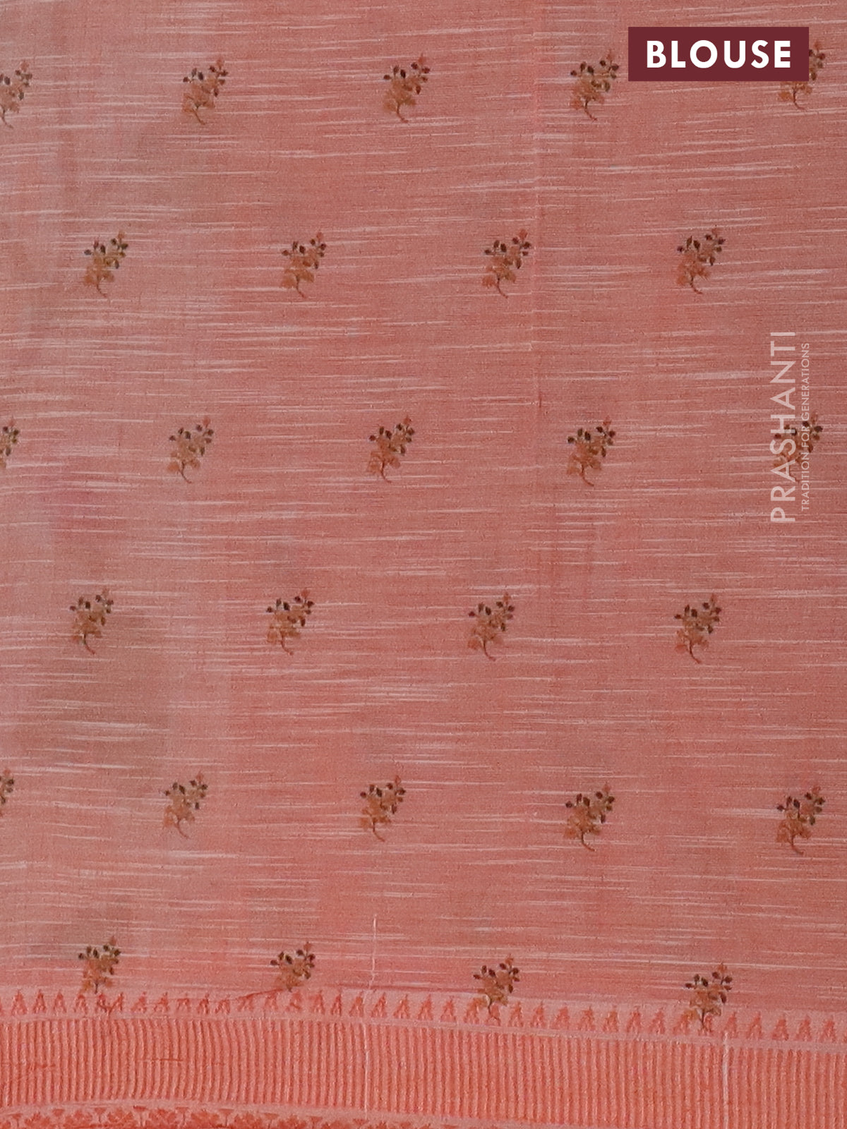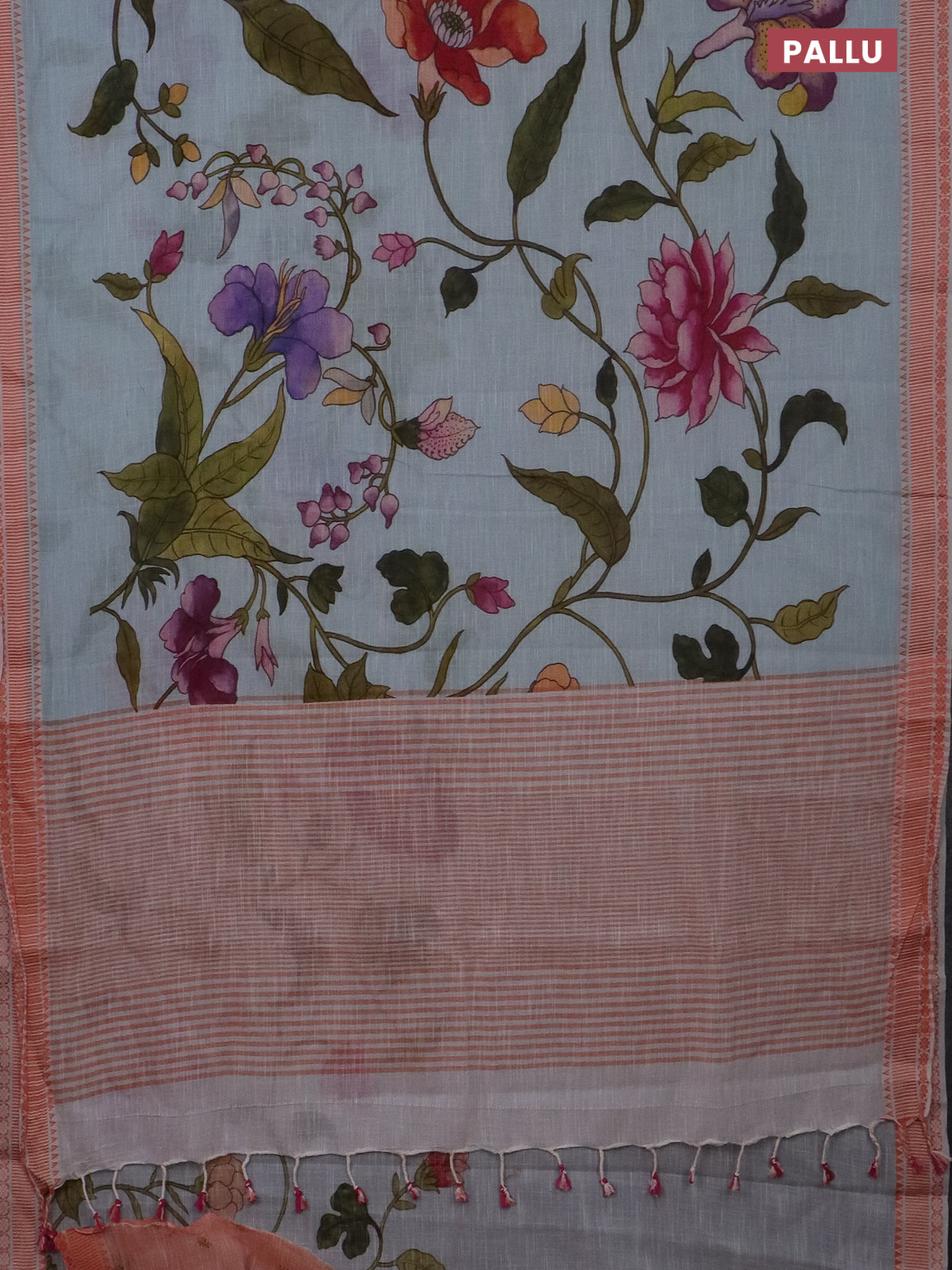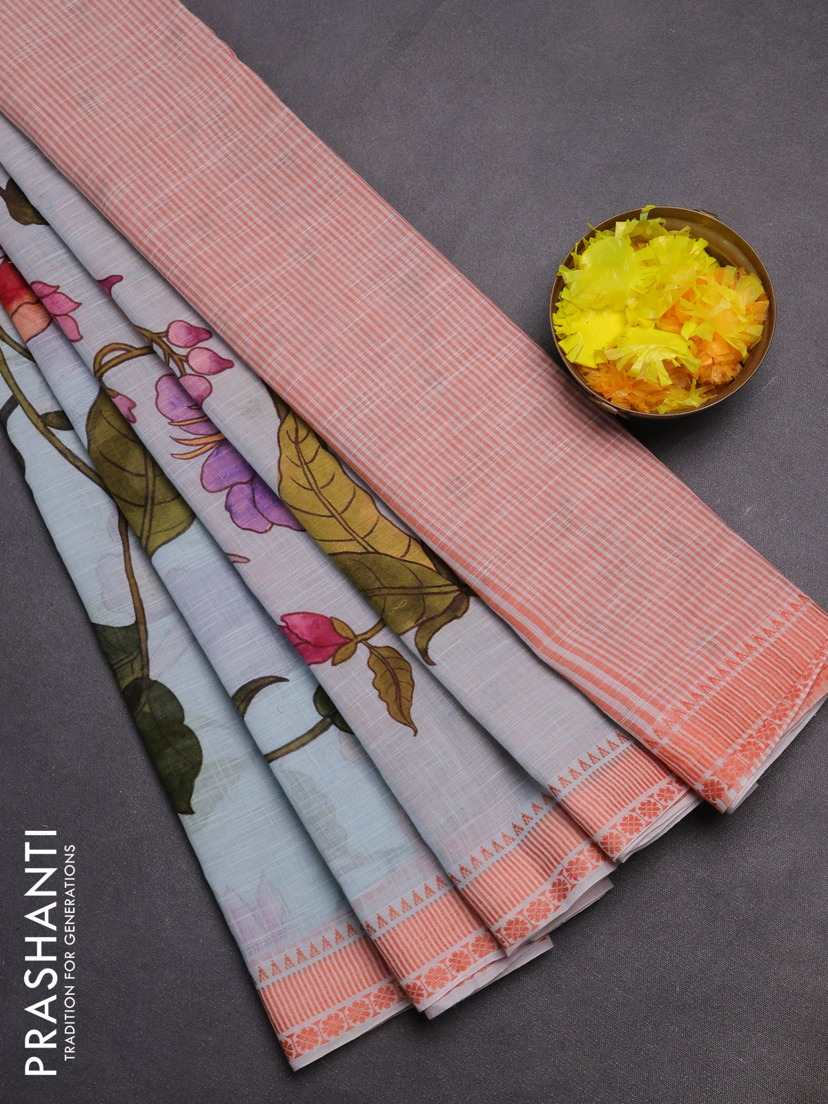 Mangalgiri cotton saree pastel blue and orange with allover floral prints and thread woven border
