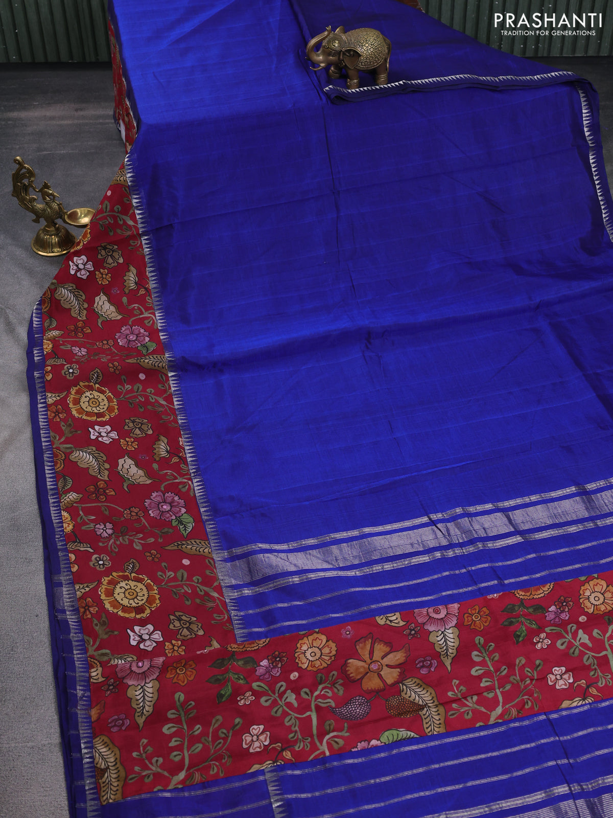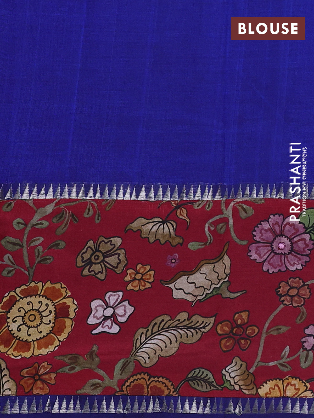 Mangalgiri silk cotton saree blue and maroon with plain body and temple design kalamkari printed applique border